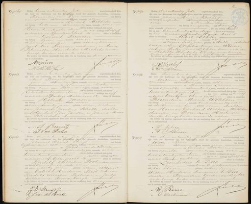 B.Vn Em 1. Pee H Methofer No. 4870 Heden drie entwintig Juli negentienhonderd drie, zijn voor ons Ambtenaar van den burgerlijken stand der gemeente Amsterdam, verschenen: Johannes Henricus / Kerkhof van beroep aanspreker ouzevenentwintig jaren, wonende en Franciscus Spaan alhier van beroep aanspreker oud drie envijftig jaren, wonende alhier -, die ons hebben verklaard dat op den Een entwintigsten dezer, des voormiddags ten zes ure inhethuis Jacob van Campenstraat s alhier is overleden Aldert Dekker. — van beroep werkman, wonende alhier. oud negenen dertig jaren, geboren te Hollum op Ameland echtgenoot van Cornelia Anna van Weeren zoon van Pieter Jans Dekker boeren arbeider en Hebeltje Hendriks Visser zonder beroep, beiden wonende te Hollum op Aneland En hebben wij hiervan opgemaakt deze akte, die na voorlezing door de aangevers en ons is onderteekend. 2 J.H. Kerkhof . . . . . . . in G J. Oltr „ No 4866 Heden drie en twintig Juli negentienhonderd drie zijn voor ons Ambtenaar van den burgerlijken stand der gemeente Amsterdam, verschenen: van beroep Aart Boogert geen oud tweeenzeventiaten, wonende alhier — en Johannes van Dalen — Oud eenenzeventiJaren, wonende alhier. van beroep geen ,die ons hebben verklaard, dat op den Eenentwintigsten dezer, des voor middags ten vijf ure inherhuis Plantage Middenlaan 52 alhier is Overleden Helena Jansen van beroep geen, wonende alhier oud vierenzeventig jaren, geboren alhier; weduwe van Johannes Jacobus Schotte; dochter van Hendrik Jan Jansen, en Joanna Maria van Schiedam En hebben wij hiervan opgemaakt deze akte, die na voorlezing door de aangevers en ons is onderteekend. 1 ini A Booyert „ J Van Dalen. NNo 4872 Heden drie entwintig Juli10 negentienhonderd drie, zijn voor ons Ambtenaar van den hurgerlijken stand der Gemeente Amsterdam, verschenen Willem Rijkers opzichter oud achtendertig jaren, wonende alhier dd en Franciscus Leeners van beroep opzichter oud zevenentwintig jaren, wonende alhier des middags ten twaalf twee entwintigsten dezer afe ons hebben verklaard, dat op den ure in het Onze Lieve Vrouwe gasthuis alhier is overleden „ Berendina Maria Wohlken van beroepgeen, wonende Vrolikstraat 129 alhier oud dertien maanden, geboren, alhier; dachter van Herman Gerhard Wilhelm Wohlken slucadoor; en Berendina Hartman zon der beroep, beiden wonende alhier En hebben wij hiervan opgemaakt deze akte, die na voorlezing door de aangever en