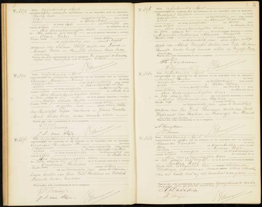 No. 2672 Heden vijfentwintig April negentienhonderd tien verschenen voor mij Ambtenaar van den burgerlijken stand van Amsterdam: Hartog Sarlie van beroep bode oud negenenveertig jaren, wonende alhier en Partog Maun oud vierenvijftig jaren. van beroep bade die verklaarden, dat op wonende alhier den drie entwintigsten dezer des Na middags ten half twaal ure in de gemeente Amsterdam is overleden — Clara Keizer , wonende alhier zonder beroep oud vijfentachtig jaren, geboren te Meppel weduwe van Salomon Wolff dochter van David- Mannes Keizer en Henriete Salomon Levie beiden overleden Waarvan akte, welke overeenkomstig de wet is voorgelezen. De aangevers verklaarden wegens hun Paaschfeest niet te mogen teekenen Adomogmneu No. 2678 Heden vijfentwintig April negentienhonderd tien verschenen voor mij Ambtenaar van den burgerlijken stand van Amsterdam van beroep Rndolphus Leidner aanshilker oud zesenzestig jaren, wonende alhier en Adrianus Wismuller van beroep aanspieker oud zestig jaren, wonende alhier die verklaarden, dat op den vierentwintigsten dezer des voor middags ten kes ure in de gemeente Amsterdam is overleden Marretje Catharina Adriana Teunisse zonder beroep, wonende alhier —oud twee endertig jaren, geboren alhier echtge„ noote van Albert Knipper, dochter van Pieter Christiaan Peunisse zonder beroep wonende alhier en Trijntje Boer overleden Waarvan akte, welke overeenkomstig de wet is voorgelezen. R. Leidner Ademis A Wijsmulli No 2674 Heden vijfentwintig April negentienhonderd tien verschenen voor mij Ambtenaar van den burgerlijken stand van Amsterdam Gerardus Hendricus Honing van beroep aanspilker oud negenenveertig jaren, wonende alhier en Joannes Alphoutus van Rijn van beroep aanspieker oud drieenvijftig jaren wonende alhier die verklaarden, dat op den drie entwintigsten dezer des voor, middags ten ll ure in de gemeente Amsterdam is overleden Neeltje Louisa Leijsse zonder beroep wonende alhier oud vijften jaren, geboren alhier dochter van Christoffel Feijsse werkman en Johanna Emerentia Mark, zonder beroep, beiden wonende alhier- Waarvan akte, welke overeenkomstig de wet is voorgelezen. Jdom HVKoning J A. van Rijn No. 2680 Heden vijfentwintig April negentienhonderd tien verschenen voor mij Ambtenaar van den burgerlijken stand van Amsterdam: Nicolaas Buyken van beroep oud achtendertig jaren, wonende aansbieker en Willem Tastma alhier van beroep aanspieker oud veertig jaren. wonende alhier die verklaarden, dat op den twee en twintigsten dezer des voor middags ten tien ure in de gemeente Amsterdam is overleden Aaltje Wiebrands van Regteren zonder beroep wonende alhier oud negenenzestig jaren, geboren te Zwartsluis weduwe van Jan Dirk Thumann dochter van Jacob Wiebrands van Regteren en Temmigje ten Heuvel beiden overleden. Waarvan akte, welke overeenkomstig de wet is voorgelezen. N. Kuijken Jdeme J.V Vostma No. 2676 Heden vijfentwintig April negentienhonderd tien verschenen voor mij Ambtenaar van den burgerlijken stand van Amsterdam Gerardus Hendricus Honing van beroep aanspieker oud negenenveertig jaren, wonende alhier en Bannes Alphonssus van Rijn —van beroep aanspieker oud drieenviftig jaren wonende alhier die verklaarden, dat op den vierentwintigsten dezer des voor middags ten llf ure in de gemeente Amsterdam is overleden Constance Richelme wonende alhier zonder beroep oud achtenzeventig jaren, geboren te Nieuwen- hagen, dochter van Jean Paal Richelme en Elisabeth Berends, beiden overleden. Waarvan akte, welke overeenkomstig de wet is voorgelezen. J: H Honwg Admmes J. A. van Rijn. No. 2682 Heden zesentwintig April negentienhonderd tien verschenen voor mij Ambtenaar van den burgerlijken stand van Amsterdam Alexander Davidson van beroep oud twee en tachtig jaren, wonende — van beroop geen oud vierenzeventig Jaren alhier en Hijman Wijn wonende alhier die verklaarden, dat op den vier entwintigsten dezer des na middags ten zalf twaalf ure in de gemeente Amsterdam is overleden Mathea Kool- zonder beroep echtgenoote van wonende Salomon Wertheijm sjouwerman wonende geboren alhier is bevallen van een kind dat zij als levenloos aangeven Waarvan akte, welke overeenkomstig de wet is voorgelezen. Goedgekeurd de doorha„ ling van vier gedrukte woorden A DDariazen Adomgren H. Wijn