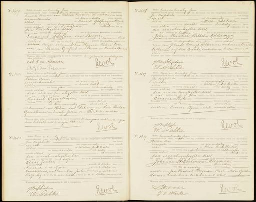 No. 3679. Heden twee en twintig Juni negentienhonderd twaalf verschene voor mij Ambtenaar van den burgerlijken stand van Amsterdam Maurits Samson van Beever, broeder van den overledene, - van beroep diamantbewerker, oud tweeendertig jaren, wonende en Maurits Godfried van Beever, alhier van beroep koopman vijftig jaren wonende alhier, bom van den overledene, die Verklaarden, dat op den twintigsten dezes, des na middags ten half vijf ure in de gemeente Amsterdam is overleden Emanuel Samson van Beever, van beroep zunstschilder, wonende te Laren in Noord„ holland oud zesendertig jaren geboren te Antwerpen in holtand Belgie, echtgenoot van Wijnanda Helena Kode, zoon van Jamson Godfried van Beever en Rosalia Barnet beiden overleden.— Waarvan akte, welke overeenkomstig de wet is voorgelezen. Goedgekeurd de doorhaling van een geschreven woord. Al S van Beever. MOOE C G. Van Beeven No. 3685 Heden twee en twintig Juni negentienhonderd twaalf verschenen voor mij Ambtenaar van den burgerlijken stand van Amsterd Jan Bosschieter, van beroep opzichter oud eenenveertig Jaren, wonende alhier, en Willem Jacob Palstra, van beroep opzichter oud dertig Jaren, wonende alhier de verklaarden, dat op der eenentwintigsten dezes des na middags ten half een ure in de gemeente Amsterdam is overleden Johan Heinrich Wilhelm Kolderman, 1zonder broep wonende alhier oud negentien maanden, geboren alhier zoon van Johannes Lodewijk Kolderman, werkman en Cornelia Catharina auf dem Brinke, zonder beroep, beiden wonende alhier Waarvan akte, welke overeenkomstig de wet is voorgelezen. J Bosschieter MWol sid No. 3681 Heden tweeentwintig Juni negentienhonderd twaalf verschenen voor mij Ambtenaar van den burgerlijken stand van Amsterdam: van beroep Nathan Groer, parapluienmaker, oud vierenveertig Jaren, wonende en David Costima, alhier van beroep geen oud drieenzestig jaren, den een en twintigsten dezer de versorden, de of wonende alhier des na middags ten tien ure in de gemeente Amsterdam is overleden Machiel Groenteman, van beroep melkslijter,, wonende alhier oud tweeenzeventig jaren, geboren alhier weduwraar van Helena van Dal, zoon van Mozes Abraham Groenteman en Dientje Jesara van West, beiden overleden. Waarvan akte, welke overeenkomstig de wet is voorgelezen. De aangevers verklaarden wegens hun Sabbath niet te mogen teekenen Kwol No. 3687. Heden twee en twintig Juni negentienhonderd twaalf verschenen/ voor mij Ambtenaar van den burgerlijken stand van Amsterdam van beroep Jan Bosschieter, opzichter oud eenenveertig jaren, wonende en Willem Jacob Talstra. ani van beroep opzichter oud dertig jaren, wonende alhier, den een en twintigsten dezer Ag versenden det of des voor middags ten half twee ure in de gemeente Amsterdam is overleden Leonora Wijma„ zonder beroep wonende alhier oud zeven maanden, geboren alhier, dochter van Leonora Wijma, werkster, wonende alhier Waarvan akte, welke overeenkomstig de wet is voorgelezen.- J Besschieter Keoo W. esalsted. No. 3683 Heden twee en twintig Juni negentienhonderd twaalf verschenen voor mij Ambtenaar van den burgerlijken stand van Amsterdam: Jan Bosschieter, van beroep opzichter, oud eenenveertig Jaren, wonende en Willem Jacob Palstra„ alhier van beroep opzichter oud dertig jaren, die verklaarden, dat op wonende alhier den eenentwintigsten dezer,— des na middags ten half een ure in de gemeente Amsterdam is overleden Klaas Jonker, , wonende te sloten in zonder ken— voordholland oud elf jaren geboren te sloten in Voordholland, zoon van Arie Jonker, lantaarnopsteker en Peetje Neij, zonder beroep, beiden wonende te Sloten voornoemd. Waarvan akte, welke overeenkomstig de wet is voorgelezen. J Bosschieter Keold W. Salto. No. 3689. Heden tweeentwintig Juni negentienhonderd twaalf verschelen voor mij Ambtenaar van den burgerlijken stand van Amsterdam: van beroep Willem Over, aanspreker, oud eenendertig jaren, wonende alhier en Johan Carel Wacker van beroep aanspreker, oud achtenvijftig jaren wonende alhier. die verklaarden, dat op den eenentwintigsten dezer des na middags ten half twee ure in de gemeente Amsterdam is overleden Johanna Wilhelmina Wiegman znder beroep vonende alhier, dud zes maanden, geboren alhier dochter van Jan Hendrik Hiegman, straatmaker en Geertruy Mosman, zonder beroep, beiden wonende alhier Waarvan akte, welke overeenkomstig de wet is voorgelezen. N. over KW0 J C Wacker