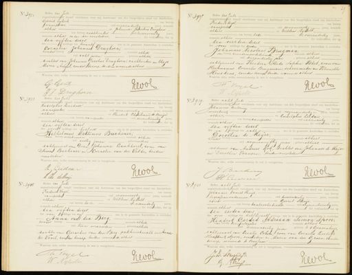 No. 3931 Heden zes Juli negentienhonderd twaalf verschenen voor mij Ambtenaar van den burgerlijken stand van Amsterdam: Gerrit Egberts van beroep Jaanspoeker. oud vierendertig jaren, wonende alhier, on Johannes Jacobus Duughorn,- van beroep nachtwaker oud tweeenveertig jaren, wonende alhier vader der overledene, die verklaarden, dat op den vijfden dezer des — middags ten twaalf ure in de gemeente Amsterdam is overleden Cornelia Johanna Drughorn, zonder beroep wonende alhier oud acht jaren geboren alhier, dochter van Johannes Jacobus Drughorn, nachtwaker en Elsje Maria Angel, zonder beroep, beiden wonende alhier. Waarvan akte, welke overeenkomstig de wet is voorgelezen. G: Egeurt. heool J. J Drughorn No. 3937 Heden zes Juli negentienhonderd twaalf verschenen voor mij Ambtenaar van den burgerlijken stand van Amsterdam Frederik Vogel. — van beroep aanspreke. Den en Willem Nijholt, alhier oud vierendertig jaren wonende alhier die verklaarden, dat op den vierden dezer. des voor middags ten zeven ure in de gemeente Amsterdam is overleden Johannes Nicolaas Bruaman, van beroep kruideniersbediende wonende alhier. oud drieendertig jaren, geboren alhier, echtgenoot van Theodora Alida Sophia Pieket, zoon van Hermanus Cornelis Brugman, schoermaker en Petronella Henskens zonder beroep, beiden wonende alhier Waarvan akte, welke overeenkomstig de wet is voorgelezen. H Voyel alvots W Nijkolv No. 3933 Heden zes Juli negentienhonderd twaalf verschenen voor mij Ambtenaar van den burgerlijken stand van Amsterdam Rusolphus werdred, — van beroep aanspreker, oud eenenveertig Jaren, wonende alhier. en Hendrik Christiaan de Bruijn. — van beroep danspueker, oud eenentwintig jaren, wonende alhier die verklaarden, dat op den vijfden dezer des voor middags ten half vier ure in de gemeente Amsterdam is overleden Hilhelmus Martinus Buchener, van Deroop werkman,, wonende alhier oud zestig jaren geboren alhier echtgenoot van Dina Johanna Lankhorst, zoon van Simon Buchener en Cornelia van der Velde, beiden overleden Waarvan akte, welke overeenkomstig de wet is voorgelezen. H. Leidnes Klool A. Che de Hruije No. 3939. Heden acht Juli negentienhonderd taalf verschenen voor mij Ambtenaar van den burgerlijken stand van Amsterdam; Johannes Bulting van beroep makelaar oud negenendertig Jaren, wonende alhier en Rudolphus Leidaer, van beroep aanspieker, — oud achtenzestig Jaren wonende slhier die verklaarden, dat op den vijfden dezes,— des na Middags ten acht ure in de gemeente Amsterdam is overleden Dorothea de Meyer. zonder Oeroe , wonende alhier.