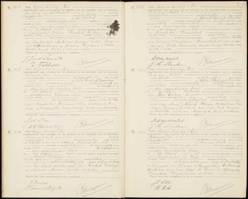 No. 3656 Heden twee en twintig Mei- negentienhonderd negen verschenen voor mij Ambtenaar van den burgerlijken stand van Amsterdam: Jan Jacob van de Sauvort van beroep Jaarspreker oud zesendertig jaren, wonende en Jan Fabbers alhier van beroep aanspilker oud negen en vijftig wonende alhier die verklaarden =den een entwintigsten dezer des na middags ten Tifacht ure in de gemeente Amsterdam is Lambertus Johann Hendrik Fakker zonder beroep, wonende alhier oud negen jaren geboren alhier, zoon van Lambertus Antonius Jacobus Pakker klerk bij 's Rijkbelastingen en Johanna Berendina Niesen zonder beroep, beiden wonende alhier Waarvan akte, welke overeenkomstig de wet is voorgelezen. J. J. v.d. Tauvort. Ademesen N No. 3662 Heden twee en twintig Mei negentienhonderd negen verschenen voor mij Ambtenaar van den burgerlijken stand van Am Dirk van Ressel. van beroe aanspieker oud vyfenviftig jaren, wonende alhier en Johan Hendrik staaken van beroep aanspieker oud vijfendertig jaren wonende alhier die verklaarden, dat op =den twintigsten dezer des na middags, ten twee ure in de gemeente Amsterdam is overleden Hendrika Heemskerk- zonder beroep, wonende alhier oud twee maanden, geboren alhier dochter van Johannes Christiaan Heemskerk, werkman en Annegie Wiske Posthuma, zonder beroep, beiden wo„ nende alhier. Waarvan akte, welke overeenkomstig de wet is voorgelezen. Ademegwern D van Kessel J.H. Sta ze No. 3658 J Heden twee en twintig Mei negentienhonderd negen verschenen, voor mij Ambtenaar van den burgerlijken stand van Amsterdam; Johannes Bree van beroe aanspieker oud negenentwintig jaren, wonende en Dirk Hendrik Baarslag alhier van beroep aanspreker oud twee en veertig jaren wonende alhier die verklaarden, dat op den eenen twintigsten dezer des voor middags ten vier ure in de gemeente Amsterdam is overleden Catharina Johanna Selie wonende alhier zonder beroep oud vijf maanden, geboren alhier dochter van Hendrikus Johannes Selie werkman en Ever„ „dina Scheepmaker, zonder beroep, beiden wonende alhier Waarvan akte, welke overeenkomstig de wet is voorgelezen. Ademegve Jod Bree. DC Baarilen No. 3664 van tweeen twintig Meit negentienhonderd negen verschenen voor mij Ambtenaar van den burgerlijken stand van Amsterdam Dirk van Kestel. aanspieker oud vijfenvijftig jaren, wonende alhier en Johan Hendrik staaken wovende alhier van beroep aandpieker oud vijfendertig jaren die verklaarden, dat op den negentienden dezer des na middags ten zalf twaalf ure in de gemeente Amsterdam is overleden Jan Cerlijn van beroep aannemer, wonende alhier oud vijfenvijftig jaren, geboren alhier, echtge noot van Anna Mersie Bruijn, weduwnaar van Anna Regina Musbach zoon van Dirk Cerlijn en Rebekka Susanna Hogendijk, beiden overleden Waarvan akte, welke overeenkomstig de wet is voorgelezen. demegen D Van Kessel J. H. Staaken. No. 3668 Heden twee en twintig Mei negentienhonderd negen verschenen voor mij Ambtenaar van den burgerlijken stand van Amsterdam Johannes Smies van beroep rentmeester oud vier en veertig jaren, wonende te Westerbark, zoon van de overledene en Johannes van Ark van beroep aanspreker oud negenenvijftig jaren wonende alhier die verklaarden, dat op =den negentienden dezer des na middags ten negen ure in de gemeente Amsterdam is overleden