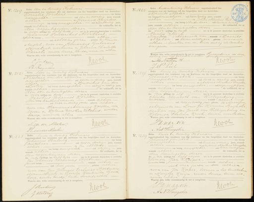 No. 1219 Heden een en twintig Februari negentienhonderd tien verschenen voor mij Ambtenaar van den burgerlijken stand van Amsterdam: Cornelis Jordans van beroep aanspreker, oud een en veertig jaren, wonende alhier en Bernard Reijnders, van beroep aanspieker, oud zesendertig jaren wonende alhier, die verklaarden, dat op den negentienden dezer des voor middags ten half twee ure in de gemeente Amsterdam is overleden Johannes Henderikus Noordhout zonder beroep,, wonende alhier - oud achttien jaren, geboren te NieuwerAmstel, zoon van Bernardus Gerhardus Noordhout, werkman en Johanna Charlotte Warneke, zonder beroep, beiden wonende alhier. Waarvan akte, welke overeenkomstig de wet is voorgelezen. hevbli C Jordan B. Reinders No. 1225 Heden twee en twintig Februari negentienhonderd tien verschenen voor mij Ambtenaar van den burgerlijken stand van Amsterdam: Maurits Neeter, van beroep diamantslijper, oud zes en twintig jaren, wonende alhier en Johan Nicolaas Peil 3 van beroep stula door, oud zeven en twintig jaren, wonende alhier die verklaarden, dat op den een en twintigsten dezer des voor middags ten twee ure in de gemeente Amsterdam is over Heintje Stork, zonder beroep, echtgenoote van, wonende Maurits Neeter, oud diamantslijper, geboren wonende alhier, is bevallen van een kind dat zij als levenloos aangeven. Waaryan akte, welke overeenkomstig de wet is voorgelezen. Goedgekeurd de door haling van vijf gedrukte woorden. Kevoln M NeetenI JW Teit No. 2121 Heden twee en twintig Februari negentienhonderd tien verschenen voor mij Ambtenaar van den burgerlijken stand van Amsterdam: Nicolaas van der Eoolen, van beroep aanspreker, oud zeven en dertig jaren, wonende alhier en Hendrikus van der Moolen, van beroep aanspreker, oud vijf en zestig jaren wonende alhier, die verklaarden, dat op den een en twintigsten dezer des voor middags ten twee ure in de gemeente Amsterdam is overleden Jacobus Johannes Korsten van beroep kantoorbediende, wonende alhier oud vier en dertig jaren, geboren alhier, zoon van Hermanus Adrianus Korsten, over leden en Helena Dorothea Veldhuis, zonder beroep, wonende alhier Waarvan akte, welke overeenkomstig de wet is voorgelezen. Keole A. van der Moolen. H. van der Moolen No. 1227 Heden twee en twintig Februari negentienhonderd tien verschenen voor mij Ambtenaar van den burgerlijken stand van Amsterdam: Johannes van Ark, van beroep aanspreker, oud twee en veertig jaren, wonende alhier en Antonie Nicolaas Vangster van beroep aanspreker, oud negenenvijftig jaren wonende alhier, die verklaarden, dat op den negentienden dezer des na middags ten elf ure in de gemeente Amsterdam is overleden Alida Elisabeth van Willigenburg zonder beroep,, wonende alhier oud zes en twintig jaren, geboren te Maarssen echtgenoote van Louis Jan Herman Beymshr dochter van Jan Jacob van Willigenburg en Welouisa Paulina Krook, beiden overleden Waarvan akte, welke overeenkomstig de wet is voorgelezen. HWOli JWarKw No. 1223 Heden twee en twintig Februari negentienhonderd tien verschenen voor mij Ambtenaar van den burgerlijken stand van Amsterdam: Johannes Bulsing, van beroep makelaar, oud zes en dertig jaren, wonende alhier, en Jan Nolting - van beroep aanspreker, oud vijftig jaren wonende alhier, dis verklaarden, dat op den negentienden dezer des na middags ten half twee ure in de gemeente Amsterdam is overleden Jan Johannes Zacharias Roltman zonder beroep,, wonende alhier - oud tien jaren geboren alhier, zoon van Jan Johannes Zacharias Roetman diamantslijper en Gerritje Geertruida Goed, koop, zonder beroep, beiden wonende alhier. Waarvan akte, welke overeenkomstig de wet is voorgelezen. J Buehens Kwole J. Nolting No. 1229 Heden twee en twintig Februari negentienhonderd tien verschenen voor hij Ambtenaar van den burgerlijken stand van Amsterdam Johannes van Ark, van beroep aanspreker, oud twee en veertig jaren, wonende alhier en Antonie Nicolaas Langster — van beroep aanspreker, oud twee enveertig jaren wonende alhier, die verklaarden, dat op den twintigsten dezer des na middags ten half negen ure in de gemeente Amsterdam is overleden DON Simon Jan Raper, zonder beroep,, wonende alhier oud vier jaren, geboren alhier zoon van Jan Kaper, leeraar in het handteekenen en Marijtje Kuijn, zonder beroep, beiden wo nende alhier. Waarvan akte, welke overeenkomstig de wet is voorgelezen. Kevoli Sanarkw A N Langster