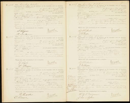 No. 6151 Heden twintig October negentienhonderd tien verschenen voor mij Ambtenaar van den burgerlijken. stand van Amsterdam: Antonius Schrijver van beroep aanspreker, oud drieëntwintig jaren, wonende alhier en Hendricus Molleman van beroep aanspreker, oud drieendertig jaren wonende alhier, die verklaarden, dat op den negentienden dezer, des voor middags ten acht ure in de gemeente Amsterdam is overleden Maria Willemina Geertruida van der Eijden, zonder beroep, wonende alhier oud eenentwintig jaren, geboren alhier, dochter van Johannes Jacobus Petrus van der bijden, arts, wonende alhier en Geertruida Wil„ lemina Eerdmans, overleden. Waarvan akte, welke overeenkomstig de wet is voorgelezen. A Schrijver Keold No. 6157 Heden twintig October negentienhonderd tien verschenen voor mij Ambtenaar van den burgerlijken stand van Amsterdam Ferdinand Jan Platvoet, van beroep oud drieënzeventig jaren, wonende geen,— alhier, en Jan Barend Hespe, oud vierenzestig jaren van beroep geen, wonende alhier die verklaarden, dat op den achttienden dezer. des na middags ten vier ure in de gemeente Amsterdam is overleden Evert Brouwer, zonder beroep, wonende alhier oud zevenenzeventig jaren, geboren te Meppel echtgenoot van Grietje Roelink, zoon van Harm Brouwer en Jantje Vreeburg, beiden overleden, Waarvan akte, welke overeenkomstig de wet is voorgelezen. J.J Platvoet HWol No. 6153 Heden twintig October negentienhonderd tien verschenen voor mij Ambtenaar van den burgerlijken stand van Amsterdam: Gterardus Vogel van beroep aanspreker oud vierenveertig jaren, wonende alhier en Pieter Bruyne van beroep aanspreker, oud eenendertig jaren, wonende alhier. die verklaarden, dat op den achttienden dezer, des na middags ten zeven ure in de gemeente Amsterdam is overleden Jan Schule,— wonende alhier zonder beroep oud tien maanden, geboren alhier, zoon van Jan Schule werkman en Johanna schreuder, zonder beroep, beiden wonende alhier. Waarvan akte, welke overeenkomstig de wet is voorgelezen. G. Svgel Keol P Bruyne No. 6159 I Heden twintig October negentienhonderd tien verschenen voor mij Ambtenaar van den burgerlijken stand van Amsterdam Ferdinand Jan Slatvoet, van beroep geen oud drieënzeventig jaren, wonende „alhier, en Jan Barend Hespe, van beroep geen oud vierenzestig jaren, wonende alhier, den negentienden dezer, de verdaarden det of des voor middags ten half acht ure in de gemeente Amsterdam is overleden Johanna Petronella Evers.— zonder beroep,, wonende alhier oud drieentachtig jaren, geboren alhier, weduwe van Jacobus Evert van Wijk dochter van Johannes Evers en Susanna Ketting beiden overleden. Waarvan akte, welke overeenkomstig de wet is voorgelezen. F: J Pletvoet Hlol 73 Hetp No. 6155 Heden twintig October negentienhonderd tien verschenen voor mij Ambtenaar van den burgerlijken stand van Amsterdam: Karel Kerk, van beroep schuitevoerder oud achtenveertig jaren, wonende en Cornelis Kuur, alhier. — van beroep werkman, oud achtenveertig jaren wonende alhier die verklaarden, dat op den zeventienden dezer, des na middags ten half twaalf ure in de gemeente Amsterdam is overleden Maria Elisabeth van Beek, zonder beroep,, wonende alhier oud vijfenveertig jaren, geboren alhier echtgenoote van Karel Herk, dochter van Henri cus Johannes van Beek, overleden en Anna Maria Kriele, zonder beroep, wonende alhier Waarvan akte, welke overeenkomstig de wet is voorgelezen. K. Kerk Hevdl 6: Iun No. 6161 ¶ Johanna Renvooi en de doorhaling van een geschre¬ ven naam goedgekeurd. W.J Burop J. van Assecz Wwol Heden twintig October negentienhonderd tien verschenen voor mij Ambtenaar van den burgerlijken stand van Amsterdam Willem Jacobus Bierau, van beroep bode oud tweeendertig jaren, wonende alhier, en Johannes van Assen oud zevenentwintig jaren van beroep bode, wonende alhier. — die verklaarden, dat op