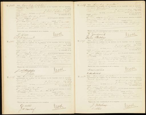 heden des voor middags ten half ziven ure in de gemeente Amsterdam is overleden Jansje van der Glas, zonder beroep,, wonende alhier echtgenoote van oud Mrahans Poetendorp, geboren, koopman, wonende alhier, is bevallen van een kind, dat zij als levenloos aangeven Waarvan akte, welke overeenkomstig de wet is voorgelezen. Goedgekeurd de door haling van vier gedrukte woorden. J. Joudsmit Heool er Bokkes No. 6165 Heden twintig october negentienhonderd tien verschenen voor mij Ambtenaar van den burgerlijken stand van Amsterdam Johannes Adrianus Hiddes van beroep agent van politie oud zevenenveertig jaren, wonende alhier en Beene zoek van beroep agent van politie oud zesendertig jaren wonende alhier, die verklaarden, dat op den negentienden dezer, des voor middags ten half negen ure in de gemeente Amsterdam is overleden Hendrik Josephus Kuylaars, zonder beroep,, wonende alhier oud tweeentwintig jaren, geboren te Tiel zoon van Johannes Ruylaars overleden en Maria Catharina Johanna Antonetta Meijer, zonder beroep, wonende te Nymegen Waarvan akte, welke overeenkomstig de wet is voorgelezen. J A. Hutdes Keol tboek No. 6177 Heden twintig October negentienhonderd tien verschenen voor mij Ambtenaar van den burgerlijken stand van Amsterdam: Davrd vas Nunes, van beroep oud eenenviftig jaren, wonende geen, alhier, en Josef Montezinos oud eenendertig jaren van beroep geen, wonende alhier, die verklaarden, dat op den negentienden dezer.— des na middags ten vier ure in de gemeente Amsterdam is overleden Hendrika Polak. zonder seroep,, wonende alhier — oud tweeenzestig jaren, geboren alhier echtgenoote van Dand de la Penha, dochter van Hartog Himan Polak en Rebeeca Mozes van der Mar, beiden overleden. Waarvan akte, welke overeenkomstig de wet is voorgelezen. KWol Dirt Munes brine No. 6167 Heden twintig October negentienhonderd tien verschenen voor mij Ambtenaar van den burgerlijken stand van Amsterdam, Gerrit de Wit van beroep aanspreker oud drieendertig jaren, wonende alhier, en Johannes Henricus Kerkhof van beroep aanspreker, oud vierendertig jaren —die verklaarden, dat of wonende alhier, den negentienden dezer, des na middags ten halfzes ure in de gemeente Amsterdam is overleden Arnoldus Jan van den Hatert zonderberoep,, wonende alhier — oud zeven maanden, geboren alhier zoon van Arnolda Tiebregta van den Hatert, zonder beroep, wonende alhier. Waarvan akte, welke overeenkomstig de wet is voorgelezen. G. de Wit Jwol J. H: Kerkhof No. 6173 Heden twintig October negentienhonderd tien verschenen voor mij Ambtenaar van den burgerlijken stand van Amsterdam: Jacob Veldkamp, van beroep aanspreker, oud tweeentwintig jaren, wonende en Cornelis van Hees, alhier van beroep aanspreker oud achtenviftig jaren wonende alhier, die verklaarden, dat op den negentienden dezer, des voor middags ten zalf twaalf ure in de gemeente Amsterdam is overleden Teuntje Johanna Geerders, - zonder beroep, wonende alhier, oud vierentwintig jaren, geboren alhier, dochter van Wilhelm Geerders, spoorkeambte en Jannetje van der Horst, zonder beroep, beiden wonende alhier. Waarvan akte, welke overeenkomstig de wet is voorgelezen. J. Veldkamp Leol C v Hees.