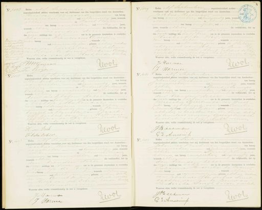 No. 6073 Idaarna van echtgescheiden echtgenoot van Petronel la Alberdina de Raadt Renvooi goed. gekeurd Jijr J: Begh Heden elf September negentienhonderd zestien verschenen voor mij Ambtenaar van den burgerlijken stand van Amsterdam: Hero van Wijngaarde van beroep aanspieker oud achtenveertig jaren, wonende alhier, en Rarel Beijer, van beroep aanstreker oud veertig jaren, die verklaarden, dat op wonende alhier den negenden dezes des voor middags ten el ure in de gemeente Amsterdam is overleden Johannes Franciscus Cordijn onder beroep, wonende t oud vierenzeventig jaren, geboren alhier, weduw„ „naar van Dirkje van Roekels, zoon van Petrus Hendricus Theodorus Gordijn en Alida van den Hoek, beiden overleden Waarvan akte, welke overeenkomstig de wet is voorgelezen WWWijnganne Kevol K. Reijer No. 6or9 Heden elf September negentienhonderd zestien- verschenen voor mij Ambtenaar van den burgerlijken stand van Amsterdam:- Jacobus Meerman. van beroep aanspreker, oud tweeenzestig jaren, wonende alhier, en Johannes Warmer van beroep aanspriker, oud eenenzestig jaren, wonende alhier die verklaarden, dat op den negenden dezer des voor middags ten half drie ure in de gemeente Amsterdam is overleden Huibert de Weij van beroep winkelier, wonende alhier oud achtendertig jaren, geboren te Helder echtgenoot van Johanna Lena Ri vordt, zoon van Almt Eilders de Wei overleden en Neeltje Half, zonder beroep wonende alhier. Waarvan akte, welke overeenkomstig de wet is voorgelezen. J Meerman HWO. J Warmer No. 6045 Heden elf September negentienhonderd zestien verschenen voor mij Ambtenaar van den burgerlijken stand van Amsterdam: Hendrik van Beek van beroep aanspreker oud eenenveertig jaren, wonende alhier, en Frederik Antoine du Oorbier, van beroep aanspreker, oud vijfenzestig jaren wonende alhier die verklaarden, dat op den achtsten deze des na middags ten half twaalf ure in de gemeente Amsterdam is overleden Neeltje Molenaar van beroep onderwijzeres wonende alhier, oud zevenendertig jaren, geboren te Boven„ karspel, echtgenoote van Baart. dochter van Jan Molenaar en Wijnanda Sas, beiden zonder beroep en wonende alhier Waarvan akte, welke overeenkomstig de wet is voorgelezen. H H. van Beek NloC Jnb du Cob var No. 6051 Heden elf September negentienhonderd zestien verschenen voor mij Ambtenaar van den burgerlijken stand van Amsterdam: Johannes Beekman, van beroep aanspreker, oud zevenenveertig jaren, wonende alhier, en Gerrit Johannes Andriesse, van beroep aanspreker, oud negenenvijftig jaren wonende alhier die verklaarden, dat op den tienden dezer des voor middags ten half een ure in de gemeente Amsterdam is overleden Sirrechie Geertruida van Beest, zonder beroep, echtgenoote van, wonende Cornelis Nieuwendijk oud melkslijker, geboren wonende alhier is bevallen van een kind, dat zij als levenloos aangeven. Goedgekeurd de doorhaling van vijf gedrukte woorden Waarvan akte, welke overeenkomstig de wet is voorgelezen. J Beekman Keool Gd Aneuis No. 504 Heden elf September negentienhonderd zestien verschenen voor mij Ambtenaar van den burgerlijken stand van Amsterdam: Jacobus Merman, van beroep aanspieker, oud tweeenzestig jaren, wonende alhier, en Johannes Warmer van beroep aanspieker oud een enzestig jaren, wonende alhier die verklaarden, dat op den tienden dezer des voor middags ten twee ure in de gemeente Amsterdam is overleden Tijntje de Jong, onderberoep, wonende alhier, oud dertien jaren geboren alhier, doch„ ter van Gerrit de Jons, schuitenvoerder en Hiltje van der Duim, zonder beroep beiden wonende alhier Waarvan akte, welke overeenkomstig de wet is voorgelezen. JMeermvan Wwol J Warmer No. 6053 Heden elf September negentienhonderd zestien verschenen voor mij Ambtenaar van den burgerlijken stand van Amsterdam: Johannes Beekman van beroep aanspreker, oud zevenenveertig jaren, wonende alhier en Gerrit Johannes Andriesse, van beroep aanspreker, oud negenenvijftig jaren wonende alhier die verklaarden, dat op den tienden dezer des voor middags ten acht ure in de gemeente Amsterdam is overleden Suzanna Henderika de Leeuw zonder beroep, wonende alhier oud negenenzeventig jaren, geboren alhier weduwe van Johannes Hendrikus Smit dochter van Jan de Leeuw en Henderika Smijt, beiden overleden Waarvan akte, welke overeenkomstig de wet is voorgelezen. JB eekmer vol: G S Aneenup