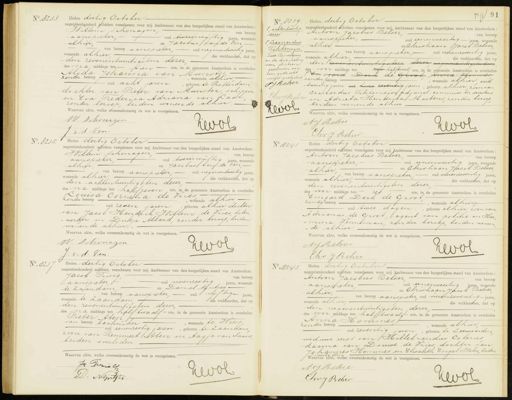 Heden dertig October negentienhonderd achttien verschenen voor mij Ambtenaar van den burgerlijken stand van Amsterdam: aanspeeker, oud twieenviftig jaren, wonende Willem Schonagin, van beroep alhier en Jacobus van de Ven van beroep aanspreker, oud negenentwintig jaren wonendealhier die verklaarden, dat op den zevenentwintigsten dezer, des n a middags ten hun ure, in de gemeente Amsterdam is overleden Alida Johanna van Munster ,wonende alhier zonder beroep -oud acht jaren, geboren te Rotterdam dochter van Pieter van Munster, schipper en Eva Frederica Adriana van Laar zonder beroep, beiden wonendealhier Waarvan akte, welke overeenkomstig de wet is voorgelezen. W Dehonager Levol v.d Ven. deren ¶ Leconardus Tikkemeyer Twee Renvoren en de doorhaling van dertiens geschreven en tien gedreckt woord goedgekeurd JJ Belver Cvt Beke Kevol negentienhonderd Achttien verschenen voor mij Ambtenaar van den burgerlijken stand van Amsterdam: Heden dertig October Antoon Jacobus Beeser, van beroep aanspuker, oud eenenveertig jaren, wonende „-alhier en Christiaan Jacob Belser van beroep aanspreker oud vierenzeventig jaren wonende alhier, die verklaarden, dat op -den zevenentwintigsten dezer negenentwintigsten dezer des voor middags ten ves halftwaalf ure, in de gemeente Amsterdam is overleden TErngord Dirk de Groot Anna Hommes zonder beroep wonende alhier oud twintig jaren oud twee zeventig jaren, geboren alhier zoon van Leonardus Tikkemeyer adjunct- commis ter secretarie er en Adrieta Hendrika Martins zonder beroep beiden wonende alhier Waarvan akte, welke overeenkomstig de wet is voorgelezen. AJ Belser WWol Chro Belser No. 8235. Heden dertig October negentienhonderd achttien verschenen voor mij Ambtenaar van den burgerlijken stand van Amsterdam; Willem Schonagen van beroep aanspieker, oud tweeenvijftig jaren, wonende alhier, en Jacobus van de Ven, van beroep aanspaker oud negenentwintig jaren wonende alhier die verklaarden, dat op den -achtentwintigsten dezer, — des na middags ten half zeven ure, in de gemeente Amsterdam is overleden, Louisa Cornelia de Vries , wonende alhier zonder beroep— oud zeven jaren, geboren alhier dochter van Jacob Hendrik Willem de Vries, kolen „werker en Dirkje Allard, zonder beroep, beiden wonende alhier. Waarvan akte, welke overeenkomstig de wet is voorgelezen. W Ochonagen KWol. J. v. d. Ven No. 8241. Heden dertig October negentienhonderd achttien verschenen voor mij Ambtenaar van den burgerlijken stand van Amsterdam; Antoon Jacobus Belser, van beroep aanspreker, oud eenenveertig jaren, wonende alhier en Christiaan Jacob Belser van beroep aanspreker oud vierenzeventig jaren die verklaarden, dat op wonende alhier den zevenentwintigsten dezer, des voor middags ten — z ure, in de gemeente Amsterdam is overleden Emgard Derk de Groot zonder beroep, wonende alhier, oud twee dagen, geboren alhier zoon van Adrianus de Groot, agent van politie en Har„ „mina Venneman, zonder beroep, beiden wnen, „de alhier.- Waarvan akte, welke overeenkomstig de wet is voorgelezen. AJ Belver Eevols Chr J Beher No. 823 Heden dertig October negentienhonderd achttien verschenen voor mij Ambtenaar van den burgerlijken stand van Amsterdam Jacob Fring van beroep aanspieker, oud vierenzestig jaren, wonende te zaandam, en Daniel Nijntjes. van beroep aanspreker oud vijftig jaren, wonende te Laandam de verkaarden, dat op den zevenentwintigsten dezer, des na middags ten half twaalf ure, in de gemeente Amsterdam is overleden Pieter Atep, van beroep techniker, wonende te Weesp oud eenenzestig jaren, geboren te Zaandam zoon van Remmert Iten en Aagje van Saane beiden overleden Waarvan akte, welke overeenkomstig de wet is voorgelezen. Jr Terioch Keol D: Mijntjen No 8243 Heden dertig October negentienhonderd achttien verschenen voor mij Ambtenaar van den burgerlijken stand van Amsterdam Antoon Jacobus Belser, van beroep aanspreker oud eenenveertig jaren, wonende en Christiaan Jacob Belser alhier, van beroep aanspreker, oud vierenzeventig jaren wonende alhier die verklaarden, dat op den negenentwintigsten dezer des voor middags ten halftwaalf ure, in de gemeente Amsterdam is overleden Anna Hommes, wonende alhier zonder beroep — oud zeventig jarin, geboren te Leeuwarden weduwe eerst van Hillebrandus Colerus daarna van Douwe de Vries dochter van Johannes Hommes en Elisabeth Engel Weber, beiden overleden. Waarvan akte, welke overeenkomstig de wet is voorgelezen. AJ Belser CnJ Beker KWol