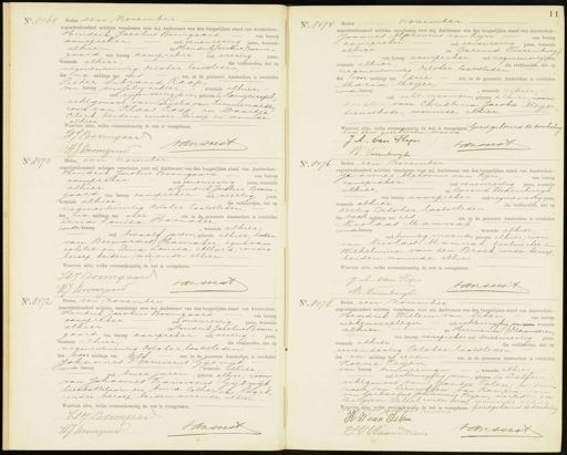 No. 8468 Heden een November negentienhonderd achttien verschenen voor mij Ambtenaar van den burgerlijken stand van Amsterdam; Hendrik Jacobus Boomgaard, van beroep aanspreker oud eenenzestig jaren, wonende alhier en Hendrik Jacobus Boom- gaard van beroep aanspreker oud veertig jaren, wonende alhier, die verklaarden, dat op negenentwintig. tilober laatstleden des ina middags ten zes ure, in de gemeente Amsterdam is overleden Pieter Sebrarid Raap van beroep wisselwachter, wonende alhier, oud vijfendertig jaren, geboren te Haringcarspel; echtginoot van Cornelia van Kimmenalde zoon van Klaas Raap, en Maartje Klerk, beiden zonder beroep en wonende alhier. Waarvan akte, welke overeenkomstig de wet is voorgelezen. HJ Boomgaar Jansoest JJ Boomgaard No. 8474 Heden een November negentienhonderd achttien verschenen voor mij Ambtenaar van den burgerlijken stand van Amsterda Joannes Alphonsus van Rijn van beroep aanspreker oud eenenzestig jaren, wonende alhier en Barend Poorenburg van beroep aanspreker oud negenenzertig jaren wonende alhier; die verklaarden, dat of negnentwintig bctober laatstleden des voor middags ten drie ure, in de gemeente Amsterdam is overleden Maria Meijer, zonder deroep, wonende alhier; oud acht maanden, geboren alhier; za dochter van Christina Jacoba Meijer dienstbode, wonende alhier. Waarvan akte, welke overeenkomstig de wet is voorgelezen Goedgekeurd de doorhaling van een geschreven woord J A. van Ryn Jansoest No. 8470 Heden een november negentienhonderd achttien verschenen voor mij Ambtenaar van den burgerlijken stand van Amsterdam: Hendrik Jacobus Boomgaard van beroep aanspreker oud eenenzestig jaren, wonende alhier en Hendrik Jacobus Boom- jaard van beroep aanspreker oud veertig jaren wonende alhier, die verklaarden, dat op negenentwintig October laatstleden des na middags ten vier ure, in de gemeente Amsterdam is overleden Dina Louisa Hamaker zonder beroep, wonende alhier oud twaalf jaren, geboren alhier; dochter van Bernardus Hamaker, agent van politie en Dina Louisa Allard, zonder beroep, beiden wonende alhier. Waarvan akte, welke overeenkomstig de wet is voorgelezen. HeJ Boomgaard Jansoest HJ Boomgaard No. 8476 Heden een november negentienhonderd achttien verschenen voor mij Ambtenaar van den burgerlijken stand van Amsterdam Jannes Alphonsus van Rijn, van beroep aanspreker oud eenenzestig jaren, wonende alhier, en Barend Toohenburgh van beroep aanspreker oud negenenzertig jaren wonende alhier, dertig October laatstleden, de verklaarden, dat of des voor middags ten zes ure, in de gemeente Amsterdam is overleden Nicolaas Mannak zonder beroep, wonende alhier oud twintig maanden geboren alhier; zoon van Nicolaas Mannak bootwerker en Wilhelmina van den Broek zonder beroep beiden wonende alhier Waarvan akte, welke overeenkomstig de wet is voorgelezen. J A. van Ky Jansoest B. Pooserburgh No. 8772 Heden een november negentienhonderd achttien verschenen voor mij Ambtenaar van den burgerlijken stand van Amsterdam, Hendrik Jacobus Boomgaard van beroep aanstreker oud eenenzestig jaren, wonende alhier e Hendrik Jacobus Boom- gaard van beroep aanspreker oud veertig jaren, wonende alhier, die verklaarden, dat op negenentwintig October laatstleden des voormiddags ten Ald ure, in de gemeente Amsterdam is overleden Johannes Franciscus Gijswijt zonder beroep wonende alhier. oud twee jaren, geboren alhier; zoon van Johannes Franciscus Gijswijf bierbottelaar en Anna Catharina Jogel zonder beroep, beiden wonende alhier. Waarvan akte, welke overeenkomstig de wet is voorgelezen. Zt Boomgaan JAusoest W.J Boomgaand No. 8478 Heden een november negentienhonderd achttien verschenen voor mij Ambtenaar van den burgerlijken stand van Amsterdam Hendrik Willem van Seben van beroep ziekenverpleger oud achtenvijftig alen jaren, wonende alhier en Hermanus Vlaanderen, van beroep aanspreker oud drieenzestig jaren wonende alhier. die verklaarden, dat op eenendertig October laatstleden des na middags ten zeven ure, in de gemeente Amsterdam is overleden Koene Leijen, van beroep timmerman, wonende alhier oud achtenvijftig jaren, geboren te Dalfsen echtgenoot van Jantje Salen; weduw naar van Lieurotjen van Kampen; zoon van Gerhardus Johannis Feijen, overleden en Margien Velzel, zonder beroep, wonende alhier Waarvan, afte welke overeenkomstig de wet is voorgelezen Goedgekeurd de doorhaling gedripat woord H:W van Oeben. Jansoest W Vlaanderen