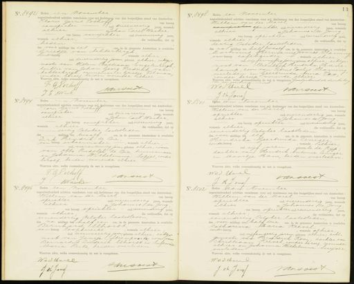 No. 8492 Heden een November negentienhonderd achttien verschenen voor mij Ambtenaar van den burgerlijken stand van A Flaris Gerrit Pothoff, van beroep aanspreker oud drieenzestig jaren, wonende alhier en Johan Carel Wacker, van beroep aanspreke oud vierenzestig jaren wonende alhier; die verklaarden, dat op heden O des voor middags ten zes ure, in de gemeente Amsterdam is overleden Grietje van Achterbergh wonende alhier zonderderden oud drieëndertig jaren, geboren alhier; echtge- noot van Willem Bastiaan Engelenbergh, dochter van Johan Georg Frederik van Achterbergh, aannemer en Grietje Polman zonder beroep, beiden wonende alhier Waarvan akte, welke overeenkomstig de wet is voorgelezen F. GPolhet Sansoest J E Wuik Heden een November negentienhonderd achttien verschenen voor mij Ambtenaar van den burgerlijken stand van Amsterdam Willem van der Marel, van beroep apziker opzichter, oud vierendertig jaren, wonende alhier en Johannes de Jong van beroep opzichter oud zevenendertig jaren, wonende alhier, die verklaarden, dat op dertig October laatstleden, des namiddags ten half twaalf ure, in de gemeente Amsterdam is overleden Martinus, Hermanus Joannes Vlamin van beroep cafehouder, wonende alhier oud vijfenvijftig jaren geboren alhier. echtge noot van Eisabeth Hendrika Hane kamp; zoon van Petrus Paulus Vlaming overleden en Geertruida Anna Tax zonder beroep wonende alhier. Waarvan akte, welke overeenkomstig de wet is voorgelezen. Goedgekeurd de dooralin van een geschreven waard WoSHarl Vansoest J Ok Janst Heden een November negentienhonderd achttien verschenen voor mij Ambtenaar van den burgerlijken stand van Amsterdam; loris Gerrit Pothoff, van beroep aanspreker oud drie en zestig jaren, wonende alhier en Johan Carel Wacker van beroep aanspriker oud vierenzestig jaren, wonende, alhier die verklaarden, dat op eenendertig October laatstleden des middags ten twaalf ure, in de gemeente Amsterdam is overleden Dirk Hendrik/ de Bie van deroep schoenmaker, wonende alhier oud vier entwintig jaren geboren alhier; zoon van Otto Rudolph de Bie, timmerman en Johanna Wilhelmina Sopjes, zonder beroep, beiden wonende alhier Waarvan akte, welke overeenkomstig de wet is voorgelezen. T. G Petheff Sansoest Woeken No. 8500 Heden een November negentienhonderd achttien verschenen voor mij Ambtenaar van den burgerlijken stand van Amsterdam Willem van der Marel, van beroep opzichter oud vierendertig jaren, wonende alhier en Johannes de Jong van beroep opzichter oud zevenendertig jaren wonende alhier. die verklaarden, dat op eenendertig October laatstleden des voor middags ten Eelf ure, in de gemeente Amsterdam is overleden Hendrika Geertruida Leniger zonder beroep, wonende alhier; oud vijf jaren, geboren te de Rijp, dochter van Hendrik Antonie Leniger en Maartje Ham, beiden overleden Waarvan akte, welke overeenkomstig de wet is voorgelezen. Wv d Mavel Van soegt J. H J onsf No. 8496 Heden een november negentienhonderd achttien verschenen voor mij Ambtenaar van den burgerlijken stand van Amsterdam, Willem van der Marel, van beroep opzichter oud vierendertig jaren, wonende alhier en Johannes de Jong van beroep opzichter oud zevenendertig jaren, wonende alhier. die verklaarden, dat op eenendertig October laatstleden des na middags ten half een ure, in de gemeente Amsterdam is overleden Bernaard Elhorst van beroep loopknecht, wonende alhier oud zesenveertig jaren geboren alhier, echtge noot van Jansje steenpoorte; zoon van Bernardus Drederik Elhorst en Eufenna Maria Keitz, beiden overleden. Waarvan akte, welke overeenkomstig de wet is voorgelezen. WvdHael Sansoist A Bh Zond No. 8502 Heden een November negentienhonderd achttien verschenen voor mij Ambtenaar van den burgerlijken stand van Amsterdam Willem van der Marel, van beroep opzichter oud vierendertig jaren, wonende alhier en Johannes de Jong van beroep opzichter oud zevenendertig jaren wonende alhier, die verklaarden, dat op eenendertig October laatstleden, des voor middags ten half drie ure, in de gemeente Amsterdam is overleden Catharina Maria Keevel zonder beroep, wonende alhier oud vijfendertig jaren, geboren alhier; echt- genoote van Hendrik Rooi; dochter van hristiaan Keevel, zonder beroep, wonende alhier en Johanna Wilhelmina Suijver overleden. Waarvan akte, welke overeenkomstig de wet is voorgelezen. WaTHbar Van soest J oh Jonp