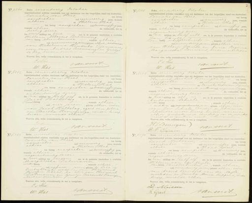 No. 8360 Heden eenendertig October negentienhonderd achttien verschenen voor mij Ambtenaar van den burgerlijken stand van Amsterdam: Cornelis van Hees van beroep aanspreker oud zesententig jaren, wonende alhier; en Willem Has van beroep vanspreker oud tweeenvijftig jaren wonende alhier, die verklaarden, dat op dertig dezer des voor middags ten drie ure, in de gemeente Amsterdam is overleden Willem Albertus Brenning van beroep steenhouwer, wonende alhier oud zesenzeventig jaren geboren alhier; weduwnaar van Wiehelmina Hendrika Gjemann, zoon van Andries Brennings en Grietje de Key, beiden overleden Waarvan akte, welke overeenkomstig de wet is voorgelezen. C v Hees vansoer W. Has No. 8366 Heden eenendertig October negentienhonderd achttien verschenen voor mij Ambtenaar van den burgerlijken stand van Amsterdam Cornelis van Hees, van beroep aanspreker oud zesenzertig jaren, wonende alhier en Willem Has, van beroep aanspreker oud tweeenvijftig jaren wonende alhier; negenentwintig dezer de verdaaten, det of des na middags ten half acht ure, in de gemeente Amsterdam is overleden Jan Janse, van beroep schippersknecht, wonende alhier; oud zevenendertig jaren, geboren alhier; zoon van Willem Janse en Anna Regina Margaretha Louwens, beiden overleden Waarvan akte, welke overeenkomstig de wet is voorgelezen. C v Hees van soest. W. Has No. 8362 Heden eenendertig October negentienhonderd achttien verschenen voor mij Ambtenaar van den burgerlijken stand van Amsterdam: Cornelis van Hees, van beroep aanspreker oud zesenzestig jaren, wonende alhier en Willem Has van beroep aanspreker oud tweeënvijftig jaren, wonende alhier; achtentwintig dezer de verdaarden, dat op des na middags ten half vijf ure, in de gemeente Amsterdam is overleden Jacob Holtslag zonder beroep, wonende alhier oud vier jaren, geboren alhier, zoon van Jacob Holtslag, agent van politie en Wartha Hemminga, zonder beroep beiden wonende alhier Waarvan akte, welke overeenkomstig de wet is voorgelezen. Cd Hlos Jansoest W. Has No. 8368 Heden eenendertig October negentienhonderd achttien verschenen voor mij Ambtenaar van den burgerlijken stand van Amsterdam; Hendrik Jacobus Boomgaard van beroep aanstreker oud eenenzestig jaren, wonende alhier en Cornelis Frakciscus Symon van beroep gemeente- ambtenaar oud negenentwintig jaren, wonende alhier; die verklaarden, dat op negenentwintig dezer des voormiddags ten zes ure, in de gemeente Amsterdam is overleden Antonie Schiele, zonder beroep, wonende alhier oud twee oud zevenentwintig jaren, geboren alhier; zoon van Jan Schiele, venter en Johanna schrender, zonder beroep, beiden wonende alhier goedgekeurd de doorhaling van een gedrukt woord en een geschreven waord. Waarvan akte, welke overeenkomstig de wet is voorgelezen. HJ Bormgaar) van soest CF. Sijmons Heden eenendertig October negentienhonderd achttien verschenen voor mij Ambtenaar van den burgerlijken stand van Amsterdam Cornelis van Hees, van beroep aanspreker oud zesenzestig jaren, wonende alhier en Willem Has van beroep aanspreker oud tweeënvijftig jaren wonende alhier; negenentwintig dezer de vardenden, det op des voor middags ten negen ure, in de gemeente Amsterdam is overleden Margaretha Sielmann zonder beroep, wonende alhier oud vijfenzes jaren, geboren te Zeer in Duitschland/ wedue van Heinrich Janssen Peters, dohter van Heinrich sielmann en Grietje Beerends Kampen beiden overleden Waarvan akte, welke overeenkomstig de wet is voorgelezen. C v Sleet Jansoest W. Has No. 8370 Heden eenendertig October negentienhonderd achttien verschenen voor mij Ambtenaar van den burgerlijken stand van Amsterdam: Darid Meiboom, van beroep aanspreker oud zevenenvijftig jaren, wonende alhier en klaas Groot van beroep aanspreker oud tweeenveertig jaren wonende alhier; negenentwintig dezer de verdaurder, det of des na middags ten half elf ure, in de gemeente Amsterdam is overleden Willem van der Mijle, van beroep Pandtechniker, wonende alhier. oud vierentwwintig jaren, geboren alhier; zoon van Arend Leendert van der Mijle overleden en Jacoba Maria Rippens, zonder beroep, wonende alhier Waarvan akte, welke overeenkomstig de wet is voorgelezen. D. Meibom Jan soest K Groot