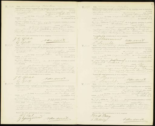 No. 8372 Heden eenendertig October negentienhonderd achttien verschenen voor mij Ambtenaar van den burgerlijken stand van Amsterdam: Johannes Cornelis Göebel, van beroep oonspreker oud zevenenvijftig jaren, wonende alhier en Gerrit Egterts van beroep aanspreker oud eenenveertig Jaren, wonende alhier; die verklaarden, dat op dertig dezer des voor middags ten tien ure, in de gemeente Amsterdam is overleden Geertruida Tjakkes, zonder deroep, wonende alhier oud tweeëndertig jaren, geboren alhier; dachter van Jacob Dirk Tjakkes overleden en Geertrinida Masereeum, zonder beroep, monende alhier Waarvan akte, welke overeenkomstig de wet is voorgelezen. J C Goebel van soest G: Egbut No. 8378 Heden eenendertig October negentienhonderd achttien verschenen voor mij Ambtenaar van den burgerli Preerk Stavorinus, van beroep kantoorbediende oud zestig jaren, wonende alhier en Lijkle Buwalda van beroep waginmaker oud achtenzestig jaren wonende alhier; die verklaarden, dat op dertig dezer; des na middags ten half twaalf ure, in de gemeente Amsterdam is overleden Johanna Wilhelmina Brand zonder beroep, wonende alhier oud vijfenzeventig jaren geboren te Rotterdam echtginoote van Gijsbert Lambertus Boomgdert, dochter van Willem Brand en Jamtje Holstijn, beiden overleden Waarvan Jakte, welke overeenkomstig de wet is voorgelezen. PHtavonnus vansoest. No. 8374 Heden eenendertig october negentienhonderd achttien verschenen voor mij Ambtenaar van den burgerlijken stand van Amsterdam: Johannes Cornelis Göebel, van beroep aanspreker oud zevenenvijftig jaren, wonende alhier, en Gerrit Eberts van beroep aanspreker oud eenenveertig jaren wonende alhier. dertig dezer de verklaarden, dat op des na middags ten vier ure, in de gemeente Amsterdam is overleden Maria Louisa Reisinger wonende alhier; zonder beroep oud tweeentwintig jaren geboren alhier; van echt gencheiden echtgenoote van Hendrik Hubert Beekers. dochter van Josept Reisinger, overleden en Jacoba Hendrika Willensina Hilbrink, zonder beroep, wonende alhier Waarvan akte, welke overeenkomstig de wet is voorgelezen. J C. Göebel Jansoest J Egbert No. 8380 Heden eenendertig october negentienhonderd achttien verschenen voor mij Ambtenaar van den burgerlijken stand van Amsterdam Freerk Stavorinus van beroep kantoorbediende oud zestig jaren, wonende alhier en Lijkle Buwalda van beroep wagenmaker oud achtenzentig jaren wonende alhier die verklaarden, dat op dertig dezer des na middags ten half twaalf ure, in de gemeente Amsterdam is overleden Bareld Swaers,, wonende alhier zonder beroep oud eenentachtigpren geboren te Hoogezand weduwnaar van Annechien Tilman zoon van Kemmert Jacobs Swiers en zukkien ten Hore beiden overleden Waarvan akte, welke overeenkomstig de wet is voorgelezen. F Havorenus Jan soest. SnvalAu No. 8376 Heden eenendertig October negentienhonderd achttien verschenen voor mij Ambtenaar van den burgerlijken stand van Amsterdam; Hendrik Johannes Kas, van beroep aanspreker oud eenentachtig jaren, wonende alhier en Johannes Jongebloed, van beroep aanspreker oud tachtig jaren, wonende alhier; die verklaarden, dat op dertig dezer des voor middags ten twee ure, in de gemeente Amsterdam is overleden Eduard Theodorus Verveen van beroep machinist, wonende alhier. oud drieënveertig jaren geboren te Velzen. echtgnoot van Trijntje van Petten, natuurlijke niet erkende zoon van Maria Catharina Verveen, overleden Waarvan akte, welke overeenkomstig de wet is voorgelezen. HJ Ras J Opong bloer Jansoest No. 8382 Heden eenendertig October negentienhonderd achttien verschenen voor mij Ambtenaar van den burgerlijken stand van Amsterdam Willem van den Berg, van beroep aanspreker oud negenenveertig jaren, wonende alhier en Cornelis Hiedering van beroep aanspreker oud vijfenvijftig jaren wonende alhier; die verklaarden, dat op achtentwintig dezer des na middags ten Ttinle ure, in de gemeente Amsterdam is overleden Johanna Schermers zonder beroep, wonende alhier oud vijfendertig jaren geboren te Heusden, dochter van Jacobus Schermers en Martina Bouman, beiden overleden Waarvan akte, welke overeenkomstig de wet is voorgelezen. W.V.d. Berg. E Hildering Janzoest