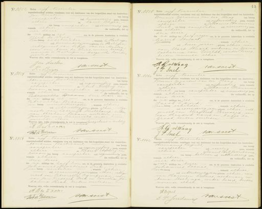 No. 8852 Heden vijf November negentienhonderd achttien verschenen voor mij Ambtenaar van den burgerlijken stand van Amsterdam: Jan Versten, van beroep aanspreker oud tweeënveertig jaren, wonende alhier en Karel Beijer, van beroep aanspreker oud drieenveertig jaren wonende alhier, vier dezer de verklaarden, dat op des nd middags ten zes ure, in de gemeente Amsterdam is overleden Tjerk de Vries van beroep zadelmaker, wonende te Harlingen oud tweeëndertig jaren geboren te Harlingen, echtgmoot van Lipje van der Meulen zoon van Anne de Vries, zonder beroep wonende te Harlingen en Margaretha Roorda, overleden Waarvan akte, welke overeenkomstig de wet is voorgelezen. Jan Kersten. Jansoest K. Beijer. No. 8858 Heden vijf November negentienhonderd achttien verschenen voor mij Ambtenaar van den burgerlijken stand van Amsterdam; Brunis Gerardus van der Waag van beroep aanspreker oud vijfenveertig jaren, wonende alhier en Johannes Fhanciscus Snel van beroep aanspreker oud vierendertig jaren wonende alhier; die verklaarden, dat op drie dezer des na middags ten half negen ure, in de gemeente Amsterdam is overleden Gerrit Stuart, wonende alhier zonderderoep oud tweejaren, geboren alhier; zoon van Elard Stuart, werkman en Gezing Catharina van Isveldt, zonder beroep, beiden wonende alhier Waarvan akte, welke overeenkomstig de wet is voorgelezen. B Gvdwaag Jan soest F Snel No. 8854 Heden vijf November negentienhonderd achttien verschenen voor mij Ambtenaar van den burgerlijken stand van Amsterdam: Adrianus Bastiaans van beroep aanspreke oud negenenvijftig jaren, wonende alhier en Fredrik Anthonij de zwaar van beroep aanspreker oud negenenveertig jaren, wonende alhier die verklaarden, dat op Petronella naam, drie dezer des na middags ten zes ure, in de gemeente Amsterdam is overleden Petronella Braam van beroep courantenbezorgder, wonende alhier; oud achtendertig jaren, geboren alhier; echtge- noote van Lodewijk Smitskamp, dochter van Abraham Braam overleden en Jannetje van Barneveld zonder beroep, wonende alhier Waarvan akte, welke overeenkomstig de wet is voorgelezen goedgebeuwd te doorhaling van twee geschreven namer A Bashaarur vansoest J de Invaun No. 8860 Heden vijf November negentienhonderd achttien verschenen voor mij Ambtenaar van den burgerlijken stand van Amsterdam Brunis Gerardus van der Haag, van beroep aanspreker oud vijfenveertig jaren, wonende alhier en Johannes Franciscu snel van beroep aanspriker oud vierendertig jaren wonende alhier, die verklaarden, dat op drie dezer des na middags ten zes ure, in de gemeente Amsterdam is overleden Jacob Land. van beroep schilder, wonende alhier oud zesendertig jaren geboren alhier echt genoot van Elizabeth Verwoerd, zoon van Hendrik Land en Aafje de Groot, beiden overleden Waarvan akte, welke overeenkomstig de wet is voorgelezen. B. G. vd Waag Jansoest P: Snel No. 8856 Heden vijf November negentienhonderd achttien verschenen voor mij Ambtenaar van den burgerlijken stand van Amsterdam Adrianus Bastiaans, van beroep aanspreker oud negenenvijftig jaren, wonende alhier en Fredrik Anthonij de zwaan van beroep aanspreker oud negenenveertig jaren wonende alhier. die verklaarden, dat op drie dezer des na middags ten half tien ure, in de gemeente Amsterdam is overleden Johannes Martinus Trik van beroep winkelier, wonende alhier oud eenenzestig jaren geboren alhier; echtge- noot van Petronella Kampman, zoon van Jan Frederik Irik en Cornelia Jo- hanna Heek, beiden overleden. Waarvan akte, welke overeenkomstig de wet is voorgelezen. A Rl te aans Vomsoest JAd Jvan No. 8862 Heden vijf November negentienhonderd achttien verschenen voor mij Ambtenaar van den burgerlijken stand van Amsterdam: Hermanus Beynes, van beroep aanstreker oud veertig jaren, wonende alhier en Daniel Paul Jorritsma van beroep kellner oud achtendertig jaren, wonende alhier vier dezer de versklaardee, dat of des voor middags ten inee ure, in de gemeente Amsterdam is overleden Johannes Leenes wonende alhier zonder beroep oud achtentwintig jaren geboren alhier; zoon van Harmen Leenes werkman en Anna Stoelinga, zonder beroep, beiden wonende alhier. Waarvan akte, welke overeenkomstig de wet is voorgelezen. H Bejnes D: P: Condsma Vansoest