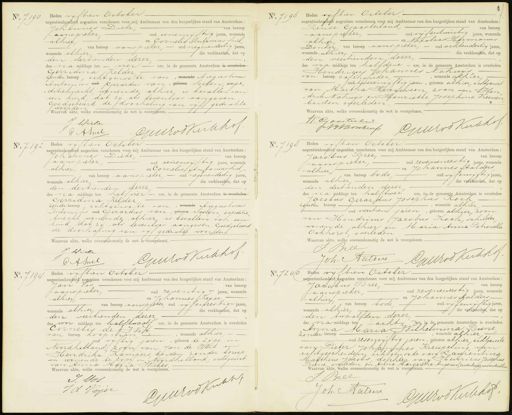 No. 7190 Heden vijftien October negentienhonderd negentien verschenen voormij Ambtenaar van den burgerlijken stand van Amsterdam Johannes Dieke, van beroep aanspreker, oud eenenvijftig jaren, wonende alhier, en Cornelis Antonius Snel van beroep aanspreker, oud negenendertig jaren wonende alhier, die verklaarden, dat op den - dertienden dezer des na middags ten — vier ure, in de gemeente Amsterdam is overleden- Gerridina Kelder zonder beroep, echtgenoote van, wonende Augustinus Antonius oud Gerardus van, geboren soelen, expe„ „ditieknecht, wonende, alhier, is bevallen van een kind, dat 29 als levenloos aangeven Goedgekeurd de fdoorhaling van vijf gedrukte woonden Waarvan akte, welke overeenkomstig de wet is voorgelezen. J Wicke GuerrdKerkhof CA Spel No. 7196 Heden vijftien October, negentienhonderd negentien verschenen voor mij Ambtenaar van den burgerlijken stand van Amsterdam Rense Gaasterland, van beroep aanspreker, oud vijfentwintig jaren, wonende alhier en Nicolaas Hermanus Donker, van beroep aanspelker oud achtendertig jaren wonendealhier, die verklaarden, dat op -den veertienden dezer, des na middags ten half drie ure, in de gemeente Amsterdam is overleden Hendricus Johannes Nahuys van beroep cafihouder, wonende alhier oud tweeenviftig jaren, geboren alhier, echtgenoot van Martha Hoogeveen zoon van Hen „drik Nahuijs en Henriette Josephine Vreeven beiden overleden. Waarvan akte, welke overeenkomstig de wet is voorgelezen.- JJ. Goesteel Guelod Kerkhof JJBonhenp No. 7192 Heden vijftien October negentienhonderd negentien verschenen voor mij Ambtenaar van den burgerlijken stand van Amsterdam: Johannes Dieke, van beroep aanspilker, oud eenenvijftig jaren, wonende alhier, en Cornelis Antonius Snel, van beroep aanspreker, oud negenendertig Jaren wonende alhier, die verklaarden, dat op den dertienden - dezer des a middags ten half vier ure, in de gemeente Amsterdam is overleden Gerridina Relder zonder beroep, echtgenoote van, wonende Augustinus Antonius oud Gerardus van, geboren soelen, expeditie „knecht wonende, alhier is bevallen van een kind, dat zij als levenloos -aangeven Goedgekeurd de doorhaling van vijf gedrukte woorderb Waarvan akte, welke overeenkomstig de wet is voorgelezen. J Wieke Guurod Kerkhof C A Snel No. 7198 Heden vijftien October negentienhonderd negentien verschenen voor mij Ambtenaar van den burgerlijken stand van Amsterdam, Jacobus Bree, van beroep aanspreker, oud zevenenzestig jaren, wonende alhier en Johannes Aalders van beroep bode oud vijfenvijftig jaren, wonende alhier den dertienden dezer de varkkarden, dat of des a middags ten half twee ure, in de gemeente Amsterdam is overleden Jacobus Gerardus Josiphus Roch zonder beroep, wonende alhier oud veertien jaren, geboren alhier, zoon van Hendricus Jacobus Koch, schilder wonende alhier en Maria Anna Petronella Ockhorst, overleden. Waarvan akte, welke overeenkomstig de wet is voorgelezen. J Bree Gueroo Kerkhf Joh: Aalders No. 7194 Heden vyftien October negentienhonderd negentien verschenen voor mij Ambtenaar van den burgerlijken stand van Amsterdam: van beroep Jan Vos aanspreker, oud zeventig jaren, wonende alhier, en Johannes Zeijer van beroep aanpreker, oud vijfenzestig jaren wonende alhier
