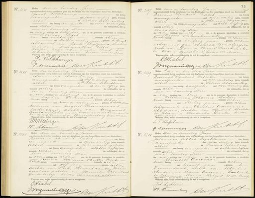No. 3241. Heden drie en twintig Juni negentienhonderd dertig verschenen voor mij Ambtenaar van den burgerlijken stand van Amsterdam: Jacob Veldkamp van beroep aanspreker oud twee en veertig jaren, wonendn alhier en Petrus Schoovenberg van beroep aanspreker oud zes en zeventig Jare, wonende alhier die verklaarden, dat of een en twintig dezer des voor middags ten half drie ure, in de gemeente Amsterdam is overleden Lourens Bak van beroep melkelijker wonende alhier oud acht en zestig jaar, geboren te Graff echtgenoot van Janke Bylsma, weduw naar van Margrietha Wilhelmina Visser zoon van Pieter Bak en Maartje Brouwer. beiden overleden Waarvan akte, welke overeenkomstig de wet is voorgelezen. - J: Veldkamp. P hekoo irKutht. No. 3247 Heden drie en twintig Juni negentienhonderd dertig verschenen voor mij Ambtenaar van den burgerlijken stand van Amsterdam: Lourens Hendrik Zabel van beroep aanspreken oud vier en veertig jaren, wonende alhier en Johannes Ingwversen -van beroep aanspreker oud achtenviftig jaren wonende alhier die verklaarden, dat op een en twintig dezer des nan middags tenEelf ure, in de gemeente Amsterdam is overleden Wessel Pruikemaker zonder beroep wonende alhier oud tachtig jaar, geboren alhier echtgenoot van Rosette Woudhuijsen zoon van David Wessel Pruikemaker en Klara Goedhart beiden overleden. Waarvan akte, welke overeénkomstig de wet is voorgelezen. LAtzabel VIngenenendelge een Kurttf. No. 3243. Heden, drie en twintig Juni negentienhonderd dertig verschenen voor mij Ambtenaar van den burgerlijken stand van Amsterdam: Marinus Moesbergen van beroep aanspreker oud vijf en dertig jaren, wonende alhier en Willem Schensema van beroep aanspreken oud vier en viftig jare, wonende alhier die verklaarden, dat op len en twintig dezer des voor middags ten half vijf ure, in de gemeente Amsterdam is overleden Sophia Linneman zonder beroep, wonende alhier — oud zeven en zestig jaar, geboren te Rottedam weduwe van August Franciscus Sutherland, dochter van Emanuel Gustaaf Johannes Franciscus Linneman en Geertrida spruijtenburg beiden overleden Waarvan akte, welke overeenkomstig de wet is voorgelezen WMrestergen vn Kuthf W. Schenren No. 3249 Heden drie en twintig Juni negentienhonderd dertig verschenen voor mij Ambtenaar van den burgerlijken stand van Amsterdam: Hodewyk Poulus Kesseler van beroep aanspreker oud zeven en dertig jaren, wonende alhier en Petrus Schoonenberg — van beroep aanspreker oud zes en zeventig Jaren wonende alhier die verklaarden, dat op twee en twintig dezer des na middags ten - drie ure, in de gemeente Amsterdam is overleden Wilhelmina Johanna Mulder zonder beroep wonende alhier oud veertigjaar, geboren alhier echtgenoote van Carolus Lodevicus Hiddes, dochter van Hendrik Mulder en Johanna Hendrika Donker beiden verleden.— Waarvan akte, welke overeenkomstig de wet is voorgelezen. L P. Kesselie P Bewonenbug Cen Kenths No. 3245 Heden, drie en twintig Juni negentienhonderd dertig verschenen voor mij Ambtenaar van den burgerlijken stand van Amsterdam: Pourens Hendrik Zabel van beroep aanspreker oud vieren veertig jaren, wonende alhier en Johannes Ingwersen - van beroep aanspreker oud acht en vijftig jare, wonende Alhier die verklaarden, dat op twee en twintig dezer des voor middags ten regen ure, in de gemeente Amsterdam is overleden Janna Adriana van der Weele zonder beroep, wonende alhier — oud vyf jaar geboren glhier dochter van Pieter Hendrik van der Weele agent van politie en Jannetje Vroonland zonder beroep beiden wonende alhier Waarvan akte, welke overeenkomstig de wet is voorgelezen. AZabel Ingeeeveenbelge n Kuttf No. 3251 Heden drie en twintig Juni negentienhonderd dertig verschenen voor mijAmbtenaar van den burgerlijken stand van Amsterdam: Johannes Sibbele Lijcklama van beroep aanspreker oud zes en dertig jaren, wonende alhier en Barend Voorenburrg van beroep aanspreker oud achtenzeventig jaren wonende alhier die verklaarden, dat op een en twintig dezer des na middags ten 1 vier ure, in de gemeente Amsterdam is overleden Elisabeth Ooievaar— zonder beroep, wonende alhier oud twaalf jaar, geboren te eenendaal, dochter van Albertus Hendricus Maria Oorwaar bank werker en Johanna Maria Metgod, zonder beroep beijden wonende alhier Waarvan akte, welke overeenkomstig de wet is voorgelezen. Joh: Lycktarma B. Tmmberz CW Kretht