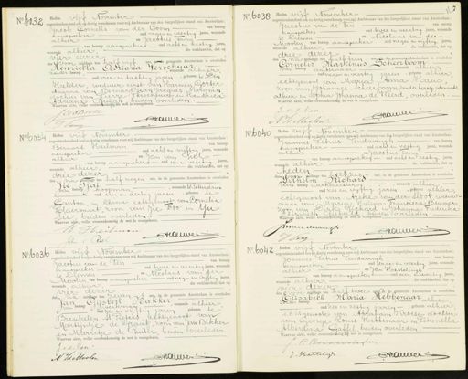 Heden vijf November. negentienhonderd een en dertig verschenen voor mij Ambtenaar van den burgerlijken stand van Amsterdam; Jacob Cornelis van der Boom van beroep ranspreker oud negen en veertig jaren, wonende alhier en Jacobus Lang van beroep aanspreker oud acht en zestig jaren wonende alhier die verklaarden, dat of vier dezer des 4 voor middags ten half vijf ure, in de gemeente Amsterdam is overleden Henriella Adriana Verschuur , wonende alhier zonder beroep oud vier en tachtig jaren, geboren te Den Helder, weduwe eerst van Harmen Gorter daarna van Bernard Jean Jacoues Magnin dochter van Pierre Verschuur en Hendrica Adriana Ruijan beiden overleden Waarvan akte, welke overeenkomstig de wet is voorgelezen. J CvdBoom Eranver T Vong No. 6038 Heden vijf November negentienhonderd een en dertig verschenen voor mij Ambtenaar van den burgerlijken stand van Amsterdam; Jacobus van de en van beroep hanspreker oud twee en veertig jaren, wonende te Diemen en Nicolaas van der Moolen van beroep aanspreker oud negen en vijftig jaren wonende alhier die verklaarden, dat op drie dezer, des na middags ten half tien ure, in de gemeente Amsterdam is overleden Cornelis Martinus Scheerboom van beroep ambtenaar, wonende alhier, oud negen en veertig jaren, geboren alhier echtgenoot van Maria Anna Haug zoon van Johannes Scheerboom, zonder beroep, wonende alhier en Sophia Johanna de Weerd, overleden. Waarvan akte, welke overeenkomstig de wet is voorgelezen. J. I. d. Ven Bander Vv/d Moolen No. 6034 Heden vijf November negentienhonderd éen en dertig verschenen voor mij Ambtenaar van den burgerlijken stand van Amsterdam: Bernard Heilman van beroep aanspreker oud acht en vijftig jaren, wonende alhier en Jan van Gel van beroep aanspreker oud een en veertig Jaren wonende alhier, die verklaarden, dat op drie dezer des na muiddags ten half negen ure, in de gemeente Amsterdam is overleden Jai 10 van beroep koopman, wonende te Rotterdam oud een en dertig jaren, geboren te Canton, in Chind, echtgenoot van Cornelia Eoldervaart, zoon van zie Foo en Iu Sie, beiden overleden. Waarvan akte, welke overeenkomstig de wet is voorgelezen. B. Heilman Eriawer Jan 8 Pil No 6041 Heden vijf November negentienhonderd een en dertig verschenen voor mij Ambtenaar van den burgerlijken stand van Amsterdam Joanmes Petrus Tendavingh van beroep hanspreker oud acht en zestig jaren, wonende alhier en Jacobus Vang van beroep aanspreker oud acht en zestig jaren die verklaarden, dat op wonende alhier — heden den Koop middags ten half zes ure, in de gemeente Amsterdam is overleden silhelm Richard van beroep werkmeester, wonende alhier oud zes en vijftig jaren, geboren alhier echtgenoot van Areke van der Sloot weduw. naar van Maria Helena Francisca Beumer zoon van Dirk Gichard en Johanna Frederika Elisabeth Bietveld beiden overleden Waarvan akte, welke overeenkomstig de wet is voorgelezen. mndevinge Enauer J Vang No 6036 Heden vijf November negentienhonderd een en dertig verschenen voor mij Ambtenaar van den burgerlijken stand van Amsterdam: Jacobus van de Een van beroep aanspreker oud twee en veertig jaren, wonende te Duemen en Nicolaas van der Moolen van beroep aanspreker oud negen en vijftig jaren wonende alhier, die verklaarden, dat op vier dezer des na middags ten zeven ure in de gemeente Amsterdam is overleden van beroop Jysbert Teakker Veltaae oud zes en vyftig jaren, sehoren Ae Dwerkman, wonende alhier Breukelen St. Pieters, eechtgenoot van Martijntje de Graaf, zoon van Jan Bakker en Marretje de Chuter, beiden overleden. Waarvan akte, welke overeenkomstig de wet is voorgelezen. J. v.d. Ven Bouver N v/d Moolen Heden vif November negentienhonderd een en dertig verschenen voor mij Ambtenaar van den burgerlijken stand van Amsterdam: Joannes Petrus Tendavingh van beroep aanspreker oud drie en veertig jaren, wonende alhier en Jan Hettelingh van beroep aansprekeer oud vier en zeventig jaren wonende alhier die verklaarden, dat op vier dezer des ovoor-middags ten half twee urein de gemeente Amsterdam is overleden Elisabeth Maria Hebbenaarehier , wonen — zonder beroep oud zes en zestig jaren geboren alhier echtgenoote van Abraham Kroese dochter van George rouis Hebbenaar en Petronella Alberdina Gaffel, beiden overleden. Waarvan akte, welke overeenkoustig/de wet is voorgelezen. J. C. Een dovneheen J. Hettelijk Erauven