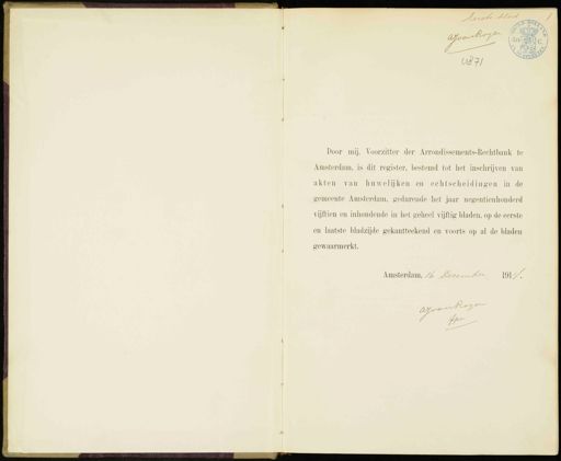 Stadsarchief Amsterdam, archieftoegang 5009, Archief van de Burgerlijke stand, inventarisnummer 4871, Huwelijken en echtscheidingen, Akten, Registers van huwelijksakten en echtscheidingsakten, deel 01