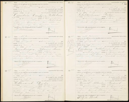 No. 133 Heden acht Januari negentienhonderd vijf en dertig verscheen voor mij Ambtenaar van den burgerlijken stand van Amsterdam: Alkemade, Henricus van deroep aanspreker oud drieentwintig Jaar wonende alhier, die, op grond van eigen wetenschap verklaarde, dat op zeven Januari negentienhonderd vijf en dertig des voor middags half acht uur, in de gemeente Amsterdam is overleden, Gerritsen, Carolina Wilhelmina , wonende alhier inden beroep — oud drieenveertig jaar, geboren te Watergraafsmeer echtgenoote van Oosterman, Kapel Dirk dochter van Gerritsen, Jan, stoker en van Glasenap Sara Cornelia, zonder beroep, beiden wonende alhier Waarvan akte, welke overeenkomstig de wet is voorgelezen. H: Alkemade Jrm No. 139 Heden acht Januari — negentienhonderd vijf en dertig verscheen voor mij Ambtenaar van den burgerlijken stand van Amsterdam:K Schot, Jan van beroep aanspreker oud drieendertig wonende alhier, die, op grond van eigen wetenschap verklaarde, dat op zeven Januari negentienhonderd vijf en dertig des na middags half tien uur, in de gemeente Amsterdam is overleden Schilderman, Pieter van beroep werkman, wonende alhier -oud drieenveertig jaars geboren te Sloten in Noord„ holland, zoon van Schilderman Johannes en Breed, Aaltje, beiden overleden Waarvan akte, welke overeenkomstig de wet is voorgelezen. schrot Jrmmans No. 135 Heden acht Januari negentienhonderd vijf en dertig verscheen voor mij Ambtenaar van den burgerlijken stand van Amsterdam: Schot Jan van beroep aanspreker oud drieendertig jaar wonende alhier, die, op grond van eigen wetenschap verklaarde, dat op zeven Januari negentienhonderd vijf en dertig des na middags een uur, in de gemeente Amsterdam is overleden: Zevenbergen, Johanna Maria zonder beroepwonende alhier oud drieendertig jaar, geboren te Rotterdam echtgenoote van Weers, Cornelis, dochter van Zevenbergen, Leendert en van Peen„ Annetje, beiden overleden Waarvan akte, welke overeenkomstig de wet is voorgelezen. J Crot Pimayf No. 141 „ zes Renvooi in de door haling van een woord goedgekeurd Jvot Niemant Heden acht Januari negentienhonderd vijf en dertig verscheen voor mij Ambtenaar van den burgerlijken stand van Amsterdam: Schot, Jan van beroep aanspreker oud drieendertig jaar wonende alhier, die, op grond van eigen wetenschap verklaarde, dat op vijf Januari negentienhonderd vijf en dertig des na middags vier uur, in de gemeente Amsterdam is overleden Cordang, Wilhelmina Antonia zonder beroep, wonende te Diemen oud zeventig jaar, geboren te 's Vertogenbosch echtgenoote var Maane, Willem Christiaan dochter van bordang, Elisabeth overleden Waarvan akte, welke overeenkomstig de wet is voorgelezen. JSchot Wlemant No 137 Heden acht Januari negentienhonderd vijf en dertig verscheen voor mij Ambtenaar van den burgerlijken stand van Amsterdam Schot, Jan van beroep aanspreker oud drieendertig jaar wonende alhier, die, op grond van eigen wetenschap verklaarde, dat op vijf Januari negentienhonderd vijf en dertig des na middags even uur, in de gemeente Amsterdam is overleden: Hilberdink, Dirkje zonder beroep wonende alhier oud achtenzestig jaar geboren te Raalte weduwe van van Paassen, Simon dochter van Hilberdink, Hendrik en Olthof, Johanna, beiden overleden Waarvan akte, welke bvorgenkomstig de wet is voorgelezen. Juln JSCh No. 143 Heden acht Januari negentienhonderd vijf en dertig verscheen voor mij Ambtenaar van den burgerlijken stand van Amsterdam: van den Hoek, Petrus Gerardus van beroep aanspreker oud achtentwintig jaar wonende alhier, die, op grond van eigen wetenschap verklaarde, dat op zes Januari negentienhonderd vijf en dertig des na middags half een uur, in de gemeente Amsterdam is overleden Ronst Albertus Frederik van beroep verhouder, wonende alhier oud zesenzestig jaar, geboren te Mijdrecht echtgenoot van Engwerda, Anna Alida zoon van Konst Pieter en Bosman Hendrika beiden overleden Waarvan afte, welke overeenkomdig de va 'is voorgeleren. P G. Jd. Koek