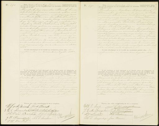 No. 490. Heden zesentwintig Juni negentienhonderd dertien zijn voor mij Ambtenaar van den burgerlijken stand van Amsterdam verschenen, ten einde een huwelijk aan te gaan Hendrik Jan van den Brink huis. schilder, geboren en wonende alhier, oud drieëntwintig jaren, meerderjarige zoon van Hendrik Jan van den Brink, oud zes en zestig jaren, zonder beroep, wonende al„ hier, en Annigje de Lange, overleden, en Sophia Dina Catharina Rosendaht, zonder beroep, geboren en wonende alhier, oud zevenentwintig jaren, meerderjarige doch ter van Johan Friedrich Rosendahl, oud vijfenvijftig jaren — loopknecht, en so phia Wilhelmina van Tol, oud vijf en vijftig jaren — zonder beroep, beiden wonende alhier. De vader des bruidegoms en de oudersder bruid verklaarden, voor mij tegenwoordig, toe te stemmen in dezen echt. De beide afkondigingen tot dit huwelijk zijn onverhinderd geschied, alhier den vijftienden en tweeëntwintigsten dezer Ik heb bruidegom en bruid afgevraagd of zij elkander nemen tot echtgenooten en getrouwelijk alle de plichten zullen vervullen, welke door de wet aan den huwelijken staan verbonden zijn. Nadat deze vragen door hen bevestigend beantwoord werden, heb ik, in naam der wet, uitspraak gedaan, dat zij door het huwelijk aan elkander zijn verbonden, dls getuigen waren tegenwoordig: Gerrit van den Brink, broeder des echtgenoots, schoenmaker, ond zevenendertig jaren August Gijsbertus van Schaik Martinet, zwager der echtge noote, huisschilder, oud dertig jaren Paulus Joseph Petrus Melcherstimmerman oud negenenveertig jaren, en Antoon Chris toffel Simon Sonneborn kleermaker, oud vijftig jaren, allen wonende alhier. No. 491 Heden Zesentwintig Juni negentienhonderd dertien zijn voor mij Ambtenaar van den burgerlijken stand van Amsterdam verschenen, ten einde een huwelijk aan te gaan: Hendricus Nicolaas Petrus Smit, kleermaker, geboren in de gemeente Leiden wonende alhier, oud zesentwintig jaren meerderjarige zoon van Petrus Johannes Smit oud eenenvijftig jaren, coupenr en Margaretha Cornelia Lagerberg oud vijftig jaren, zonder berroep beiden wonende alhier, en Johanna Elisabeth Maria Spiegeler, zon der beroep, geboren en wonende alhier, oud eenen twintig jaren, meerderjarige dochter van Lam bertus Spiegeler, overleden, en Maria Louisa Zondag, zonder beroep, wonende alhier. De onders des bruidegoms verklaarden voor mij tegenwoor dig, toe te stemmen in dezen echt De moeder der bruid heeft, blijkens hierbij overgelegde authentieke akte, in dezen echt toegestemd. De beide afkondigingen tot dit huwelijk zijn onverhinderd geschied, alhier den vijftienden en tweeëntwintigsten dezer Ik heb bruidegom en bruid afgevraagd of zij elkander nemen tot echtgenooten en getrouwelijk alle de plichten zullen vervullen, welke door de wet aan den huwelijken staat verbonden zijn. Nadat deze vragen door hen bevestigend beantwoord werden, heb ik, in naam der wet, uitspraak gedaan, dat zij door het huwelijk aan elkander zijn verbonden. Als getuigen waren tegenwoordig: Hendricus Wilhelmus Wiegant, tabakshandelaar oud drie en der tig jaren, Hubertus Antonius Veringa werktuigkundige, oud negenentwintig jaren, Reinhold Clemens Stockmann koopman, oud vijfentwintig jaren, en Fran ciscus Jacobus van Westerloo, koopman oud achtentwintig jaren, allen wonende alhier aarvan akte, welke overeenkomstig de wet is voorgelezen. HG vd mink Ged Brink 3 DC Rozendaklet Gv Schacheaaker HJ vd Bressch PJO Melhy JF: Razendtak Ab S: Sommelira Nui JW Van Pol orgelezen. H.W. Muegent HerV . Smit J E. M Spiegeler H A. Veringe P:J Smit R. Stoekman Cueolan M C Seagerberg Javn Wosterton