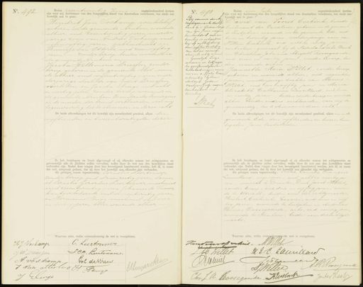 No. 492. Heden Zesentwintig Juni negentienhonderd dertien zijn voor mij Ambtenaar van den burgerlijken stand van Amsterdam verschenen, ten einde een huwelijk aan te gaan. Hendrik Jan Voskamp, winkelchef, geboren in de gemeente Arnhem, wonende alhier, oud zesentwintig jaren meerder jarige zoon van Andries Voskamp, oud vijfenvijftig jaren, pakhuisknecht, en tennisje van Stterlo, oud zesenvijftig jaren, — zonder beroep, beiden wonende in de gemeente Arnhem, en Jacoba Willemina Driessen zonder beroep, geboren in de gemeente Elst, wonen de alhier, oud vijfentwintig jaren, meer derjarige dochter van Evert Driessen overleden, en Jacoba Elings, oud acht en veertig jaren, zonder beroep, wonende in de gemeente Arnhem De ouders desbruidegoms en de moeder der bruid verklaarden, voor mij tegenwoordig toe te stemmen in dezen echt. De beide afkondigingen tot dit huwelijk zijn onverhinderd geschied, alhier den vijftienden en tweeëntwintigsten dezer Ik heb bruidegom en bruid afgevraagd of zij elkander nemen tot echtgenooten en getrouwelijk alle de plichten zullen vervullen, welke door de wet aan den huwelijken staat verbonden zijn. Nadat deze vragen door hen bevestigend beantwoord werden, heb ik, in naam der wet, uitspraak gedaan, dat zij door het huwelijk aan elkander zijn verbonden. Als getuigen waren tegenwoordig: Cornelis Heertouwer zonder beroep, oud drieënzestig jaren Samu- el Cornelis Gerardus Leertouwer, machiniss, oud zesentwintig jaren Johannes de Visser- kantoortediende, oud vierentwintig jaren en Hermanus Buijs, machinist, oud vier en dertig jaren allen wonende alhier Waarvan akte, welke overeenkomstig de wet is voorgelezen. No. 493 Bij vonuis dersbr rondigsements. Recht. bank te T. Gravenhage van tien Jun negen. tienhonderd vier en twintig is uitgespro ken de ontbuiding door echtecheiding van het in nevens. staande akte vermel- de huwelijk Inge- schreven in het regis ter vanstuwelyken en Echtscheidingen, nin¬ mer een a. folio twee entwintig te Aem. sterdam, heden veertien Juli negen tienhonderd vieren. twintig ARahy Heden een Juli negentienhonderd dertien zijn voor mij Ambtenaar van den burgerlijken stand van Amsterdam verschenen, ten einde een buwelijk aan te gaan: Lavid van Voorst Evekink, tweede ge luitenant der Cavalerie, geboren in de gemeen„ te Zutphen, wonende in de gemeente Ede, oud twee en twintig jaren, meerderjarige zoon van Willem Evekink, oud acht en veertig jaren controleur-generaal bij de Nederlandsche Bank l en Christina Johanna Abigail Roosegaarde oud zeven en veertig jaren, zonder beroep, bei- den wonende alhier en m Jeannette Marie Willet, zonder beroep igeboren en wonende alhier, oud negentien jaren, minderjarige dochter van Marius v Willet, oud een en vijftig jaren en Maria Elizabeth Catharina Laurillard, oud twee en veertig jaren beiden zonder beroepen wonende alhier. Beider ouders verklaarden, voor mij te- genwoordig, toe te stemmen in dezen echt: De beide afkondigingen tot dit huwelijk zijn onverhinderd geschied, alhier en in de gemeente Ede, den vijftienden en twee en twin„ tigsten Juni laatstleden Ik heb bruidegom en bruid afgevraagd of zij elkander nemen tot echtgenooten en getrouwelijk alle de plichten zullen vervullen, welke door de wet aan den huwelijken staa- verbonden zijn. Nadat deze vragen door hen bevestigend beantwoord werden, heb ik, in naar der wet, uitspraak gedaan, dat zij door het huwelijk aan elkander zijn verbonden. Als getuigen waren tegenwoordig: Sade Cornelis Francoir Laurillard, ingenieur, oud acht en veertig ja„ ren, wonende te Deventer, Dirk Jacob Willet, zonder beroep, oud drie en vijftig jaren, wonen de te Utrecht, beiden oom der echtgenoote, Huibert Evekink, kassier, oud twee en vijf- tig jaren, wonende te Zutphen en Antonius Reinier Roozegaarde, arts, oud veertig jaren wonende te Arnhem, beiden oom des echtge noots Waarvan akte, welke overeenkomstig de wet is voorgelezen. C. Leertouwer H J. Voskamp S.C.G. Leitonver. JW Driessen A voorkamp Mlleerotu tot de Vrser J Vun atterloo H Bunge J Elingt Van Voor Brekus. M:W111c. M: E:C. Laurellard J: A: Willet Ean een Rlemm A R. Roosegaande DJ: Willer Ar. J. A. Hoosegaarde Plumn Jonter Haas