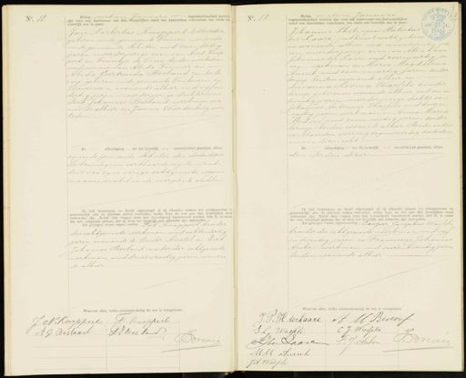 No. 12. Heden veertien Januari negentienhonderd veertien zijn voor mij Ambtenaar van den burgerlijken stand van Amsterdam verschenen, ten einde een huwelijk aan te gaan: Jan Norbertus Knoppert, letterzetter geboren in de gemeente Diemen, wonende in de gemeente Schoten, oud zesendertig jaren meerderjarige zoon van Aart Knop pert en Teuntje de Vries beiden overleden weduwnaar van Alida Timmer, en Alida Geertruida Bosland, zonder be roep, geboren in de gemeente Vinkeveen en Waverveen wonende alhier, oud vijf en dertig jaren meerderjarige dochter an Dirk Johannes Bosland, werkman, wo„ nende alhier, en Janna Weerdenburg, over leden De afkondiging — tot dit huwelijk is onverhinderd geschied, alhier en in de gemeente Schoten, den derden dezer De bruidegom verklaarde mij de identi¬ teit van zijne vorige echtgenoote wegen naamsverschil in de overgelegde stukken Ik heb bruidegom en bruid afgevraagd of zij elkander nemen tot echtgenooten en getrouwelijk alle de plichten zullen vervullen, welke door de wet aan den huwelijken stad verbonden zijn. Nadat deze vragen door hen bevestigend beantwoord werden, heb ik, in naar der wet, uitspraak gedaan, dat zij door het huwelijk aan elkander zijn verbonden. Als getuigen waren tegenwoordig: Tok Knoppert, broeder des echtgenoots, werkman, oud achtendertig jaren, wonende te Ouder. Amstel, en Dirk Johannes Bosland, vader der echtgenoote werkman oud drieënzestig jaren wonen„ de alhier. Waarvan akte, welke overeenkomstig de wet is voorgelezen. No. 13. Heden vertien Januari negentienhonderd veertien zijn voor mij Ambtenaar van den burgerlijken stand van Amsterdam verschenen, ten einde een huwelijk aan te gaan: Johannes Philippus Hubertus ter Laare, pakhuisknecht geboren en wonende alhier, oud eenentwintig ja„ ren, meerderjarige zoon van Abraham Johannes ter Laare oud zesenveertig ja„ ren. — werkman, en Maria Magdalena Anink oud zevenenveertig jaren zonder beroep, beiden wonende alhier, en Susanna Ledina Wassili, zonder beroep, geboren en wonende alhier, oud een en twintig jaren meerderjarige dochter van Johannes Antonius Hassili oud twee en vijftig jaren, werkman en Anna Maria Bedort, oud zesenveertig jaren zonder beroep, beiden wonende alhier. Beider ouders verklaarden voor mij tegenwoordig toe te stem„ men in dezen echt. De afkondiging — tot dit huwelijk 2s onverhinderd geschied, alhier den derden dezer Ik heb bruidegom en bruid afgevraagd of zij elkander nemen tot echtgenooten en getrouwelijk alle de plichten zullen vervullen, welke door de wet aan den huwelijken staat verbonden zijn. Nadat deze vragen door hen bevestigend beantwoord werden, heb ik, in naam der wet, uitspraak gedaan, dat zij door het huwelijk aan elkander zijn verbonden. als getuigen waren tegenwoordig: Casper Josephus Wassilo broeder der echtgenoote werkman, oud vijf en twintig jaren, en Franciscus Johannes Anken, werkman, oud vierentwintig jaren beiden wonende alhier Waarvan akte, welke over de wet is voorgelezen. F. Knoppert J. N. Knoppert A G Bosland DJ Bos Sand Brever