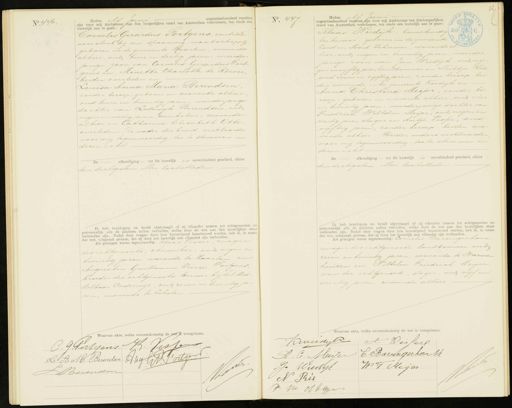 No. 446. Heden elf Juni negentienhonderd veertien zijn voor mij Ambtenaar Van den burgerlijken stand van Amsterdam verschenen, ten einde een huwelijk aan te gaan: Cornelis Gerardus Portgens, contröle assestent bij een spoorweg. maatschappij geboren in de gemeente Haarlem, wonende alhier, oud twee en dertig jaren, meerder jarige zoon van Cornelis Gerardus Port„ gens en Minette Charlotte de Röever, beiden overleden en Louisa Anna Maria Berendsen, zonder beroep, geboren en wonende alhier oud twee en twintig jaren, meerderjarige dochter van Lodewijk Berendsen, oud negen en veertig jaren, winkelier, wonende alhier en Catharina Elisabeth Otte overleden. De vader der bruid verklaarde voor mij tegenwoordig, toe te stemmen en dezen echt De afkondiging — tot dit huwelijk is onverhinderd geschied, alhier den dertigsten Mei laatstleden Ik heb bruidegom en bruid afgevraagd of zij elkander nemen tot echtgenooten en getrouwelijk alle de plichten zullen vervullen, welke door de wet aan den huwelijken stad verbonden zijn. Nadat deze vragen door hen bevestigend beantwoord werden, heb ik, in naar der wet, uitspraak gedaan, dat zij door het huwelijk aan elkander zijn verbonden. Als getuigen waren tegenwoordig: Klaas Visier, zwager des echtgenoots, chemiker, oud negen en twintig jaren, wonende te Haarlem en Augustin Guillaume Pierre Portgens, broeder des echtgenoots, beeraar bij het Mid- delbaar Onderwijs, oud zeven en twintig ja ren, wonende te Schoten OozS No. 447 Heden elf Juni negentienhonderd veertien zijn voor mij Ambtenaar van den burgerlijken stand van Amsterdam verschenen, ten einde een huwelijk aan te gaan: Klaas Wiedijk, bouwkundig. teekenaar, geboren in de gemeente Zuid en Noord. Schermer, wonende al hier, oud negen en twintig jaren, meerder jarige zoon van Jan Wiedijk, oud ne gen envijftig jaren, landbouwer en Neeltje Ris oud zeven en vijftig jaren, zonder beroep, bei den wonende inde gemeente Koedijk en Anna Christina Meijer, zonder be roep, geboren en wonende alhier, oud vier en twintig jaren, meerderjarige dochter van Friedrich Wilhelm Meijer, oud negen en veertig jaren, slager en Antje Visser, oud vijftig jaren, zonder beroep, beiden wo nende alhier, Beider ouders verklaarden voor mij tegenwoordig, toe te stemmen in dezen echt De afkondiging — tot dit huwelijk is onverhinderd geschied, alhier den dertigsten Mei laatstleden Ik heb bruidegom en bruid afgevraagd of zij elkander nemen tot echtgenooten en getrouwelijk alle de plichten zullen vervullen, welke door de wet aan den huwelijken staan verbonden zijn. Nadat deze vragen door hen bevestigend beantwoord werden, heb ik, in naam der wet, uitspraak gedaan, dat zij door het huwelijk aan elkander zijn verbonden. Als getuigen waren tegenwoordig: Cornelis Bartingerharn zwager des echtgenoots, landbouwer, oud zeven en twintig jaren, wonende te Warmen huizen en Wilhelm Friedrich Meijer oom der echtgenoote, slager, oud vijf en veertig jaren, wonende alhier Waarvan akte, welke overeenkomstig de wet is voorgelezen. Waarvan akte, welke overeenkomstig de wet is voorvolenen. C. J Portgens K. Vessen L B. M. Berendan Au9 W.Poitgens 71