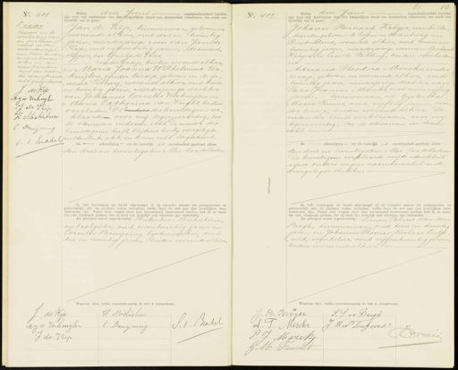 No. 401 ¶vader Renvooi en de doorhaling van een geschreven woord in den zestienden regel van boven en van een geschreven letter in den zeventienden regel van boven; in nevensstaande akte goedgekeurd J. de Kip H J/ w Verhuijlen J Me e 5 H Mietielsen C. Bruyning J. v. Biakel Heden drie Juni negentienhonderd veertien zijn voor mij Ambtenaar van den Burgerlijken stand van Amsterdam verschenen, ten einde een huwelijk aan te gaan: Jan de Kin, timmerman, geboren en jaren, meerderjarige zoon van Jan de wonende alhier, oud drie en twintig Kip, oud vijfenveertig jaren, diamant, „slijper, en Grietje de Vries, — zonder beroep, beiden wonende alhier en Maria Joanna Wilhelmina Ver „kuijlen zonder beroep, geboren in de ge„ „meente Tilburg, wonende alhier, oud twee en twintig jaren, meerderjarige dochter van Johannes Cornelis Verkuijlen en Maria Catharina van Vught, beiden overleden. De ouders des bruidegoms ver„ „klaarden, voor mij tegenwoordig; toe te stemmen in dezen echt. De moeder des bruidegoms heeft, blijkens hierbij overgelegde authentieke akte, in dezen echt toegestemd. De afkondiging — tot dit huwelijk is onverhinderd geschied, alhier den drie en twintigsten Mei laatstleden. Ik heb bruidegom en bruid afgevraagd of zij elkander nemen tot echtgenooten en getrouwelijk alle de plichten zullen vervullen, welke door de wet aan den huwelijken staat verbonden zijn. Nadat deze vragen door hen bevestigend beantwoord werden, heb ik, in naam der wet, uitspraak gedaan, dat zij door het huwelijk aan elkander zijn verbonden Als gebuigen waren tegenwoordig: Hubertus Michielsen, metaalgieter, oud zesentwintig jaren en Cornelis Bruijning lijstenmaker oud drie en twintig jaren, beiden wonende alhier, Waarvan akte, welke overeenkomstig de wet is voorgelezen. NNo. 402 Heden drie Juni negentienhonderd veertien zijn voor mij Ambtenaar van den burgerlijken stand van Amsterdam verschenen, ten einde een huwelijk aan te gaan: Johann Bernard Kroger, winkelbe diende, geboren te Essen in Oldenburg in Duitschland, wonende alhier, oud zeven en twintig jaren, meerderjarige zoon van Gerhard Kroger en Lisette Tahling, beiden overleden en Adriana Theodora Mercks, zonder beroep, geboren en wonende alhier, oud twintig jaren, minderjarige dochter van Pieter Joannes Mercks, oud zes en vijftig jaren, — timmerman, en Gijsbertha Maria Pennet, oud vijftig jaren, zon der beroep, beiden wonende alhier, De ouders der bruid verklaarden, voor mi tegenwoordig, toe te stemmen in dezen echt. afkondiging — tot dit huwelijk is onverhinderd geschied, alhier den drie en twintigsten Mei laatstleden De bruidegom verklaarde mijde identiteit zijner ouders wegens naamsverschil in de overgelegde stukken. Ik heb bruidegom en bruid afgevraagd of zij elkander nemen tot echtgenooten en getrouwelijk alle de plichten zullen vervullen, welke door de wet aan den huwelijken staat verbonden zijn. Nadat deze vragen door hen bevestigend beantwoord werden, heb ik, in naam der wet, uitspraak gedaan, dat zij door het huwelijk aan elkander zijn verbonden Als getuigen waren tegenwoordig: Sinon Petrus van der Bergh, timmerman, oud twee en twintig jaren en Johannes Thonas Nicolaas Lutje- veld, winkelier, oud vijfentwintig jaren, beiden wonende alhier Waarvan akte, welke overeenkomstig de wet is voorgelezen. H. Micliatreu J de Rijs S.t. Brakel C. Bruining MJ W. Verkuijlen J de Jrij J. B. Kroier J.J vd Dergh J. Ke Lugevek A.T. Mercks. 0 Brivers P Merik G M Fenroet