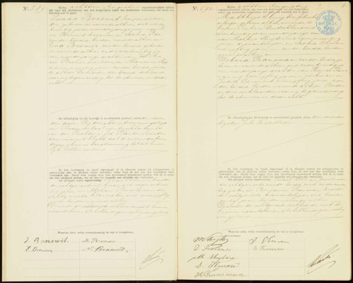 No. 589 Heden achttien Rugustus negentienhonderd vijftien zijn voor mij Ambtenaar van den burgerlijken stand van Amsterdam verschenen, ten einde een huwelijk aan te gaan: Isaac Boneurt, lompensorteer, der, geboren en wonende alhier, oud vierentwintig jaren, meerderjarige zoon van Le vie Bonewit, koopman, en Sophia Roezonder beroep beiden wonende alhier, en Ova Bremer zonder beroep, geboren en wonende alhier, oud vierentwintig jaren, meerderjarige dochter van Joel Mozes Bremer, overleden, en Marianna Slap, oud vierenzestig jaren, zonder beroep, wonende alhier. De moeder der bruid verklaarde, voor mij tegenwoordig, toe te stemmen in dezen echt De afkondiging tot dit huwelijk is onverhinderd geschied, alhier den zevenden dezer. Bij deze akte is tevens overgelegd een Proces-verbaal van tusschenkomst van den Rechter in het Kanton Amster dam, waaruit blijkt, dat de ouders des bruidegoms hunne toestemming tot dit huwelijk hebben verleend Ik heb bruidegom en bruid afgevraagd of zij elkander nemen tot echtgenooten en getrouwelijk alle de plichten zullen vervullen, welke door de wet aan den huwelijken staat verbonden zijn. Nadat deze vragen door hen bevestigend beantwoord werden, heb ik, in naam der wet, uitspraak gedaan, dat zij door het huwelijk aan elkander zijn verbonden. Als getuigen waren tegenwoordig: Mezes Bremer broeder der echtgenoote werkman oud negen entwintig jaren en Nathan Boneit, oom des echtgenoots, kleermaker, oud zesenvijftig jaren, beiden wonende alhier De moeder der echtgenoote verklaarde niet te kunnen naamteekenen, als hebbende geen schrijven geleerd. ig de wet is voorgelezen. an akte, welke over No. 590 eden achttien negentienhonderd vijftien zijn voor mij Ambtenaar van den burgerlijken stand van Amsterdam verschenen, ten einde een huwelijk aan te gaan: Matthijs Sluijter, fabrieks arbeider, geboren alhier, wonende te Essen- Ruhr in Duitschland, oud zesentwintig jaren, meerderjarige zoon van Markus Sluijter oud zevenenveertig jaren, diamantsnijder, en Sophia Olman rid vijftig jaren zonder beroep, beiden wonende alhier, en Debora Transman, zonder beroep, geboren en wonende alhier, oud zesentwintig ja ren meerderjarige dochter van Heiman Frans man, oud zesenvijftig jaren — werkman, en Judith Canes, oud zesenvijftig jaren, zon der beroep, beiden wonende alhier. Beider ouders verklaarden, voor mij tegenwoordig. tal te stemmen in dezen echt. De afkondiging tot dit huwelijk is onverhinderd geschied, alhier den eenender tigsten Juli laatstleden Ik heb bruidegom en bruid afgevraagd of zij elkander nemen tot echtgenooten en getrouwelijk alle de plicliten zullen vervullen, welke door de wet aan den huwelijken staat verbonden zijn. Nadat deze vragen door hen bevestigend beantwoord werden, heb ik, in naam der wet, uitspraak gedaan, dat zij door het huwelijk aan elkander zijn verbonden. Als getuigen waren tegenwoordig: Ssrael Olman groot vader des echtgenoots zonder beroep, oud zesenzeven tig jaren, en Benjamin Fransman, broeder der echtgenoote, diamantslijper, oud tweeën dertig jaren, beiden wonende alhier Demoeder der echtgenoote verklaarde, niet te kunnen naamteekenen, als hebbende geen schrij ven geleerd M Bremer J. Banewit. N: Ronewet E. Bremer 1 Wigter J Olorsan D: Fransman B: Oransman Me Bluytere D: Elman H Frans man