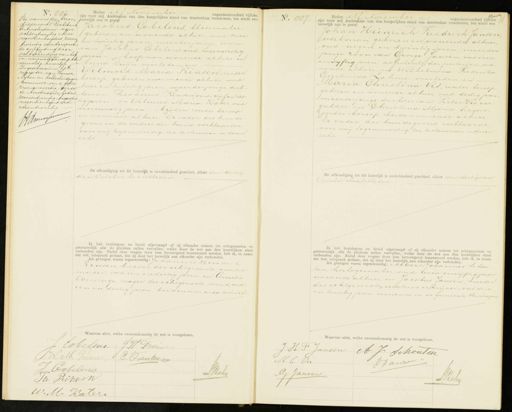 No. 807 dissements. Rechtbank 11 06 Bij vonnis der Arron¬ te Amsterdam van achtentwintig Mei negentienhonderd zesen twintig is uitgesproke de ontkinding door echtscheiding van het in nevensstaande akte vermelde huwelijk. Ingeschreven in het register van Huwe„ „lijken en ochtscheidingen nummer een a, folio zevenenveertig vers te Amsterdam, heden zevenentwintig Augustus negentienhonderd zesentwintig H doger Heder el November neentendenden wieg Jacobus Cabelens kleermaker, zijn voor mij Ambtenhar van den burgerlijken stand van Amsterdam verschenen, ten einde een en huwelijk aan te gaan ei geboren en wonende alhier, oud twee den en twintig jaren, meerderjarige zoon rote van Jacobus Cobelens, oud twee enzestig jaren. — koopman, wonende alhier, en Anna Duijn, overleden en Ekter Welmoed Maria Prinsen, zonder beroep, geboren en wonende alhier, oud ne 4is twee en twintig jaren meerderjarige doch ter van Theodorus Pinsen, oud vijf en zes- gjaren. en Welmoed Maria Kater, oud strs vierenzestig jaren. - beiden zonder beroep en wonende alhier. De vader zes bruide goms en de ouders der bruid verklaarden, voor mij tegenwoordig, toe te stemmen in dezen echt De afkondiging tot dit huwelijk is onverhinderd geschied, alhier den dertig sten October laatstleden Ik heb bruidegom en bruid afgevraagd of zij elkander nemen tot echtgenooten en getrouwelijk alle de plichten zullen vervullen, welke door de wet aan den huwelijken staat verbonden zijn. Nadat deze vragen door hen bevestigend beantwoord werden, heb ik, in naam der wet, uitspraak gedaan, dat zij door het huwelijk aan elkander zijn verbonden. Ds getuigen waren tegenwoordig: Johannes Hendriu rinsen, broeder der echtgenoote, meubie maker, oud een endertig jaren, en Cornelis Oversteege, zuager der echtgenoote, smid, oud een en dertig jaren, beiden wonende alhier. Waarvan -" welke overeen"moctig de wet is No. 887 Heden elf November negentienhonderd vijftien zijn voor mij Ambtenaar van den burgerlijken stand van Amsterdam verschenen, ten einde een huwelijk aan te gaan. Johan Heinrich Friedrich Jansen werkman, geboren en wonende alhier. oud negen en twintig jaren, meerder jarige zoon van George Jansen, oudvier envijftig jaren, assistent der posterijen, wo nende alhier, en Wilhelmina Frederika Geertruida Zahme, overleden, en Maria Christina Vis, zonder beroep geboren en wonende alhier oud dertig jaren meerderjarige dochter van Pieter Vis, ver gulder, en Christina Maria Siegers, zonder beroep, beiden wonende alhier. De vader des buuidegoms verklaarde voor mij tegenwoordig, toe testemmen in dezen echt. De afkondiging tot dit huwelijk is onverhinderd geschied, alhier den dertigsten cober laatstleden Ik heb bruidegom en bruid afgevraagd of zij elkander nemen tot echtgenooten en getrouwelijk alle de plichten zullen vervullen, welke door de wet aan den huwelijken staat verbonden zijn. Nadat deze vragen door hen bevestigend beantwoord werden, heb ik, in naam der wet, uitspraak gedaan, dat zij door het huyelijk aan elkander zijn verbonden. Als getuigen waren tegenwoordig: Albert Johannes Schdi ten, horlogemaker, oud zeven envijftig jaren wonende alhier, en Jacobus Jansen, broeder des echtgenoots, mahoos schrijver, oud drie en twintig jaren, wonende in de gemeente Vlissingen akte, welke overeenkomstig de wet is voorgelezen. J„ Cobelens. JJ Trins J.W. M. Krinser .C. Overteeg J Cobelens Arake Jn Prikpen W. M. Kater rgelezen. J: H:F Jansen A J Schouten M C Vis Bander. P. Jansen. Azah