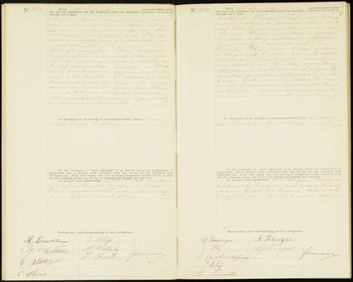 No. 883 negentienhonderd vijftien Heden zijn voor mij Ambtenaar van den burgerlijken stand van Amsterdam verschenen, ten einde een huwelijk aan te gaan: Meijer Lever, diamantslijper, gebo ren en wonende alhier, oud een entwin tig jaren, meerderjarige zoon van Mo zes Lever, overleden en Eva Plotz oud drie en vijftig jaren, winkelierster, wo- nende alhier en Grietje van der Kar, zonder be roep, geboren en wonende alhier, oud twintig jaren, minderjarige dochter van Hartog van der Kar, overleden en Clara Sluis, oud twee en veertig jaren, zonder be roep, wonende alhier. De moeder des brui de goms, de moeder der bruid en de voogd derbruid, met name Isaac slap, koop man, oud twee en veertig jaren, wonende alhier, verklaarden, voor mij tegenwoordig toe te stemmen in dezen echt. De afkondiging tot dit huwelijk is onverhinderd geschied, alhier den der tigsten October laatstleden Ik heb bruidegom en bruid afgevraagd of zij elkander nemen tot echtgenooten en getrouwelijk alle de plichten zullen vervullen, welke door de wet aan den huwelijken staat verbonden zijn. Nadat deze vragen door hen bevestigend beantwoord werden, heb ik, in naam der wet, uitspraak gedaan, dat zij door het huwelijk aan elkander zijn verbonden. Als getuigen waren tegenwoordig: Nathan Polak, winke lier, oud acht en veertig jaren en Izaac Pront, roosjesversteller, oud achtenveertig jaren, beiden wonende alhier Waarvan akte, welke overeenkomstig de wet is voorgelezen. No. 884. Heden el zijn voor mij Ambtenaar van den burgerlijken stand van Amsterdam verschenen, den einde een huwelijk aan te gaan: Gribbert: Ranger, hofmeester ter koop vaardij, geboren en wonende alhier, oud vijf en twintig jaren, meerderjarige zoon van Barend Kanger, overleden en Sjoukje Gribbets de Jong, oud twee en vijftig jaren zonder beroep, wonende alhier en Grietje Blij, zonder beroep, geboren in de gemeente Kampen, wonende alhier oud twee en twintig jaren, meerderja rige dochter van Jan Blij, oud acht en vijftig jaren, huisschilder en Sipkjen Ko renstra, oud acht en vijftig jaren, zonder beroep, beiden wonende alhier, De moe der des bruidegoms en de ouders der bruid verklaarden, voor mij tegenwoordig, toe te stemmen in dezen echt De afkondiging tot dit huwelijk is onverhinderd geschied, alhier den dertig sten October laatstleden Ik heb bruidegom en bruid afgevraagd of zij elkander nemen tot echtgenooten er getrouwelijk alle de plichten zullen vervullen, welke door de wet aan den huwelijken staat verbonden zijn. Nadat deze vragen door hen bevestigend beantwoord werden, heb ik, in naam der wet, uitspraak gedaan, dat zij door het huwelijk aan elkander zijn verbonden. Als getuigen waren tegenwoordig: Arie Ranger, broeder des echtgenoots, koopman, oud twee en twintig jaren en Gijsbertus Zeegers, bode, oud een envijftig jaren, beiden wonende alhier Waarvan akte, welke overeenkomstig de wet is voorgelezen. J: Alap M. Levez N. Poluk G. v de Kan falzeneensen J. Pront C. Oloerj C Sluis A: Ranger. G Kanger G: Zeegers G. Blij faezeneon E Gribberts de Jong. J Blij nstra