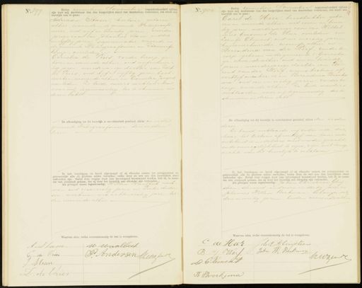 No. 899 Heden zeventien tovember negentienhonderd vijfie zijn voor mij Ambtenaar van den burgerlijken stand van Amsterdam verschenen, ten einde een huwelijk aan te gaan: Adriaan Stam, koetsier geboren alhier, wonende in de gemeente Watergraafs- meer, oud vijf en twintig jaren, meerder jarige zoon van Johannes Stam, oud drie envijftig jaren, tigarenmaker, wonende in de gemeente Watergraafsmeer en Dieuwertje Kemp, overleden en Cornelia de Vries zonder beroep, ge- boren en wonende alhier, oud vijfentwin- tig jaren, meerderjarige dochter van Dirk de Vries, oud vijf en vijftig jaren, boot- werker, wonende alhier en Cornelia Jongert, overleden. De beide vaders verklaarden voor mij tegenwoordig, toe te stemmen in dezen echt. De afkondiging tot dit huwelijk is onverhinderd geschied, alhier en in de gemeente Watergraafsmeer, den zesden dezer Ik heb bruidegom en bruid afgevraagd of zij elkander nemen tot echtgenooten en getrouwelijk alle de plichten zullen vervullen, welke door de wet aan den huwelijken staan verbonden zijn. Nadat deze vragen door hen bevestigend beantwoord werden, heb ik, in naar der wet, uitspraak gedaan, dat zij door het huwelijk aan elkander zijn verbonden. Als getuigen waren tegenwoordig: Willem Waalbeek werk- man, oud zesenzestig jaren en Pieter Ander- sen, werkman, oud achtenzestig jaren, bei den wonende alhier Waarvan akte, welke overeenkomstig de wet is voorgelezen. No. 900 mber negent Heden zeventig zijn voor mij Ambtenaar van den burgerlijken stand van Amsterdam verschenen, ten einde een/ huwelijk aan te gaan: Carel de Heer, broodbakker gebo ren en wonende alhier, oud zeven en twin tig jaren, meerderjarige zoon van Wilhel mus Erasmus de Heer, overleden en Leentje Clement, oud vier enzestig jaren kamerverhuurster, wonende alhier en Berendina van der Verf, zonder be roep, geboren in de gemeente T- Gravenha ge, wonende alhier, oud een en twintig jaren, meerderjarige dochter van Be rend van der Verf, wiens bestaan of verblijf onzeker is en Berendina Broeks ma, oud een en zestig jaren, zonder be roep, wonende alhier. De beide moeders verklaarden, voor mij tegenwoordig, toe te stemmen in dezen echt De afkondiging tot dit huwelijk is onverhinderd geschied, alhier den zesden dezer. De bruid verklaarde mij onder eede, dat haar het bestaan of verblijf van haar vader onbekend is en dat deze moet worden geacht in de onmogelijkheid te zijn, zijn wil ten op zichte van dit huwelijk te verklaren. Ik heb bruidegom en bruid afgevraagd, of zij elkander nemen tot echtgenooten en getrouwelijk alle de plichten zullen vervullen, welke door de wet aan den huwelijken staat verbonden zijn. Nadat deze vragen door hen bevestigend beantwoord werden, heb ik, in naam der wet, uitspraak gedaan, dat zij door het huwelijk aan elkander zijn verbonden. als getuigen waren tegenwoordig: Johan Christiaan Gluij. steen, steward, oud zeven en dertig jaren en Johannes Willem Berkman, behanger, oud drie enveertig jaren, beiden wonende alhier Waarvan akte, welke overeenkomstig de wet is voorgelezen. W Waalbeek AStam P Andersen Lziogtar C de Vries J Mran D. dte Chies C de Heer Joh Gluistees B JJ Werf Jahor W. Berkman Va Warende D Ellement B Boeksma
