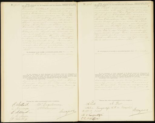 No. 905. Heden achttien November negentienhonderd vijftien, zijn voor mij Ambtenaar van den burgerlijken stand van Amsterdam verschenen, ten einde een huwelijk aan te gaan Cornelis Sollart, goudsmid, geboren in de gemeente Loenen, wonende in de ge„ meente Rotterdam, oud vier en twintig jaren, meerderjarige zoon van Cornelis Sollart, oud vijftig jaren, — tram wagenbestuurder en Johanna Antonia Meijer, oud negen enveertig jaren, zonder beroep, beiden wonende alhier en Cornelia Marrenga, zonder beroep, geboren te Koudum, gemeente Hemelumer Oldephaert en Noordwolde, wonende al- hier, oud vijfentwintig jaren, meerder jarige dochter van Cornelis Marrenga overleden en Jacobje Vieling, oud twee enzestig jaren, zonder beroep, wonende alhier De ouders des bruidegoms en de moeder der bruid verklaarden, voor mij tegenwoordig, toe te stemmen in dezen Echt De afkondiging tot dit huwelijk is onverhinderd geschied, alhier en in de gemeente Rotterdam, den zesden dezer Ik heb bruidegom en bruid afgevraagd of zij elkander nemen tot echtgenooten en getrouwelijk alle de plichten zullen vervullen, welke door de wet aan den huwelijken staat verbonden zijn. Nadat deze vragen door hen bevestigend beantwoord werden, heb ik, in naam der wet, uitspraak gedaan, dat zij door het huwelijk aan elkander zijn verbonden Als getuigen waren tegenwoordig: Willem Engelsman kruier, oud twee en vijftig jaren en Alfert Marrenga, broeder der echtgenoote, banket- bakker, oud vijfendertig jaren, beeiden wo- nende alhier. No. 906 Heden achttien zijn voor mij Ambtenaar van den burgerlijken stand van Amsterdam verschenen, ten einde een huwelijk aan te gaan: Arie Post, wagenmaker, geboren en wo- nende alhier, oud vijf en twintig jaren, meer derjarige zoon van drie Post, overleden en Anna Maria Elisabeth Tier, oud zes en veertig jaren, zonder beroep, wonende alhier en Maria Christina van Kamperdijk zonder beroep, geboren en wonende alhier oud zeven en twintig jaren, meerderjarige dochter van Matthijs van Kamperdijk, oud vier en zestig jaren, pakhuisknecht en Cor nelia Clara van Dalfsen, oud achtenvijf tig jaren, zonder beroep, beiden wonende alhier De moeder des bruidegoms en de ouders der bruid verklaarden, voor mij tegenwoordig toe te stemmen in dezen echt geschied, alhier den zesden De afkondiging tot dit huwelijk is onverl dezer Ik heb bruidegom en bruid afgevraagd of zij elkander nemen tot echtgenooten en getrouwelijk alle de plichten zullen vervullen, welke door de wet aan den huwelijken staat verbonden zijn. Nadat deze vragen door hen bevestigend beantwoord werden, heb ik, in naam der wet, uitspraak gedaan, dat zij door het huwelijk aan ekander zijn verbonden. Als getuigen waren tegenwoordig: Arie Sier grootvader des echtgenoots, zonder beroep, oud zes en zeventig jaren en Antonius Franciscus van Kamperdijk, broeder der echtgenoote schoenmaker, oud twee en dertig jaren, bei den wonende alhier Waarvan akte, welke overeenkomstig de wet is voorgelezen. aarvan akte, welke or W. Engeleman. C. SollaH. MMarienga C Marrenga. bawgend C Sollart J. A. Meijer J Wieling A Pier A. Gort. MC v. Kamperdijk A.H van Ramurdijk OZWaserof dml Pier M v Krampenllijk C C: V Dolfjen