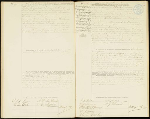 No. 912 ovember negentienhonderd vijftig Heden achttien zijn voor mij Ambtenaar van den burgerlijken stand van Amsterdam verschenen, ten einde een huwelijk aan te gaan: Peter Josephus Lodewijk Coppen broodbakker, geboren in de gemeente Hel: mond, wonende in de gemeente Eindhoven, oud negen en dertig jaren, weduwnaar van Hendrika Maria de Beer, meerderjarige zoon van Hendricus Coppen en Catharina Kooken, beiden overleden en Antonetta Maria Dirks, zonder be roep, geboren en wonende alhier, oud ne gen en dertig jaren, meerderjarige doch ter van Paulus Dirks en Maria Elisa beth Claassen, beiden overleden De afkondiging tot dit huwelijk is onverhinderd geschied, alhier en in de gemeente Eindhoven, den zesden dezer Ik heb bruidegom en bruid afgevraagd of zij elkander nemen tot echtgenooten en getrouwelijk alle de plichten zullen vervullen, welke door de wet aan den huwelijken staat verbonden zijn. Nadat deze vragen door hen bevestigend beantwoord werden, heb ik, in naam der wet, uitspraak gedaan, dat zij door het huwelijk aan elkander zijn verbonden. Als getuigen waren tegenwoordig: Idrianus Tranciscus Maria Dirks, broeder der echtgenoote vleeschhouwer, oud zesendertig jaren en Cornelis Everhardus Snijders, zwaaerder echtgenoote, vleeschhouwer, oud zeven en dertig jaren, beiden wonende alhier van akte, welke overeenkomstig de wet is voorgelezen. Bijvonmisder Arron. dissements Rechtbank te Amsterdam van vijf Maart negentien „honderd zesentwintig is uitgesproken de ontbending door echt. scheiding van het in nevensstaande akte vermelde huwelijk Ingeschreven in het „ken en Echtscheidingen register van Huwelij nummer een a, folio twaalf verso te Am„ „sterdam, heden zeven Juni negentienhon„ derd zesentwintig. Avzahg vembe Heden achttien negentienhonderd vijftien zijn voor mij Ambtenaar van den burgerlijken stand van Amsterdam verschenen, ten einde een huwelijk aan te gaan: & Louis Andries Holst, kellner, geboren en wonende alhier, oud vijf en twintig jaren, meerderja „rige zoon van Pieter George Holst oud een en vijftig jaren, bronser, wonen alhier en Anna Maria van Paassen &overleden en „Johanna Margaretha Coosen zonder beroep, geboren en wonende alhier „ oud twee en twintig jaren, meerderja „rige dochter van Christiaan Loosen „oud zes en vijftig jaren, kellner en Mar garetha Elisabeth Lipplaa, oud een en vijftig jaren, zonder beroep, beiden wonen de alhier. De vader des bruidegoms ende ouders der bruid verklaarden, voor mij tegenwoordig, toe te stemmen in dezen echt De afkondiging tot dit huwelijk is onverhinderd geschied, alhier den dertien den dezer Bij deze akte is tevens overgelegd een beschikking van den Officier van Justi tie bij de Arrondissements-Rechtbank te Amsterdam, van zestien dezer, waar bij dispensatie is verleend van een gedeel- te van den, in artikel honderd dertig van het Burgerlijk Wetboek voorgeschreven wachttijd. Ik heb bruidegom en bruid afgevraagd of zij elkander nemen tot echtgenooten en getrouwelijk alle de plichten zullen vervullen, welke door de wet aan den huwelijken staat verbonden zijn. Nadat deze vragen door hen bevestigend beantwoord werden, heb ik, in naam der wet, uitspraak gedaan, dat zij door het huwelijk aan elkander zijn verbonden, Als getuigen waren tegenwoordig: Sicolaas Louis Holst, droe der des echtgenoots, melkbezorger, oud ze ven en twintig jaren en Louis Jacques Re- nard, badbediende, oud drie enveertig ja ren, beiden wonende alhier Waarvan akte. welke overeenkomstig de wet is voorgelezen. Waarvan akte, welke overeenkomstig de wet is voorgelezen. A. P. M. Dirk P.J Le Coppen CE Sniders A M Dirks OZWofed