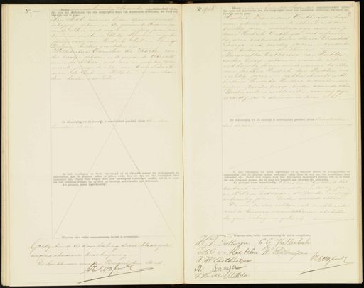 November negen ijftie Ieden vier en zijn voor mij Ambtenaar van den burgerlijken stand van Amsterdam verschenen, ten einde een huwelijk aan te gaan: drie Mol, remmer bij een spoorwegmaat- schappij geboren in de gemeente Baarn, wo- nende alhier, oud negen en vijftig jaren( we- duwnaar van Anna Alida Lijman, meerder jarige zoon van Hendrik Mol en Teunisje Breijer, beiden overleden en Wilhelmina Cornelia de Korte, zon der beroep, geboren in de gemeente Utrecht wonende alhier, oud vier en veertig jaren meerderjarige dochter van Everardus Si- mon de Korte en Wilhelmina van Voor den, beiden overleden De afkondiging tot dit huwelijk is onverhinderd geschied, alhier den der tienden dezer Ik heb bruidegom en bruid afgevraagd of zij elkander nemen tot echtgenooten en getrouwelijk alle de plichten zullen vervullen, welke door de wet aan den huwelijken staat verbonden zijn. Nadat deze vragen door hen bevestigend beantwoord werden, heb ik, in naam der wet, uitspraak gedaan, dat zij door het huwelijk aan elkander zijn verbonden. Als getuigen waren tegenwoordig: Waarvan akte, welke overeenkomstig de wet is voorgelezen. gekeurd de doorhaling dezer bladzijde, No. 916 ntig November negentie leden vier en zijn voor mij Ambtenaar van den burgerlijken stand van Amsterdam verschenen, ten einde een huwelijk aan te gaan: Hendrik Franciscus Outhuyse, koop„ man, geboren en wonende alhier, oud een en twintig jaren, meerderjarige zoon van Jo hann Hendrik Outhuijse oud vijf enveer tig jaren, kastenmaker en Maria Elisabeth Sargo, oud veertig jaren, — zonder be roep, beiden wonende alhier en Margaretha Catharina van Meetelen zonder beroep, geboren en wonende alhier oud twintig jaren, minderjarige dochter van Jacobus Hendrik van Meetelen, oud veertig jaren, — pakhuisknecht en Al- berdina Hendrika Heuders, oudacht en der tig jaren, zonder beroep, beiden wonende alhier Beider ouders verklaarden, voor mij tegen- woordig, toe te stemmen in dezen echt schied, alhier den dertien De afkondiging tot dit huwelijk is onver den dezer Ik heb bruidegom en bruid afgevraagd of zij elkander nemen tot echtgenooten en getrouwelijk alle de plichten zullen vervullen, welke door de wet aan den huwelijken staan verbonden zijn. Nadat deze vragen door hen bevestigend beantwoord werden, heb ik, in naam der wet, uitspraak gedaan, dat zij door het huwelijk aan elkander zijn verbonden. Als getuigen waren tegenwoordig: Christian Gottlieb Kal. lenbach, werkman, oud drie endertig jaren en Willem Ditmeijer, stoffeerder, oud vijf- entwintig jaren, beiden wonende alhier De moeder der echtgenoote verklaarde niet te kunnen naamteekenen, als hebben. de geen schrijven geleerd Goedgekeurd de doorhaling dezer bladzijde wegens abusieve beschrijving De Ambtenaar van den Burgerlijken Stand. KZWaterstr arvan akte, welke overeenkomstig de wet is voorgelezen. H.F. Puthuize C G Kallenboek M C v Meetelen W. ODitweijler Vologberde IH Oithuizse M Kanga J H van Meetete