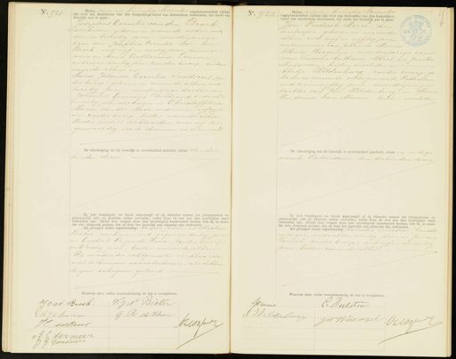 No. 921 Heden vier en twintig November negentienhonderd vijftien, zijn voor mij Ambtenaar van den burgerlijken stand van Amsterdam verschenen, ten einde een huwelijk aan te gaan: Josephus Cornelis van den Broek werkman, geboren en wonende alhier, oud drie en twintig jaren, meerderjarige zoon van Josephus Cornelis van, den Broek, oud vijf en veertig jaren, timmer man en Anna Catharina Sermeer oud zes en veertig jaren, zonder beroep, beiden wonende alhier en Maria Johanna Cornelia Smedicus, zon der beroep, geboren en wonende alhier, oud twintig Jaren, minderjarige dochter van Johannes Gerardus Smedicus, oudacht en veertig jaren, werkman en Christoffelina Maria van der Moor, oud vier en vijftig ja- ren, zonder beroep, beiden wonende alhier Beider ouders verklaarden, voor mij te genwoordig, toe te stemmen in dezen echt De afkondiging tot dit huwelijk is onverhinderd geschied, alhier den der tienden dezer Ik heb bruidegom en bruid afgevraagd of zij elkander nemen tot echtgenooten en getrouwelijk alle de plichten zullen vervullen, welke door de wet aan den huwelijken staat verbonden zijn. Nadat deze vragen door hen bevestigend beantwoord werden, heb ik, in naam der wet, uitspraak gedaan, dat zij door het huwelijk aan elkander zijn verbonden. Als getuigen waren tegenwoordig: Kasper Johannes Sicolaas Bicker, werkman, oud negen en dertig jaren en Gijsbert Reijer de Haan, zonder beroep oud zestig jaren, beiden wonende alhier. De moeder der echtgenoote verklaarde niet te kunnen naamteekenen, als hebben de geen schrijven geleerd, Waarvan akte, welke overeenkomstig de wet is voorgelezen. No. 922 Heden vier en twintig November 2 negentienhonderd vijftien zijn voor mij Ambtenaar van den burgerlijken stand van Amsterdam verschenen, ten einde een huwelijk aan te gaan: Jan Frederik Morre, kan toorlooper, geboren en wonende alhier, oud vijf en vijftig jaren weduwnaar van Johanna Maria Alberta Hoogeveen, meerderjarige zoon van Servaas Anthonie Morré en Jacoba Huijsman, beiden overleden en Aartje Wildenburg, zonder beroep, ge boren en wonende in de gemeente Rotterdam, oud zes en vijftig jaren, meerderjarige dochter van Jan Wildenburg en Maria Hendrina van Almen, beiden overleden De afkondiging tot dit huwelijk is onverhinderd geschied, alhier en in de ge meente Rotterdam, den dertienden dezer Ik heb bruidegom en bruid afgevraagd of zij elkander nemen tot echtgenooten en getrouwelijk alle de plichten zullen vervullen, welke door de wet aan den huwelijken staat verbonden zijn. Nadat deze vragen door hen bevestigend beantwoord werden, heb ik, in naam der wet, uitspraak gedaan, dat zij door het huwelijk aan elkander zijn verbonden. Als getuigen waren tegenwoordig: Cornelis Deelstra, handels reiziger, oud acht en veertig jaren en Jan van Toensel, zonder beroep, oud vijf en zeventig jaren, beiden wonende alhier Waarvan akte, welke overeenkomstig de wet is voorgelezen. oorgelezen. VJ N Bicker JC. v.S. Broek. GR de Haar M J.C. Smedicus AZWglener J EvdBroek Ctermeer J G Smedis mone C Veelster od Wilderzuig J: Woersel OZwarid