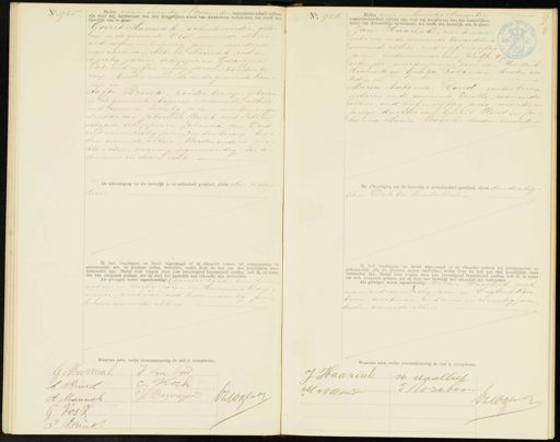 No. 925 Heden vier en twintig ovember negentienhonderd vijftien zijn voor mij Ambtenaar van den burgerlijken stand van Amsterdam verschenen, ten einde een huwelijk aan te gaan: Gerrit Mannak, schuitevoerder, gebo- ren in de gemeente Olst, wonende alhier oud negen en twintig jaren, meerderja rige zoon van Albert Mannak, oud een enzestig jaren, schipper en Gerrigjen os, oud vijf en vijftig jaren, zonder be roep, beiden wonende in de gemeente Kam pen en Aafje Brink, zonder beroep, geboren in de gemeente Asperen, wonende alhier. oud zeven en twintig jaren, meerderjarige dochter van Johannes Brink, oud acht en zestig jaren, schipper en Johanna van Oord oud vier en zestig jaren, zonder beroep, bei- den wonende alhier, Beider ouders ver klaarden, voor mij tegenwoordig, toe te stemmen in dezen echt De afkondiging tot dit huwelijk is onverhinderd geschied, alhier den zesden dezer Ik heb bruidegom en bruid afgevraagd of zij elkander nemen tot echtgenooten en getrouwelijk alle de plichten zullen vervullen, welke door de wet aan den huwelijken staat verbonden zijn. Nadat deze vragen door hen bevestigend beantwoord werden, heb ik, in naam der wet, uitspraak gedaan, dat zij door het huwelijk aan elkander zijn verbonden Als getuigen waren tegenwoordig: Cornelis koch werkman oud een en veertig jaren, en Hermanus Baa meijer, werkman, oud twee enveertig jaren beiden wonende alhier Waarvan akte, welke overeenkomstig de wet is voorgelezen. J Van Oor k No. 926 Heden vier en twintig November negentienhonderd vijftien zijn voor mij Ambtenaar van den burgerlijken stand van Amsterdam verschenen, ten einde een huwelijk aan te gaan: Jan Haarink, werkman, geboren in de gemeente Zwartsluis wonende alhier, oud vijf envijftig. jaren. weduwnaar van Jantje Op scherper, meerderjarige zoon van Hendrik Haarink en Grietje Kolkman, beiden over leden en Maria Antonia Rond, zonder beroep, geboren in de gemeente Zwolle, wonende alhier, oud vijf envijftig jaren, meerder jarige dochter van Gerrit Rond en Jo hanna Maria Bosch, beiden overleden De afkondiging tot dit huwelijk is onverhinderd geschied, alhier den dertig sten October laatstleden Ik heb bruidegom en bruid afgevraagd of zij elkander nemen tot echtgenooten en getrouwelijk alle de plichten zullen vervullen, welke door de wet aan den huwelijken staat verbonden zijn. Nadat deze vragen door hen bevestigend beantwoord werden, heb ik, in naam der wet, uitspraak gedaan, dat zij door het huwelijk aan elkander zijn verbonden. Als getuigen waren tegenwoordig: Willem Waalbeek werk man, oud zesenzestig jaren en Engbert Roze boom, werkman, oud zeven en zeventig jaren beiden wonende alhier Waarvan akte, welke overeenkomstig de wet is voorgelezen. arink H. Maalber J Van Ord G Mannak C. Koch A. Brink VZWaterte H Bagmeyen A Mannak G Vost J Bunk voorgelezen. J. Hacrink n Maalbeek JWzeboor M A Rond Va Wotwo
