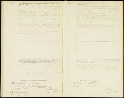 No. 929 Heden vijf en twintig November negentienhonderd vijftig zijn voor mij Ambtenaar van den burgerlijken stand van Amsterdam verschenen, ten einde een huwelijk aan te gaal: Dirk Scheick, agent van politie, gebo ren en wonende alhier, oud vier entwin tig jaren, meerderjarige zoon van Johannes scheick oud twee en vijftig jaren, kleer 0 maker en Margaretha Voordewind, oud drie envijftig jaren, zonder beroep, beiden wo- nende in de gemeente Weesp. en Alida van Kiessen, zonder beroep, g boren en wonende alhier, oud zeven en twin tig jaren, meerderjarige dochter van Cornelis van Riessen, oud zeven en vijftig jaren, werkman en Maria Catharina Jan ten, oudzes en vijftig jaren, zonder beroep beiden wonende alhier. Beider ouders ver klaarden, voor mij tegenwoordig, toe testem- men in dezen echt De afkondiging tot dit huwelijk is onverhinderd geschied, alhier den dertien den dezer Ik heb bruidegom en bruid afgevraagd of zij elkander nemen tot echtgenooten en getrouwelijk alle de plichten zullen vervullen, welke door de wet aan den huwelijken staat verbonden zijn. Nadat deze vragen door hen bevestigend beantwoord werden, heb ik, in naam der wet, uitspraak gedaan, dat zij door het huwelijk aan elkander zijn verbonden. Als getuigen waren tegenwoordig: Johannes dam, agent van politie, oud vier en twintig jaren en Hendrik Schoonhoven, agent van politie, oud vijf en twintig jaren, beiden wonende alhier. De vader der echtgenoote verklaarde niet te kunnen naamteekenen, als hebbende geen schrijven geleerd. Waarvan akte, welke overeenkomstig de wet i No. 930 eden vijfentwintig November negentig zijn voor mij Ambtenaar van den burgerlijken stand van Amsterdam verschenen, ten einde een huwelijk aan te gaan: Johannes Wilhelmus Hosman, werk man, geboren en wonende alhier, oud drie en veertig jaren, weduwnaar van Geertrui da Elisabeth Landwehr, meerderjarige zoon van Wilhelmus Mosman en Gerrit je van Dijk beiden overleden en Catharina Jape, zonder beroep, geboren in de gemeente Zaandam, wonende alhier, oud zeven en veertig jaren, weduwe van Bernardus Franciscus van Lint meer derjarige dochter van Gerrit Jape en Hillegonda Groot, beiden overleden. De afkondiging tot dit huwelijk is onverhinderd geschied, alhier den dertien den dezer Ik heb bruidegom en bruid afgevraagd of zij elkander nemen tot echtgenooten en getrouwelijk alle de plichten zullen vervullen, welke door de wet aan den huwelijken staan verbonden zijn. Nadat deze vragen door hen bevestigend beantwoord werden, heb ik, in naam der wet, uitspraak gedaan, dat zij door het huwelijk aan elkander zijn verbonden. Als getuigen waren tegenwoordig: Bernardus Franciuus van Lint, zoon der echtgenoote, winkelier oud zes en twintig jaren en Nicolaas Mosman zoondes echtgenoots, werkman, oud vier en twintig jaren, beiden wonende alhier. Waarvan akte, welke overeenkomstig de wet is voorgelezen. Vrauvan abfe wolke morembmstig de wet is voorgelezen. Joh Ham D Schuek A v Rreessen H: Schoonhan J Schuek Brives M. Voorde wind M E Janen Waarvan akte, welke overeenkomstig de wet is voorgelezen. J W: Mosman BA van Lint C. Dotee N. Morma JBrivel