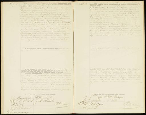 No. 935 Heden vijfentwintig ovember negentienhonderd vijfien zijn voor mij Ambtenaar van den burgerlijken stand van Amsterdam verschenen, ten einde een huwelijk aan te gaah: Gijsbert Remelink, zadelmaker, ge boren in de gemeente Purmerend, wonende alhier, oud zesentwintig jaren, meerder jarige zoon van Gijsbert Remelink, oud acht envijftig jaren werkman en Antie Rouw oud negen en vijftig jaren, zonder beroep, beiden wo- nende in de gemeente Wormerveer en Rebecca Johanna Gijsberta Weetzel, zonder beroep, geboren en wonende alhier, oud vier en twintig jaren, meerderjari„ gedochter van Pieter Albertus Weetzel oud een en vijftig jaren en Geertruida Banning, oud drie en vijftig jaren, beiden zonder beroep en wonende alhier. Bei„ der ouders verklaarden, voor mij tegen woordig, toe te stemmen in dezen echt. De afkondiging tot dit huwelijk is onverhinderd geschied, alhier den dertien den dezer Ik heb bruidegom en bruid afgevraagd of zij elkander nemen tot echtgenooten en getrouwelijk alle de plichten zullen vervullen, welke door de wet aan den huwelijken staat verbonden zijn. Nadat deze vragen door hen bevestigend beantwoord werden, heb ik, in naam der wet, uitspraak gedaan, dat zij door het huwelijk aan elkander zijn verbonden. Als getuigen waren tegenwoordig: Pieter Kemelink broeder des echtgenoots, fabrieksarbeider, oud twee en dertig jaren, wonende te Krommenie en Jan Hendrik Weetzel, broeder der echtge- noote, fabrieksarbeider, oud drie en twin tig jaren, wonende alhier. De vader des echt- genoots verklaarde niet te kunnen naam teekenen, als hebbende geen schrijven geleerd Waarvan akte, welke overeenkomstig de wet is voorgelezen. No. 936 vijf en twintig November ne, ijfd zijn voor mij Ambtenaar van den burgerlijken stand van Amsterdam verschenen, ten einde een huwelijk aan te gaan: Gottfried Joseph Döpp, banket. bakker, geboren in de gemeente Zwolle wonende alhier, oud vier en twintig jaren meerderjarige zoon van Joseph Döpp en Gertreid Schauerte, beiden overleden en Maria Johanna Buijen, zonder be roep, geboren en wonende alhier, oud twee en twintig jaren, meerderjarige dochter van Hermanus Petrus Buijen, oud ze ven en vijftig jaren, harrenverhuurder en Aietie Jans, oud vier en vijftig jaren, zonder beroep, beiden wonende alhier. De ouders der bruid verklaarden, voor mij tegenwoor dig, toe te stemmen in dezen echt De afkondiging tot dit huwelijk is onverhinderd geschied, alhier den dertien den dezer Ik heb bruidegom en bruid afgevraagd of zij elkander nemen tot echtgenooten en getrouwelijk alle de plichten zullen vervullen, welke door de wet aan den huwelijken staat verbonden zijn. Nadat deze vragen door hen bevestigend beantwoord werden, heb ik, in naam der wet, uitspraak gedaan, dat zij door het huyelijk aan elkander zijn verbonden. Als getuigen waren tegenwoordig: Hermanus Petrus Buijen broeder der echtgenoote, kruier, oud dertig jaren en Alfons Antonius Döpp, broeder Zes echtgenoots, hotelbediende, oud zeven en twin tig jaren, beiden wonende alhier Rewelink. Remelink R. J. G. Weetzel J.H. Weetzel. Doreceel A Houw P A. Weefsel Banneng Waarvan akte, welke overeenkomstig de wet is voorgelezen. Dopp HP Buyn J Bouijen At Dopp HD Buiger Brives M Jjuno