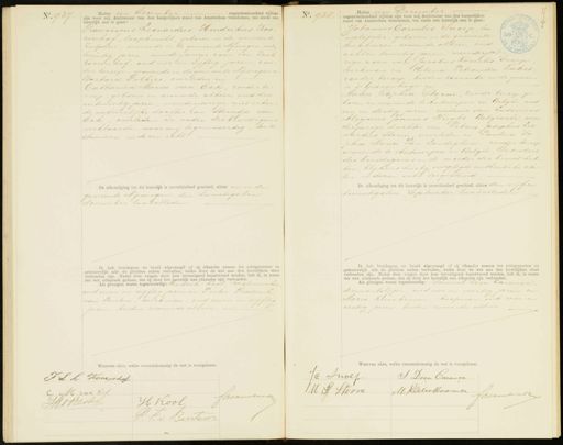 No. 937 in Decemb negentienhonderd vijftien zijn voor mij Ambtenaar van den burgerlijken stand van Amsterdam verschenen, ten einde een huwelijk aan te gaan: Franciscus Leonardus Hendrikus Koo renhof, loopknecht, geboren in de gemeente Zutphen, wonende in de gemeente Nijmegen, oud twintig jaren, minderjarige zoon van Izak Koorenhof, oud vier en vijftig jaren, zon der beroep, wonende in de gemeente Nijmegen en Barbara Folkers, overleden, en Catharina Maria van Eck, zonder be roep, geboren en wonende alhier, oud drie en twintig jaren, meerderjarige niet erken de natuurlijke dochter van steintie van Eck, overleden. De vader des bruidegoms verklaarde, voor mij tegenwoordig, toe te stemmen in dezen echt. De afkondiging tot dit huwelijk is onverhinderd geschied, alhier en in de gemeente Lijmegen, den twintigsten November laatstleden Ik heb bruidegom en bruid afgevraagd of zij elkander nemen tot echtgenooten en getrouwelijk alle de plichten zullen vervullen, welke door de wet aan den huwelijken staat verbonden zijn. Nadat deze vragen door hen bevestigend beantwoord werden, heb ik, in naam der wet, uitspraak gedaan, dat zij door het huwelijk aan elkander zijn verbonden Als getuigen waren tegenwoordig: Hen drik Kool, kartenmaker oud zeven en vijftig jaren en Pieter Frederik van Bentem, werkman, oud zeven en vijftig jaren, beiden wonende alhier Waarvan akte, welke overeenkomstig de wet is voorgelezen. No. 938. cember leden een negentienhonderd vijftien zijn voor mij Ambtenaar van den stand van Amsterdam verschenen, ten einde een huwelijk aan te gaan: Johannes Cornelis Snoep, too neelspeler, geboren in de gemeente Enkhuizen, wonende alhier, oud acht en twintig jaren, meerderja. rige zoon van Jacobus Kornelis Sroep werkman en Helena Petronella Iakes zonder beroep, beiden wonende in de gemeen te s- Gravenhage en Maria Sophia Storm, zonder beroep, ge boren en wonende te Antwerpen in Belgie, oud een en dertig jaren, weduwe van Ludovicus Hoysius Joannes Wuyts, Belgische, meer derjarige dochter van Petrus Josephus Leo nardus Storm, overleden en Paulina So phia Maria Van Landeghem, zonder beroep wonende te Antwerpen in Belgie, de ouders des bruidegoms en de moeder der bruid heb„ ben, blijkens hierbij overgelegde authentieke ak ten, in dezen echt toegestemd De afkondiging tot dit huwelijk is onverhinderd geschied, alhier den vijf en twintigsten September laatstleden Ik heb bruidegom en bruid afgevraagd of zij elkander nemen tot echtgenooten en getrouwelijk alle de plichten zullen vervullen, welke door de wet aan den huwelijken staat verbonden zijn. Nadat deze vragen door hen bevestigend beantwoord werden, heb ik, in naam der wet, uitspraak gedaan, dat zij door het huwelijk aan elkander zijn verbonden Als getuigen waren tegenwoordig: Samuel Deca Caranca, diamantslijper, oud vier en veertig jaren en Mozes Kleinkramer, koopman, oud vier en zestig jaren, beiden wonende alhier Waarvan akte, welke overeenkomstig de wet is voorgelezen. F L L Koorenhof P M van Ex foernenven Jodrerhof H Kool P: J: v: Bentem Vaarva- akte, v. wet is voorgelezen. Jc Snoep S. Deca Caranca M Heumberman Cacsmbn M. S Storm