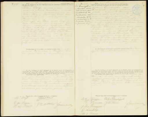 No. 941. negentienhonderd vijftien Heden een zijn voor mij Ambtenaar van den burgerlijken stand van Amsterdam verschenen, ten einde een huwelijk aan te gaan. Willem Borg, steward, geboren in wi nende in de gemeente Woudrichem, oud acht in twintig jaren, meerderjarige zoon van Willem Borg en Plora van Driel, beiden zonder beroep en wonende in de gemeente Woudrichem en Temmigje de Boer, zonder beroep, ge boren en wonende alhier, oud acht en twin tig jaren, meerderjarige dochter van Harm de Boer, oud vijf en vijftig jaren, timmerman en Geertruij Kreijt, oud vijfenvijftig jaren zonder beroep, beiden wonende alhier Te ou ders der bruid verklaarden, voor mij tegenwoor dig, toe te stemmen in dezen echt, De ouders des bruidegoms hebben, blijkens hierbij over gelegde authentieke akte, in dezen echt toe gestemd De afkondiging tot dit buwelijk is onverhinderd geschied, alhier en in de gemeenten Houdrichem en Bussum, den twintigsten November laatstleden. Ik heb bruidegom en bruid afgevraagd of zij elkander nemen tot echtgenooten en getrouwelijk alle de plichten zullen vervullen, welke door de wet aan den huwelijken staat verbonden zijn. Nadat deze vragen door hen bevestigend beantwoord werden, heb ik, in naam der wet, uitspraak gedaan, dat zij door het huwelijk aan elkander zijn verbonden. Als getuigen waren tegenwoordig: Harm de Boer, Expediteur oud vijf en twintig jaren en Jan Willem de Boer, kantoorbediende, oud drie en twintig jaren, beiden broeder der echtgenoote en wonende alhier. De moeder der echtgenoo te verklaarde niet te kunnen naamteekenen als hebbende geen schrijven geleerd Dit huuvelijk is ontbonden door het vonnis der Rechtbank te Amsterdam van 13 December 1936 le de inschijving te Armsterdam heden 21 Januari 1937 m leden een negentienhonderd vijftien zijn voor mij Ambtenaar van den stand van Amsterdam verschenen, ten einde een huwelijk aan te gaan: Antonie Geertruidis van Herwijnen, leerling machinist egeboren in de gemeente Baardwijk in wonende alhier, oud zeven en twintig "45 jaren, meerderjarige zoon van Jonas Ma Prinus van Herwijnen, oud drie envijftig ja „ren, vuurstoker en Geertrui Vieukoop 7 oud vijf en vijftig jaren, zonder beroep, beiden wonende in de gemeente Drunen en Trijntje Vesman, zonder beroep, geboren en wonende alhier, oud twintig jaren, min derjarige dochter van Machiel Visman overleden en Maria Christina Rous, oud twee en vijftig jaren, zonder beroep, wonende alhier. te ouders des bruidegoms en de moe der der bruid verklaarden, voor mij tegen- woordig, toe te stemmen in dezen echt„ De afkondiging tot dit huwelijk is onverhinderd geschied, alhier den twin tigsten November laatstleden Ik heb bruidegom en bruid afgevraagd of zij elkander nemen tot echtgenooten en getrouwelijk alle de plichten zullen vervullen, welke door de wet aan den huwelijken staal verbonden zijn. Nadat deze vragen door hen bevestigend beantwoord werden, heb ik, in naam der wet, uitspraak gedaan, dat zij door het huwelijk aan elkander zijn verbonden. Als getuigen waren tegenwoordig: Marfinus Antonius van Herwijnen, broeder des echtgenoots, zieken verpleger, oud acht en twintig jaren en Jan Willem Visman, broederder echtgenoote, ma chinist, oud dertig jaren, beiden wonende alhier Waarvan akte, welke overeenkomstig de wet is voorgelezen. Waarvan akte, welke overeenkomstig de wet is voorgelezen. Hde Boe W Boeg F. de Boer. J.W. de Boen zevenbuten H de Boer AG. v. Herwijnen M.d. v. Hterwijn Wisman a/W. Vijman loezmang J M u Henwynen G Nieukoop „ E: Rous