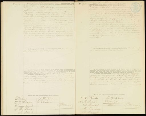 No. 953 Heden twee December negentienhonderd vijftien zijn voor mij Ambtenaar van den burgerlijken stand van Amsterdam verschenen, ten einde een: huwelijk aan te gaan: Dingenus Verburg, metaaldraaier geboren en wonende alhier, oud vier entwin tig jaren, meerderjarige zoon van Gerard Verburg, overleden en Martha Suurland, oud acht en veertig jaren, winkelierster, wonen de alhier en Wilhelmina Johanna Huitema, zon der beroep, geboren en wonende alhier, oud negentien jaren, minderjarige dochter van Sjoerd Huitema, oud veertig jaren gasstoker en Antie Smit, oud drie en veer tig jaren, zonder beroep, beiden wonende alhier de moeder des bruidegoms en de ouders der bruid verklaarden, voor mij tegenwoordig, toe te stemmen in dezen echt. De afkondiging tot dit huwelijk is onverhinderd geschied, alhier den twintig„ sten November laatstleden Ik heb bruidegom en bruid afgevraagd of zij elkander nemen tot echtgenooten en getrouwelijk alle de plichten zullen vervullen, welke door de wet aan den huwelijken staat verbonden zijn. Nadat deze vragen door hen bevestigend beantwoord werden, heb ik, in naam der wet, uitspraak gedaan, dat zij door het huwelijk aan elkander zijn verbonden. Als getuigen waren tegenwoordig: Sme Ruisema, oom der echtgenoote, werkman, oud vier en veertig jaren en Adriaan Verwer, zwager des echt- genoots, letterzetter, oud een en dertig jaren beiden wonende alhier Waarvan akte, welke overeenkomstig de wet is voorgelezen. 154 negentienhonderd vijftien zijn voor mij Ambtenaar: stand van Amsterdam yerschenen, ten einde een huwelijk aan te gaan: George Rühl, kantoorbediende, geboren en wonende alhier, oud acht en twintig jaren, meerderjarige zoon van Dirk Ruhl, oud negen enzestig jar en Maria Looman, oud acht en vijftig jaren beiden zonder beroep en wonende alhier en Antje Marrétie Borsch, zonder beroep geboren in de gemeente Helder, wonende al hier, oud vijf en twintig jaren, meerderja rige dochter van Harmen Borsch, oud een en vijftig jaren, loods en Mina Jagtman oud vyftig jaren, zonder beroep, beiden wonende alhier, Beider ouders verklaarden voor mij tegenwoordig, toe te stemmen in de zen echt De afkondiging tot dit huwelijk is onverhinderd geschied, alhier den twintig sten November laatstleden Ik heb bruidegom en bruid afgevraagd of zij elkander nemen tot echtgenooten en getrouwelijk alle de plichten zullen vervullen, welke door de wet aan den huwelijken staat verbonden zijn. Nadat deze vragen door hen bevestigend beantwoord werden, heb ik, in naam der wet, uitspraak gedaan, dat zij door het huwelijk aan elkander zijn verbonden. Als getuigen waren tegenwoordig: Ernst Filliam Suyter zwager des echtgenoots, klerk bij de Rijks- Verzekeringsbank, oud acht en dertig jaren en Dirk Wouter Rühl, broeder des echtge- noots, zonder beroep, oud vijfentwintig jaren beiden wonende alhier Waarvan akte, welke overeenkomstig de wet is voorgelezen. YJ Huitema D. Verburg W J. Huitema A: Verwer Brivel M Suurband D. Huitema A Smit Ab Jagt man E Ruke WHuyken AM: Bersch Brevee DW Rnke D Rüutl M Zooman H Borsch