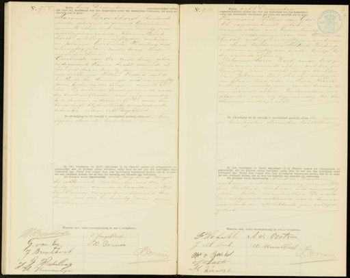 No. 955 Heden twee December negentienhonderd vijftig buwelijk aan te gaan: zijn voor mij Ambtenaar van den burgerlijken stand van Amsterdam verschenen, ten einde een Marinus Bronkhorst kantoorbe diende, geboren in de gemeente Gorinchem, wonende alhier, oud zeven en twintig jaren meerderjarige zoon van Johannes Bronk horst, oud twee en vijftig jaren, werkman en Johanna Geertruida Veverling oud eenenvijftig jaren, zonder beroep, beiden wonende alhier en Geertruida van Ee, zonder beroep, geboren in de gemeente Nieuwer-Amstel, wonende al hier, oud drie en twintig jaren, meerderja rige dochter van Willem Fredrik van Ee en Hendrika Hemminga, oud vier envijftig jaren, beiden zonder beroep en wonende al hier. De oudersdes bruidegoms en de moeder der bruid verklaarden, voor mij tegenwoordig toe te stemmen in dezen echt. De vader der bruid heeft, blijkens hierbij overgelegde authen tieke akte. in dezen echt toegestemd De afkondiging tot dit huwelijk is onverhinderd geschied, alhier den twin tigsten November laatstleden Ik heb bruidegom en bruid afgevraagd of zij elkander nemen tot echtgenooten en getrouwelijk alle de plichten zullen vervullen, welke door de wet aan den huwelijken staan verbonden zijn. Nadat deze vragen door hen bevestigend beantwoord werden, heb ik, in naam der wet, uitspraak gedaan, dat zij door het huwelijk aan elkander zijn verbonden Als getuigen waren tegenwoordig: Dirk Jongebloed, zwager der echtgenoote, houtwerker, oud drie en dertig jaren, wonende te Zaandam en Wil. lem Cornax, zwager des echtgenoots krui- denier, oud vier en twintig jaren, wonen de alhier. Waarvan akte, welke overeenkomstig de wet is voorgele No. 956 Heden acht December stand van Amsterdam verschenen, ten einde een huwelijk aan te gaan: negentienhonderd vijftien zijn voor mij Ambtenaar van den burgerlijken Franciscus Willem van Gas tel, expeditieknecht, geboren en wonende alhier, oud twee en twintig 1 jaren, meerderjarige zoon van Willem, van Gastel, oud negen en vijftig jaren, werkman en Maria Catharina Voldina Rüting, oud zeven en vijftig jaren, zonder beroep, bei„ den wonende alhier, en Johanna Maria Loet, zonder beroep geboren en wonende alhier, oud drie en twintig jaren, meerderjarige dochter van Johannes Zoet, oud zes en veertig ja„ ren glas in lood-zetter, en Maria Kroese oud negen en veertig jaren, zonder beroep, bei den wonende alhier, Beider ouders ver klaarden, voor mij tegenwoordig, toe te stemmen in dezen echt De afkondiging tot dit huwelijk is onverhinderd geschied, alhier den zeven en twintigsten November laatstleden Ik heb bruidegom en bruid afgevraagd of zij elkander nemen tot echtgenooten en getrouwelijk alle de plichten zullen vervullen, welke door de wet aan den huwelijken staan verbonden zijn. Nadat deze vragen door hen bevestigend beantwoord werden, heb ik, in naar der wet, uitspraak gedaan, dat zij door het huwelijk aan elkander zijn verbonden. Als getuigen waren tegenwoordig: tiend van Oostveen, werkman, oud drie en zeventig jaren en Vil lem Waalbeek, werkman, oud zesenzestig jaren, beiden wonende alhier. De moeder des echtgenoots verklaarde niet te kunnen naamteekenen, als hebbende geen schrijven geleerd Waarvan akte, welke overeenkomstig de wet is voorgelezen. Waarvan akte, welke overeenkomstig de wet is voorgelezen. WBronthood D Jongebloed. G. van El W. Corner J. Broukhout Brevee J F Wederling H. Hemminga Woemen cht wantten eig de wef voorgelezen FWWv Gastel A:S. Oostven J M Zoek H Haalbeek Drevel AW v Gors vel of oloet M Kraer