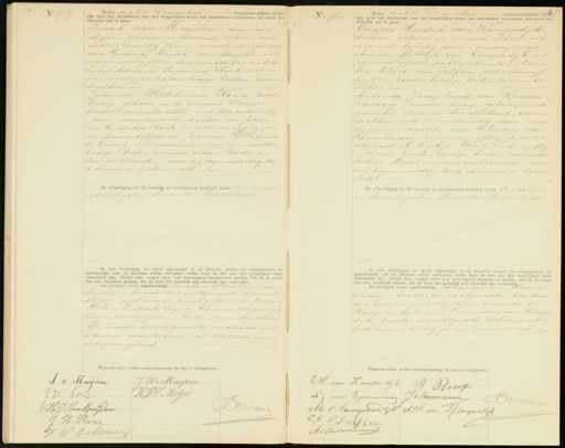 No. 959 acht ber negentienhonderd vijftien zijn voor mij Ambtenaar van den burgerlijken stand van Amsterdam verschenen, ten einde een huwelijk aan te gaan: Izaak van Muijden, diamant slijper, geboren en wonende alhier, oud acht en twintig jaren, meerderjarige zoon van Hendrik Izaak van Muijden, oud negenenveertig jaren diamantslijper en Eli zabet Adriana Suzanna Stork, oud ne- genenveertig jaren, zonder beroep, beiden wonen- de alhier en Johanna Wilhelmina Konz, zonder beroep, geboren in de gemeente tieuwer Amstel, wonende alhier, oud drie entwintig jaren, meerderjarige dochter van Johan- nes Hendrikus Konz, oud drie envijftig ja- ren, diamantslijper en Johanna Wilhelmina de Koning, oud zeven enveertig jaren, zonder beroep, beiden wonende alhier, eider ou ders verklaarden, voor mij tegenwoordig, toe te stemmen in dezen echt. De afkondiging tot dit huwelijk is onverhinderd geschied, alhier den zeven entwintigsten November laatstleden Ik heb bruidegom en bruid afgevraagd of zij elkander nemen tot echtgenooten en getrouwelijk alle de plichten zullen vervullen, welke door de wet aan den huwelijken staat verbonden zijn. Nadat deze vragen door hen bevestigend beantwoord werden, heb ik, in naam der. wet, uitspraak gedaan, dat zij door het huwelijk aan elkander zijn verbonden. Als getuigen waren tegenwoordig: Jacobus Wilhelmus van Muijden, broeder des echtgenoots, diamant- slijper, oud twee en twintig jaren en Hendrik Willem Frederik Meijer, diamantslijper, oud twee en veertig jaren, beiden wonende alhier. De moeder desechtgenoots verklaarde niet te kunnen naamteekenen, als hebbende geen schrijven geleerd. 70 Heden acht December enhonderd vijftien huwelijk aan te gaan: zijn voor mij Ambtenaar van den burgerlijken stand van Amsterdam verschenen, ten einde een Casper Hendrik van Ramperdijk koetsier, geboren en wonende alhier, oud negen en twintig jaren, meerderjarige zoon van Matthijs van Kamperdijk oud vierenzestig jaren, pakhuisknecht en Corne- lia Clara van Dalfsen, oud achtenvijf- tig jaren, zonder beroep, beiden wonende alhier en Antonia Josephina van Raven zwaay, zonder beroep, geboren in de gemeente Laren in Noordholland, wonen de alhier, oud een entwintig jaren, meer derjarige dochter van Albertus van Ravenzwaag, oud zesenvijftig jaren, ma- chinist en Rijkje Bout, oud vijftig jaren, zonder beroep, beiden wonende alhier. Beider ouders verklaarden, voor mij tegenwoordig, toe te stemmen in dezen echt De afkondiging tot dit huwelijk is onverhinderd geschied, alhier den zeven en twintigsten November laatstleden Ik heb bruidegom en bruid afgevraagd of zij elkander nemen tot echtgenooten en getrouwelijk alle de plichten zullen vervullen, welke door de wet aan den huwelijken staat verbonden zijn. Nadat deze vragen door hen bevestigend beantwoord werden, heb ik, in naam der wet, uitspraak gedaan, dat zij door het huwelijk aan elkander zijn verbonden Als getuigen waren tegenwoordig: Johannes van Kaven- zwaag, broeder der echtgenoote, bankwer„ ker, oud een en dertig jaren, wonende te Weesp en Antonius Franciscus van Kamper dijk, broeder des echtgenoots, schoenmaker, oud twee en dertig jaren, wonende alhier Waarvan akte, welke overeenkomstig de wet is voorgelezen. van akte, welke overeenkomstig de wet is voorgelezen. J v Muijsen J.W. v. Muyden Io1 1WP Meijer J W. Konz Drevee HJ Van Muider J. H. Konz J W De Koning C.H. van Kamperdijk R Rout 4 van Ravenpwaan J. v Bevenewaa Dreceee M v Vrampendyk A.Nk van Bangewvijk C C V: Duelfeen Re Rovenzwaard