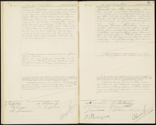 No. 204 Heden zesen twintig Maart negentienhonderd negentien zijn vóor mij Ambtenaar van den burgerlijken stand van Amsterdam verschenen, ten einde eer huwelijk aan te gaan: Johannes Dijkstra, magazinbediende, geboren en wonende alhier, oud vier en twintig jaren, meerder jarige zoon van Jacob Dijkstra, overleden en Aaltje Koomen, zonder beroep, wonende alhier en Klaske Timmer, zonder beroep, geboren in de gemeente 's-Gravenhage, wonende alhier, oud twee en twintig jaren, meerderjarige dochter van Anne Timmer, oud acht en vijftig jaren, schoenmaker en Klaske Boersma, zonder beroep, beiden wonende al hier. De vader der bruid verklaarde, voor mij tegen- woordig toe te stemmen in dezen echt. De moeder der bruid heeft, blijkens hierbij overgelegde authentieke akte in dezen echt toegestemd. De afkondiging tot dit huwelijk is onverhinderd geschied, alhier den vijftienden Februari laatstleden Bij deze akte is tevens overgelegd een proces verbaal van tus- schenkomst van den Rechter in het kanton Amsterdam, waar- uit blijkt, dat de moeder des bruidegoms op de oproeping niet is verschenen. Ik heb bruidegom en bruid afgevraagd of zij elkander nemen tot echtgenooten en getrouwelijk alle de plichten zullen vervullen, welke door de wet aan den huwelijken staat verbonden zijn. Nadat deze vragen door hen bevestigend beantwoord werden, heb ik, in naam der wet, uitspraak gedaan, dat zij door het huwelijk aan elkander zijn verbonden Als getuigen waren tegenwoordig: Anne Timmer, broeder der echt¬ genoote, karrijder, oud drie en twintig jaren en Oeds Drijf. hout, zonder beroep, oud twee en twintig jaren, beiden wonende alhier No. 205 Heden zeven en twintig Maart negentienhonderd negentien zijn voor mij Ambtenaar van den bufgerlijken stand van Amsterdam verschenen, ten einde een huwelijk aan te gaan. Maurits van Abbe, diamantslijper, geboren alhier, wonende in de gemeente Watergraatsmeer, oud vier en twintig jaren, meerderjarige zoon van Jacob van Abbe, oud twee en zestig jaren, — en tenneken Renssen, oud vijf en zestig jaren, — beiden zonder beroep, en wonende in de gemeente Watergraafsmeer en Louise Therese Metzelaar, diamant snijdster, geboren en wonende alhier, oud vijf en twintig jaren, meerderjarige dochter van Jacob Metzelaar, oud twee en vijftig jaren, diamant. slyper, wonende alhier en Therete Grube, overleden De ouders der bruidegoms en de vader der bruid verklaarden, voor, mij tegenwoordig, toe te stemmen in dezen echt. De afkondiging tot dit huwelijk is onverhinderd geschied, alhier en in de ge- meente Watergraafsmeer den achtsten dezer maand- Ik heb, bruidegom en bruid afgevraagd of zij elkander nemen tot echtgenooten en getrouwelijk alle de plichten zullen vervullen, welke door de wet aan den huwelijken staat verbonden zijn. Nadat deze vragen door hen bevestigend beantwoord werden, heb ik, in naam der wet, uitspraak gedaan, dat zij door het huwelijk aan elkander zijn verbonden Als getuigen waren tegenwoordig: Gerrit van Abbe, broeder des echtgenoots, eigarensateerder oud vif en dertig ja ren, wonende te Watergraafsmeer, en Willem Hamel zwager des echtgenoots, onderwijzer, oud twee en dertig jaren, wonende alhier Waarvan akte, welke overeenkomstig de wet is voorgelezen. A. Timmer 7/d J: Dijkstra O. Drijfzout. K Timmer A. Timmer 1 Waarvan akte, welke overeenkomstig de wet is voorgelezen. M. van Abbe. J Metzelaar L.T. Metzelaar G van Aller