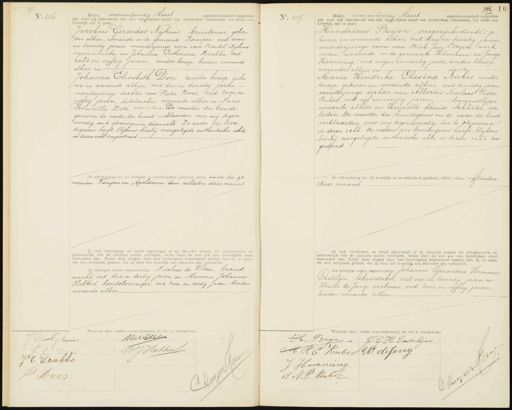 No. 206 Heden zevenentwintig Maart negentienhonderd negentien zijn voor mij Ambtenaar van den burgerlijken stand van Amsterdam verschenen, ten einde een huwelijk aan te gaan: Jacobus Gerardus Nijhuis, kruidenier, gebo„ pen alhier, wonende in de gemeente Kampen, oud zeven en twintig jaren, meerderjarige zoon van Bartel Nijhui sigarenmaker en Johanna Catharina Drabbe, oud acht en vijftig jaren, zonder beroep, beiden wonende alhier en Johanna Elisabeth Does zonder beroep, gebo- ren en wonende alhier, oud drie en twintig jaren, meerderjarige dochter van Pieter Does, oud twee en vijftig jaren, ketelmaker; wonende alhier en Maria Petronella Ditz, overleden. De moeder des bruide„ goms en de vader der bruid verklaarden, voor mij tegen woordig, toe te stemmen in dezen echt. De vader des buui degoms heeft, blijkens hierbij overgelegde authentieke akte in dezen echt toegestemd. De afkondiging tot dit huwelijk is onverhinderd geschied, alhier en in de ge„ meenten Kampen en Apeldoorn den achtsten dezer maand- Ik heb bruidegom en bruid afgevraagd of zij elkander nemen tot echtgenooten en getrouwelijk alle de plichten zullen vervullen, welke door de wet aan den huwelijken staat verbonden zijn. Nadat deze vragen door hen bevestigend beantwoord werden, heb ik, in naam der wet, uitspraak gedaan, dat zij door het huwelijk aan elkander zijn verbonden Als getuigen waren tegenwoordig: Nicolaas de Kleen, brand¬ wacht, oud drie en dertig jaren en Marinus Johannes Hakkert, handelsreiziger, oud twee en dertig jaren, beiden wonende alhier No. 207. Heden zeven en twintig Maart negentienhonderd negentien zijn voor mij Ambtenaar van den burgerlijken stand van Amsterdam verschenen, ten einde een huwelijk aan te gaan Hendricus Beijen, magazijnbediende, ge„ boren en wonende alhier, oud drie en twintig jaren meerderjarige zoon van Dirk Jan Beyen, werk man, wonende in de gemeente Hilversum en Jansje Hamming, oud negen en veertig jaren, zonder beroep, wonende alhier en Maria Hendrika Clasina Kubes, zonder beroep, geboren en wonende alhier, oud twintig jaren minderjarige dochter van Albertus Nicolaas Pieter Kubes, oud vijf en veertig jaren, — diamantslijper wonende alhier en Henriette Louise Schluter, over leden. De moeder des bruidegoms en de vader der bruid verklaarden, voor mij tegenwoordig, toe te stemmen in dezen echt. De vader des bruidegoms heeft, blykens hierbij overgelegde authentieke akte in dezen echt toe„ gestemd. De afkondiging tot dit huwelijk is onverhinderd geschied, alhier den vijftienden dezer maand. Ik heb bruidegom en bruid afgevraagd of zij elkander nemen tot echtgenooten en getrouwelijk alle de plichten zullen vervullen, welke door de wet aan den huwelijken staat verbonden zijn. Nadat deze vragen door hen bevestigend beantwoord werden, heb ik, in naam der wet, uitspraak gedaan, dat zij door het huwelijk aan elkander zijn verbonden. als getuigen waren tegenwoordig: Johannes Gerardus Hermanus Pastelijn, iikeurstoker, oud vier en twintig jaren en Wouter de Jong, werkman, oud twee en vyftig jaren beiden wonende alhier Waarvan akte, welke overeenkomstig de wet is voorgelezen. Medleer G Vijking J MJHakheet J C: Doubbe 1 P Does 1 D Waarvan akte, welke overeenkomstig de wet is voorgelezen.