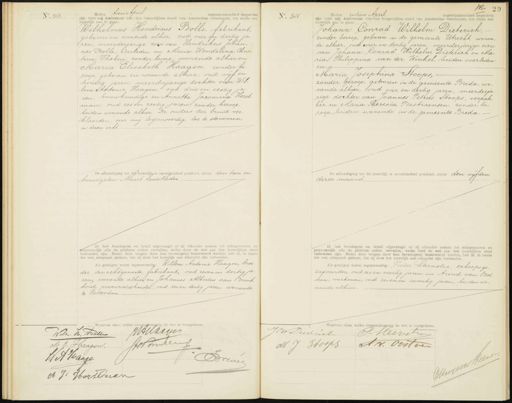 No. 243. Heden tien April negentienhonderd negentien zijn voor mij Ambtenaar van den burgerlijken stand van Amsterdam verschenen, ten einde een huwelijk aan te gaan: Wilhelmus Hendricus Bolle, fabrikant, geboren en wonende alhier, oud vier en dertig ja ren, meerderjarige zoon van Hendrikus Johannes Bolle, overleden en Maria Wendelina Christina Theben, zonder beroep, wonende alhier en Maria Elisabeth Haagen, zonder be roep, geboren en wonende alhier, oud vijf en twintig jaren, meerderjarige dochter van Willem Antonie Haagen, oud drie en zestig jaren, bouwkundige en Annetta Jacomina Horst. man, oud zes en zestig jaren, zonder beroep, beiden wonende alhier. De ouders der bruid ver klaarden, voor mij tegenwoordig, toe te stemmen in dezen echtDe afkondiging tot dit huwelijk is onverhinderd geschied, alhier den twee en twintigsten Maart laatstleden Ik heb bruidegom en bruid afgevraagd of zij elkander nemen tot echtgenooten en getrouwelijk alle de plichten zullen vervullen, welke door de wet aan den huwelijken staat verbonden zijn. Nadat deze vragen door hen bevestigend beantwoord werden, heb ik, in naam der wet, uitspraak gedaan, dat zij door het huwelijk aan elkander zijn verbonden Als getuigen waren tegenwoordig: Willem Antonie Haagen, broe der der echtgenoote, fabrikant, oud zeven en dertig jaren, wonende alhier en Johannes Albertus van Bronkhorst, procuratiehouder, oud zes en dertig jaren, wonende te Rotterdam No. 244. zestien April itien zijn voor mij Ambtenaar van den burgerlijken stand van Amsterdam verschenen, ten einde een huwelijk aan te gaan: Johann Conrad Wilhelm Dieterich, zonder beroep, geboren in de gemeente Utrecht, wonen de alhier, oud wier en dertig jaren, meerderjarige zoon van Johann Conrad Wilhelm Dieterich en Maria Philippina van der Winkel, beiden overleden en Maria Josephina Stoops, zonder beroep, geboren in de gemeente Breda, wonende alhier, oud vier en dertig jaren, meerderja rige dochter van Joannes Petrus Stoops, verpak ker en Maria Peresia Bastiaensen, zonder be= roep, beiden wonende in de gemeente Breda. De afkondiging tot dit huwelijk is onverhinderd geschied, alhier den vijfden dezer maand: Ik heb bruidegom en bruid afgevraagd of zij elkander nemen tot echtgenooten en getrouwelijk alle de plichten zullen vervullen, welke door de wet aan den huwelijken staat verbonden zijn. Nadat deze vragen door hen bevestigend beantwoord werden, heb ik, in naam der wet, uitspraak gedaan, dat zij door het huwelijk aan elkander zijn verbonden. Als getuigen waren tegenwoordig: Pieter Steenstra, scheepsgezagvoerder, oud zes en veertig jaren, en Arend van Oost vien, werkman, oud zeven en zeventig jaren, beiden wonende alhier. aarvan akte, welke overeegkomstig de wet is voorgelezen. Waln. L. Aalen WWaagen G: Haagen Jol miteng WAJearije Briver A J Hortbman Waarvan akte, welke of stig de wet is voorgel JC W Dieterict P Heerstra Av. Oostve M J Stooph Comel