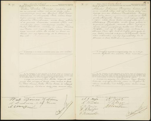 No. 194. Heden twintig Maart negentienhonderd negentig zijn voor mij Ambtenaar van/den burgerlijken stand van Amsterdam verschenen, ten einde een huwelijk aan te gaan: Willem Dirkze Bomas, winkelier, gebo- ren en wonende alhier, oud een en dertig jaren, meerderjarige zoon van Huibert Hugs Bomas, timmerman en Margaretha Koot, zonder beroep, beiden wonende alhier en. Agatha Broekman, zonder beroep, geboren in de gemeente Leeuwarden, wonende alhier, oud zesentwintig jaren, meerderjarige dochter van Roelof Broekman, overleden en Anna Christina van Berloo, oud negen en vijftig jaren, zonder beroep, wonende alhier. De moeder der bruid ver- klaarde, voor mij tegenwoordig, toe te stemmen in dezen echt. De afkondiging tot dit huwelijk is onverhinderd geschied, alhier den achtsten dezer maand. II heb bruidegom en bruid afgevraagd of zij elkander nemen tot echtgenooten en getrouwelijk alle de plichten zullen vervullen, welke door de wet aan den huwelijken staat verbonden zijn. Nadat deze vragen door hen bevestigend beantwoord werden, heb ik, in naam der wet, uitspraak gedaan, dat zij door het huwelijk aan elkander zijn verbonden. Als getuigen waren tegenwoordig: Gerrit Mulder, zwager des echt genoots, bode, oud negen en twintig jaren, wonende te Gouda en Klaas Marinus Jacobus Bomas, broeder des echtgenoots kantoorbediende, oud drie en dertig jaren, wonende alhier. Jaarvan akte, welke overeenkomstig de, wet is voorgelezen. No. 195 Heden zes en twintig Maart zijn voor mij Ambtenaar van den Burgerlijken stand van Amsterdam verschenen, ten einde een huwelijk aan te gaan: Albertus Johannes Roussou, koetsier, gebo ren en wonende alhier, oud vijf en twintig jaren, meer derjarige zoon van Ludovicus Bartholomeus Koustou oud zestig jaren, werkman en Hille gonda Margaretha Kousson, oud negen en vijftig jaren, zonder beroep, beiden wonende alhier in- Adriana Brandse, zonder beroep, geboren in de gemeente Mijdrecht, wonende alhier, oud een en twintig jaren meerderjarige dochter van Frank Brandse, oud vijf en vijftig jaren, werkman en Adriana Boer, oud twee en vijftig jaren, zonder be= roep, beiden wonende in de gemeente Mijdrecht. Beider ouders verklaarden, voor mij tegenwoordig, toe te stemmen in dezen echt De afkondiging tot dit huwelijk is onverhinderd geschied, alhier en in de ge- meente Mijdrecht den achtsten dezer maand: Ik heb bruidegom en bruid afgevraagd of zij elkander nemen tot echtgenooten en getrouwelijk alle de plichten zullen vervullen, welke door de wet aan den huwelijken staat verbonden zijn. Nadat deze vragen door hen bevestigend beantwoord werden, heb ik, in naam der wet, uitspraak gedaan, dat zij door het huwelijk aan elkander zijn verbonden Als getuigen waren tegenwoordig: Jan Adrianus Lagas, kantoor bediende, oud vijf en (twintig jaren, en Engbert Ro. zeboom, werkmaan, oud tachtig jaren, beiden wonen de alhier. Jaarvan akte, welke overeenkomstig de, wet is voorgelezen. W. D. Bomas-G Mulde A Broekman- K. M.J. Boman x A C van Berlor