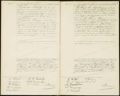 No. 497 Heden negentien Juni negentienhonderd negentien zijn voor mij Ambtenaar van den burgerlijken stand van Amsterdam verschenen, ten einde een huwelijk aan te gaan: Maarten Tekela, bankwerker geboren en wonende alhier oud vier en twin„ tig jaren, meerderjarige zoon van Barend Tekela, oud zestig jaren tuinman, en Helena Catharina Seijm, oud twee en vijftig jaren zonder beroep, beiden wo„ nende alhier, en Alida de Haan zonder beroep geboren en wonende alhier oud twee en twin„ tig jaren meerderjarige dochter van Dirk de Haan, oud negen en zestig jaren, winke„ lier, en Alida Kntonia Buddenberg oud zeven en vijftig jaren, zonder beroep, beiden wonende alhier. Beider ouders ver„ klaarden, voor mij tegenwoordig toe te stem„ men in dezen echt De afkondiging tot dit huwelijk is onverhinderd geschied, alhier den zeven den dezer maand. Ik heb bruidegom en bruid afgevraagd of zij elkander nemen tot echtgenooten en getrouwelijk alle de plichten zullen vervullen, welke door de wet aan den huwelijken staat verbonden zijn. Nadat deze vragen door hen bevestigend beantwoord werden, heb ik, in naam der wet, uitspraak gedaan, dat zij door het huwelijk aan elkander zijn verbonden Ds getuigen waren tegenwoordig: Fredericus Gerhardus Franciscus Rouddenberg, halfbroeder der echtgenoote, visscher oud vijf en dertig jaren en George Carel Tekela broeder des echt genoots, timmerman, oud vijf en twintig jaren, beiden wonende alhier. o. 498 negentien Juni huwelijk aan te gean zijn voor mij Ambtenaar van den burgerlijken stand van Amsterdam Gerschenen den bunde Matthijs ten Oort, sigarenmaker ge„ boren en wonende alhier oud acht en twintig jaren, meerderjarige zoon van Hermanus Hen drikus ten Vort, overleden en Maria Ralders, oud twee en zestig jaren, zonder beroep wi nende alhier, en Hendrika Maria Kooijman, zonder beroep, geboren in de gemeente Nieuwer Amstel wonende alhier, oud drie en twintig jaren meerderjarige dochter van Otto Marcus Rooijman, oud twee en vijftig jaren segaren, maker, en Geertruida Ommerik oud drie en vijftig jaren zonder beroep beiden wi„ nende alhier. De moeder des bruidegams en de ouders der bruid verklaarden, voor mij tegenwoordig toe te stemmen in dezen echt De afkondiging tot dit huwelijk is onverhinderd geschied, alhier den zeven den dezer maand. II heb bruidegom en bruid afgevraagd of zij elkander nemen tot echtgenooten en getrouwelijk alle de plichten zullen vervullen, welke door de wet aan den huwelijken staat verbonden zijn. Nadat deze vragen door hen bevestigend beantwoord werden, heb ik, in naam der wet, uitspraak gedaan, dat zij door het huwelijk aan elkander zijn verbonden. als getuigen waren tegenwoordig: Adrianus Johannes Hooij„ man, broeder der echtgenoote, sigarenma„ ker oud vijf en twintig jaren en Paulus Abraham ten Vort broeder des echtge„ noots, segarenmaker, oud negen en dertig jaren, beiden wonende alhier. Waarvan akte, welke overeenkomstig de wet is voorgelezen. M: Pekela. A A Buildenberg F GC Buddenber H. de Haan B Pekelan J: C: Pekela Odre H. C Seym D de Hrean harvan akte, welke overeenkomstig de wet is voorgelezen. M ten Part N v/ Kooy H. M Kooyman Piet ten Orst M Daalders Brivee 6 M Karmar G: Emmerik