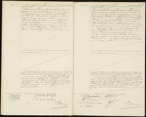 No. 490 Heden negentien Juni negentienhonderd negentien zijn voor mij Ambtenaar van den burgerlijken stand van Amsterdam verschenen, ten einde een huwelijk aan te gaan. Johannes Rozeboom, kantoorbediende, geboren en wonende alhier oud een en dertig jaren meerderjarige zoon van Johannes Rozeboom, overleden en Hendrika Anthonia Aalbers, zonder beroep wonende alhier en Frederika Johanna de Wol 220 zonder beroep geboren en wonende alhier, oud acht en twintig jaren, meerderjarige dochter van Jan de Wolf en Frederika Jo. hanna Oversbag, beiden overleden De afkondiging tot dit huwelijk is onverhinderd geschied, alhier den zeven den dezer maand. Ik heb bruidegom en bruid afgevraagd of zij elkander nemen tot echtgenooten en getrouwelijk alle de plichten zullen vervullen, welke door de wet aan den huwelijken staat verbonden zijn. Nadat deze vragen door hen bevestigend beantwoord werden, heb ik, in naam der wet, uitspraak gedaan, dat zij door het huwelijk aan elkander zijn verbonden Als getuigen waren tegenwoordig Jan Hendrik de Wolf, broeder der echtgenoote beeldhouwer oud veertig jaren, en Keimpe Johannes Kantoon Razeboom, broeder des echtgenoots bank werker oud negen en twintig jaren beiden wonende alhier. No. 500 Heden negentien Juni negentienhonderd negentig zijn voor mij Ambtenaar van den burgerlijken stand van Amsterdam verschenen, ten einde een huwelijk aan te gaan: Mijndert Johannes Gerardus Wiebes, lijstenmaker, geboren en wonende alhier ond twee en twintig jaren, meerderjarige zoon van Mijndert Johannes Wiebes oud vijftig jaren. winkelier, wonende alhier en Maria Elisabeth Simmer overleden, en Wilhelmina Stoepmanzonder beroep, geboren en wonende alhier oud twee en twintig jaren meerderjarige dochter van Willem Stoepman overleden, en sara Kret, oud zestig jaren. zonder beroep wonende alhier. De vader des bruidegoms en de moeder der bruid ver„ klaarden, voor mij tegenwoordig toe te stem men in dezen echt De afkondiging tot dit huwelijk is onverhinderd geschied, alhier den zeven den dezer maand. Ik heb bruidegom en bruid afgevraagd of zij elkander nemen tot echtgenooten en getrouwelijk alle de plichten zullen vervullen, welke door de wet aan den huwelijken staat verbonden zijn. Nadat deze vragen door hen bevestigend beantwoord werden, heb ik, in naam der wet, uitspraak gedaan, dat zij door het huwelijk aan elkander zijn verbonden. als getuigen waren tegenwoordig Johannes Bernardus Stoep, man broeder der echtgenoote kantoorbediende oud zes en twintig jaren en Johannes Frederik Coenraad Prie, zwager des echt„ genoots, bloemist oud zeventen twintig jaren, beiden wonende alhier. Waarvan akte, welke overeenkomstig de verls veorgeepn. CRrekron J.A de Wolf. Pr Jaewveg I J A Hazevoom Briees aarvan akte, welke overeenkomstig de wet is voorgelezen. MGepveebes me W Stoepman MWieze Jebpo Brevee S Kret