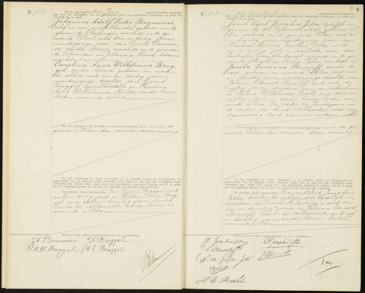No. 502 Heden negentien Juni negentienhonderd negentien zijn voor mij Ambtenaar van den bargerlijken stand van Amsterdam verschenen, ten einde een huwelijk aan te gaah: Johannes Adolf Pieter Bouwense, chef in een meubelhandel geboren in de gemeente Vlissingen wonende in de ge¬ meente Velsen, oud drie en dertig jaren, meerderjarige zoon van Gerrit Bouwen se, zonder beroep wonende in de gemeen te Peteringen en Johanna Maria Adams, overleden en Carolina Anna Wilhelmina Brog„ gel, zonder beroep, geboren en wonen„ de alhier oud een en dertig jaren meerderjarige dochter van Gerrit Broggel, rijnielhersteller en Carolina Anna Wilhelmina Mulder, zonder beroep beiden wonende alhier. De afkondiging tot dit huwelijk is onverhinderd geschied, alhier en in de gemeente Velsen, den zevenden dezer maand, Ik heb bruidegom en bruid afgevraagd of zij elkander nemen tot echtgenooten en getrouwelijk alle de plichten zullen vervullen, welke door de wet aan den huwelijken staat verbonden zijn. Nadat deze vragen door hen bevestigend beantwoord werden, heb ik, in naam der wet, uitspraak gedaan, dat zij door het huwelijk aan elkander zijn verbonden. Als getuigen waren tegenwoordig: Jan Karel Broggel, oud acht en dertig jaren en Willem Frans Brog gel, oud acht en twintig jaren, beiden broeder der echtgenoote, zonder beroep en wonende alhier No. 503 Heden twintig zijn voor mij Ambtenaar van den burgerlijken stand van Amsterdam verschenen, ten einde een huwelijk aan te gaan: Jacob Paul Josephus Jitta, tijdelijk in„ genieur bij den Rijkswaterstaat geboren al hier, wonende in de gemeente Velsen oud zes en twintig jaren, meerderjarige zoon van Nicolaas Marinus Josephus Jitta, oud een en zestig jaren, voorzitter van den Centralen Gezondheidsraad, wonende in de ge„ meente Utrecht en sophia Cohen overleden en Jacoba Susanna Stumpff, zonder be groep, geboren en wonende alhier, oud vier en twintig jaren, meerderjarige dochter van Johann Eduard Stumpff, oud vier en vijftig jaren, directeur van een ziekenhuis en Helena Wilhelmina Becht, oud drie en vijftig jaren - zonder beroep beiden wo nende alhier. De vader des bruidegoms en de ouders der bruid verklaarden, voor mij tegenwoordig toe te stemmen in dezen eella De alkondiging tot dit huwelijk is onverhinderd geschied, alhier en in de ge- meente Velsen, den zevenden dezer maand. II heb bruidegom en bruid afgevraagd of zij elkander nemen tot echtgenooten en getrouwelijk alle de plichten zullen vervullen, welke door de wet aan den huwelijken staat verbonden zijn. Nadat deze vragen door hen bevestigend beantwoord werden, heb ik, in naam der wet, uitspraak gedaan, dat zij door het huwelijk aan elkander zijn verbonden Als getuigen waren tegenwoordig: Frans Alfred Josephus Jitta broeder des echtgenoots tijdelijk in specteur der Directe Belastingen oud ze„ ven en twintig jaren en Johann Eduard Stumpff, broeder der echtgenoote, oud vijf en twintig jaren, zonder beroep beiden wonende alhier. Waarvan akte, welke overeenkomstig de wet is joorgelezen. JA.P. BouwemeF. Broggel C.A.W. Broggel W.T. Broggel Joo 3 larvan akte, welke overeenkomstig de wet is voorgelezen. JP. Josephussella KJosephut Jitta JS Stumpff W:m: Wonkn secr J.Shu ung JG. Bo HW. Beekt