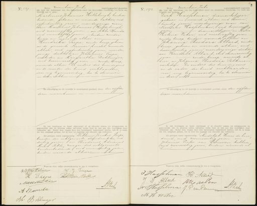 No. 591 Heden zeventien Juli negentienhonderd negentig, zijn voor mij Ambtenaar van den burgerlijken stand van Amsterdam verschenen,ten einde een huwelijk aan te gaan: Martinus Johannes Hettelingh, kantoor, bediende, geboren en wonende alhier, oud vijfentwintig jaren meerderjarige zoon van Martinus Johannes Hettelingh oud zesenvijftig jaren. - en Akke Randa oud vierenvyftig jaren. — beiden zonder beroep en wonende alhier en Hendrika Teepe zonder beroep geboren in de gemeente Nieuwer Amstel, wonende alhier, oud vijfentwintig jaren meerder jarige dochter van Johannes Teepe overleden en Margaretha Bohlmeijer oud tweeenzestig jaren. — zonder beroep, wonende alhier De ouders des bruidegoms en de moeder der bruid verklaarden voor mij tegenwoordig, toe te stemmen in dezen echt De afkondiging tot dit huwelijk is onverhinderd geschied, alhier den vijfden dezer maand Ik heb bruidegom en bruid afgevraagd of zij elkander nemen tot echtgenooten en getrouwelijk alle de plichten zullen vervullen, welke dóór de wet aan den huwelijken staat verbonden zijn. Nadat deze vragen door hen bevestigend beantwoord werden, heb ik, in naam der wet, uitspraak gedaan, dat zij door het huwelijk van elkander zijn verbonden. Als getuigen waren tegenwoordig: Willem Jacobus Peepe broeder der echtgenoote steendrukker oud dertig jaren en Theodorus Adrianus Meuer Nolte zwager des echtgenoots kantoorbediende, oud eenendertig jaren beiden wonende alhier. No. 592. Heden zeventien Juli zijn voor mij Ambtenaar van den burgerlijken stand van Amsterdam verschenen, ten einde een huwelijk aan te gaan Dirk Hasselman diamantslijper geboren en wonende alhier, oud tweeen twintig jaren meerderjarige zoon van Nicolaas Hasselman, oud tweeenvijftig jaren. diamantslijper en Maria Helena Weber oud vierenvyftig jaren zonder beroep beiden wonende alhier en Johanna Thesdora Allard zonder beroep geboren en wonende alhier oud tweeentwintig jaren meerderjarige dochter van Hendrik Allard, oud eenenzeventig zonder beroep wonende al jaren. hier en Johanna Theodora Pelkman overleden. De ouders des bruidegoms en de vader der bruid verklaarden voor mij tegenwoordig toe te stemmen in dezen echt. De afkondiging tot dit huwelijk is onverhinderd geschied, alhier den vijfden dezer maand Ik heb bruidegom en bruid afgevraagd of zij elkander nemen tot echtgenooten en getrouwelijk alle de plichten zullen vervullen, welke door de wet aan den huwelijken staa verbonden zijn. Nadat deze vragen door hen bevestigend beantwoord werden, heb ik, in naam der wet, uitspraak gedaan, dat zij door het huwelijk aan elkander zijn verbonden. Als getuigen waren tegenwoordig: Rudolph Henri de Leu smid oud zesenveertig jaren en Johannes Pieter van Parreeren kellner oud zesenzestig jaren, beiden wonende al hier. Waarvan akte, welke overeenkomstig de wet is voorgelezen. MJHetteliu. 1. 7. Deepe H. Teepe Thet Meier Nolte MMidemter A.BZake A Bnda H. B Almyjer Waarvan akte, welke overeenkomstig de wet is voorgelezen. J Hasselman H Allard I Allard. BHachen A.V. Zake A Hasselma J.P. van Pariee M.H Weber