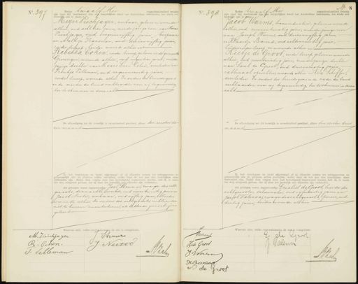 No. 397 Heden twaalf Mei negentienhonderd twintig huwelijk aan te gaan; zijn voor mij Ambtenaar van den burgerlijken stand van Amsterdam verschenen, ten einde een Meyer Vischjager, werkman, geboren en wonende alhier, oud achttien jaren, minderjarige zoon van Mozes Vischjager, oud negenenvijftig jaren - koopman en Aaltje Fransman, oud drieenvyftig jaren, zonder beroep, beiden wonende alhier en Rebekka bohen, zonder beroep, geboren in de gemeente Groningen, wonende alhier, oud negentien jaren, minder„ jarige dochter van Moses Levi bohen, overleden en Froukje Velleman, oud negenenveertig jaren, zonder beroep, wonende alhier. De ouders des bruidegoms en de moeder der bruid verklaarden, voor mij tegenwoordig toe te stemmen in dezen echt De afkondiging tot dit huwelijk is onverhinderd geschied, alhier den eersten de- zer maand- Ik heb bruidegom en bruid afgevraagd of zij elkander nemen tot echtgenooten en getrouwelijk alle de plichten zullen vervullen, welke door de wet aan den huwelijken staat verbonden zijn. Nadat deze vragen door hen bevestigend beantwoord werden, heb ik, in naam der wet, uitspraak gedaan, dat zij door het huwelijk aan elkander zijn verbonden. Als getuigen waren tegenwoordig: Joel Stouwer, zwager des echt- genoots, diamantbe werker, oud vierentwintig jaren en Jacob Neeter, werkman, oud vijftig jaren, beiden wonende alhier, De ouders des echtgenoots verklaarden niet te kunnen naamteekenen, als hebbende geenschrijven geleerd No. 398. Heden twaalf Mei N zijn voor mij Ambtenaar van den burgerlijken stand van Amsterdam verschenen, ten einde een buwelijk aan te gaan Jacob Vurms, humconducteur, geboren en wonende alhier, oud zevenentwintig jaren, meerderjarige zoon van Joseph Hurms, oud drieenvijftig jaren, en Klaartje Barend, oud achtenveertig jaren, beidenzonder beroep, en wonende alhier en - Reetje de Groot, zonder beroep, geboren en wonende alhier oud zesentwintig jaren, meerderjarige dochter van Saul de Groot, oud drieenzestig jaren rabbinaal opzichter, wonende alhier en iva scheffer„ overleden. De ouders des bruidegoms en de vader der bruid verklaarden, voor mij tegenwoordig, toe testemmen in deze echt- De afkondiging tot dit huwelijk is onverhinderd geschied, alhier den eersten deze maand. Ik heb bruidegom en bruid afgevraagd of zij elkander nemen tot echtgenooten en getrouwelijk alle de plichten zullen vervullen, welke door de wet aan den huwelijken staan verbonden zijn. Nadat deze vragen door hen bevestigend beantwoord werden, heb ik, in naar der wet, uitspraak gedaan, dat zij door het huwelijk aan elkander zijn verbonden. Als getuigen waren tegenwoordig: zechiel de Groot, broeder der echtgenoote, schoenmaker, oud vijfendertig jaren en Jacob Valensa, zwager des echtgenoots, perser, oud dertig jaren, beiden wonende alhier Waarvan akte, welke overeenkomstig de wet is voorgelezen. J. Stonner M. Vischjager J: Neerer R. Cohen. AZake F: Velleman Waarvan akte, welke overeenkomstig de wet is voorgelezen. Ivin v de Groot Valensa H de Groot. J Warn BZake d Barend a de Groot